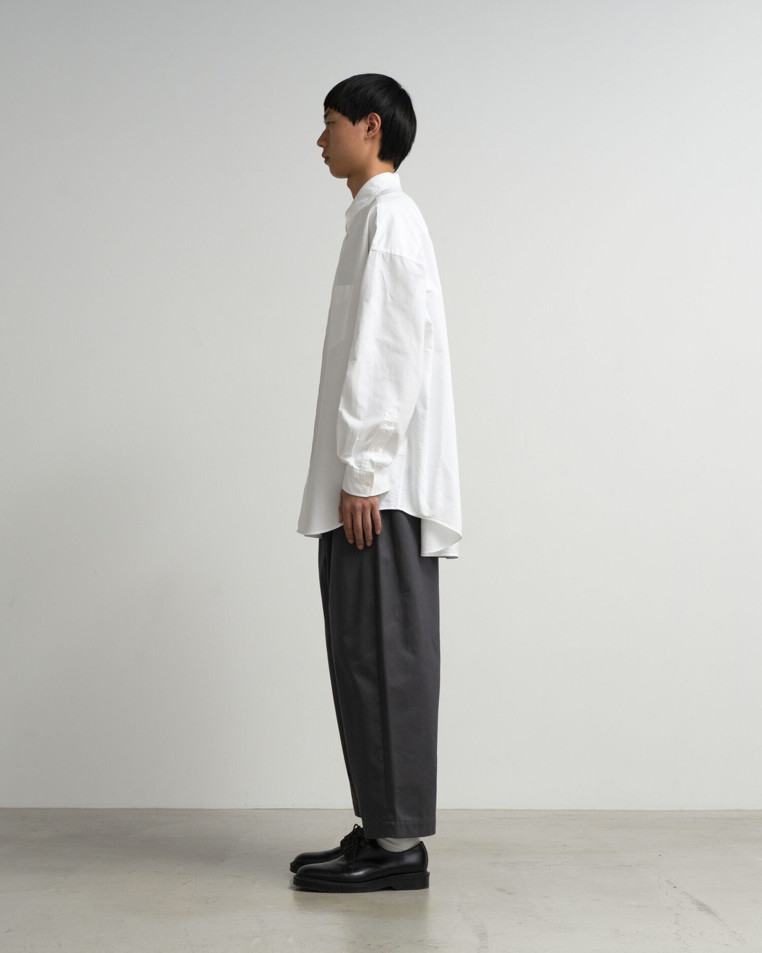 『80年代のポロ ラルフ ローレンのビッグB.Dというのがあって、かなり大きかったんだけど、それが好きで。ただ襟の形はブルックス ブラザーズの方が好み、でも胸元にマークがあるのは嫌いなんで、それはやめて。だから襟や袖の感じはブルックス、身幅は昔のラルフをベースに、昔ながらのアメリカっぽい厚手のオックスフォード生地を使って、オーバーサイズで大きめにB.Dを着てもらえるように作ってます。昔、ラルフ ローレンの古着でバンドカラーのB.Dがあったんだけど、バンドカラーってことは B.Dじゃないじゃん。それがヤバイと思って、ツッコミどころ満載のバンドカラーをあえて再現してみました。シルエットは全体的にでかいわけではなく、ネック周りは標準サイズなので、ボタンを締めても決まる。オーバーサイズは僕が着てOKではなく、痩せている人が着た時にどう見えるかが重要』