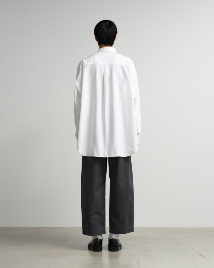 太めの綿糸を使用し肉厚に仕上げたオックスフォード生地。肩の傾斜や低く下げられたヨークの位置、アームホールの広さなど、細かなディテールを特異なバランスで仕上げたオーバーサイズシルエットが特徴のボタンダウンシャツ。風合いはそのままにより奥行きのある色合いに仕上がっている。