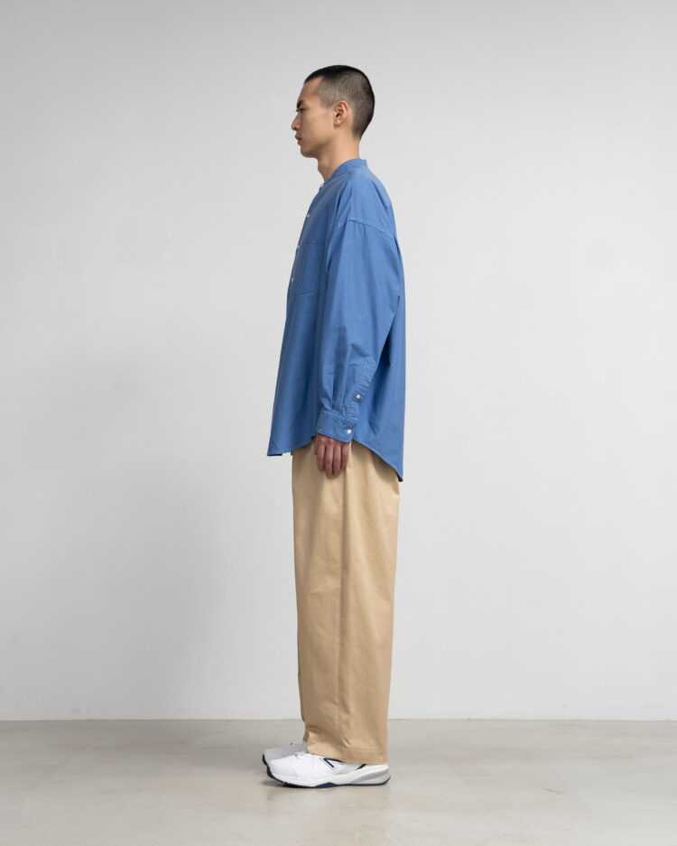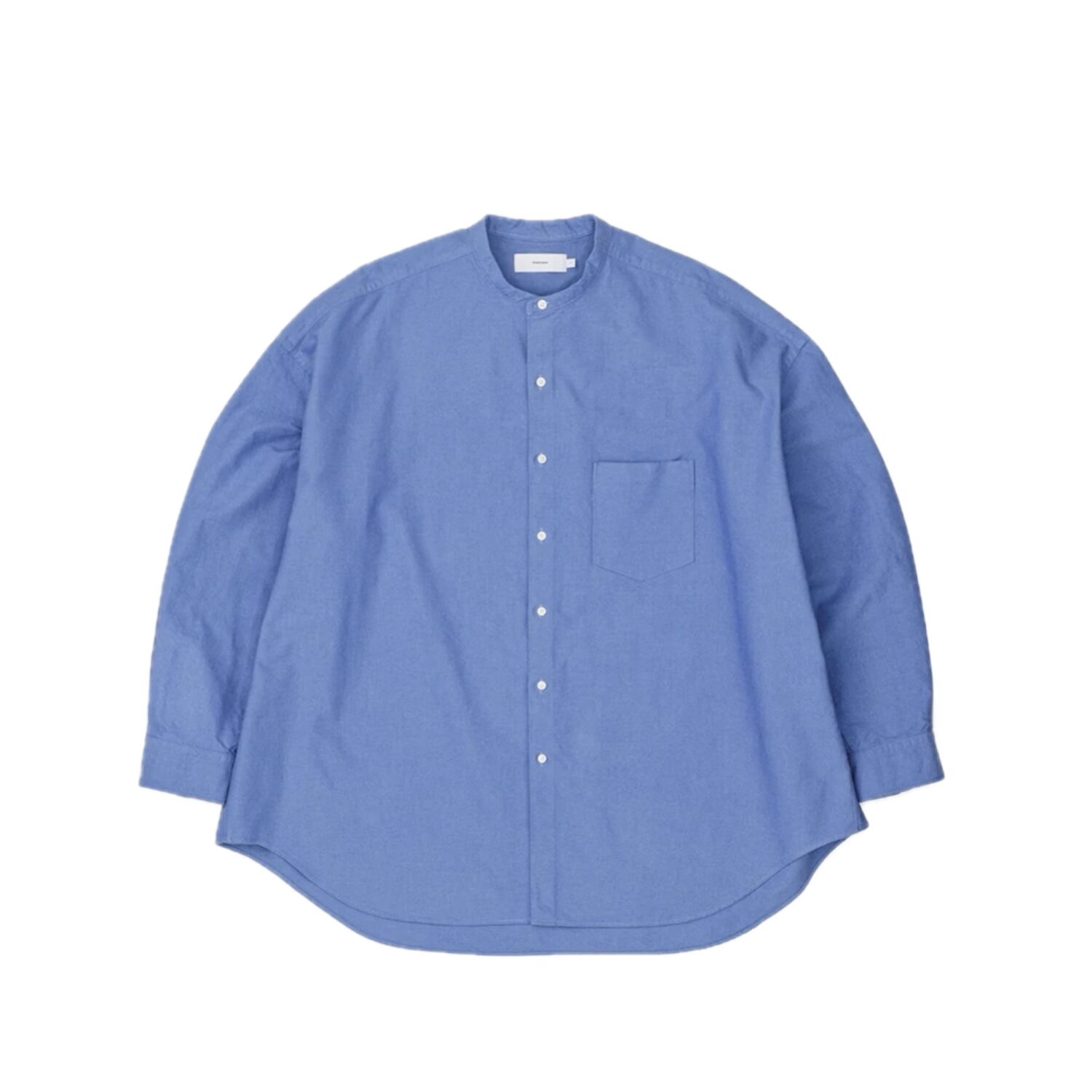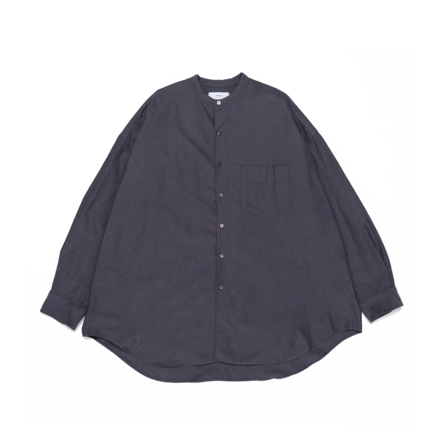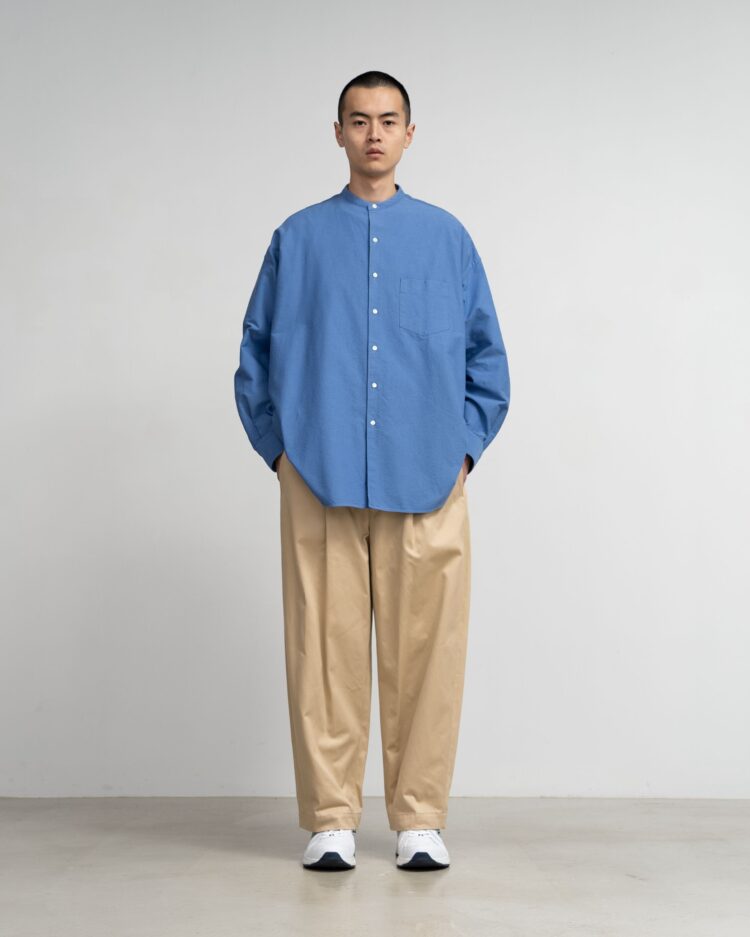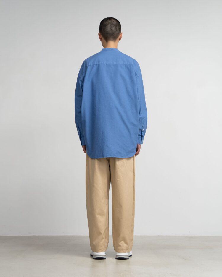 肩の傾斜や低く下げられたヨークの位置、アームホールの広さなど、細かなディテールを特異なバランスで仕上げたモデルのオーバーサイズのバンドカラーシャツ。太めの綿糸を使用し肉厚に仕上げたオックスフォード生地を使用。