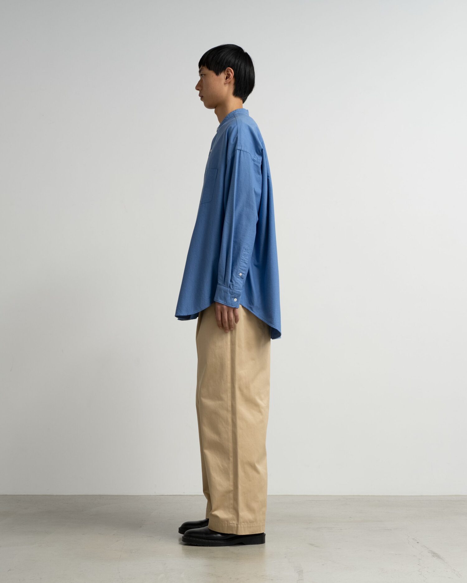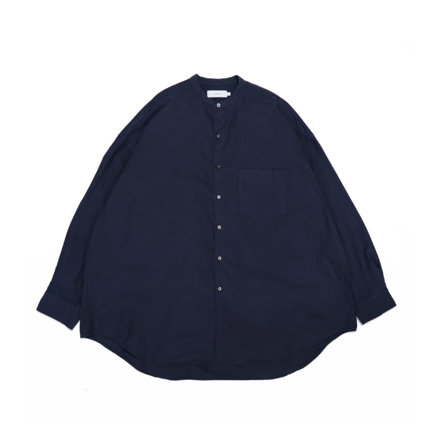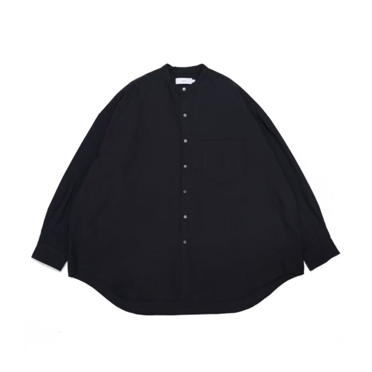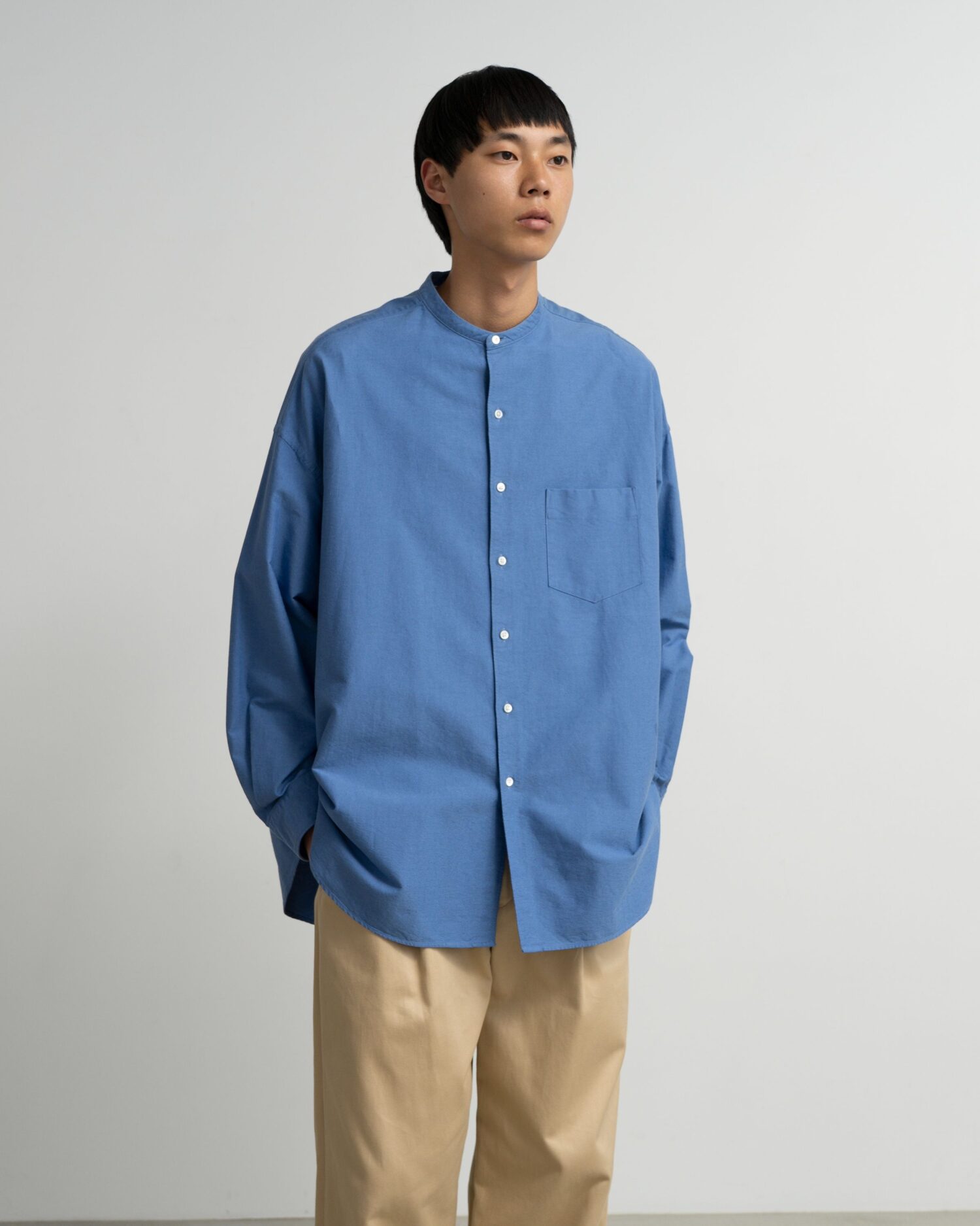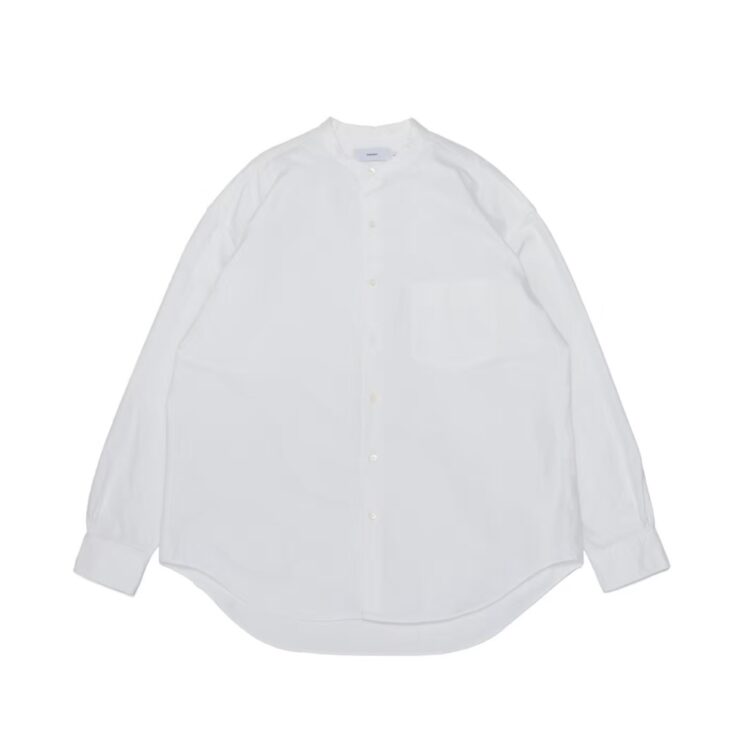 肩の傾斜や低く下げられたヨークの位置、アームホールの広さなど、細かなディテールを特異なバランスで仕上げたモデルのオーバーサイズのバンドカラーシャツ。太めの綿糸を使用し肉厚に仕上げたオックスフォード生地を使用。