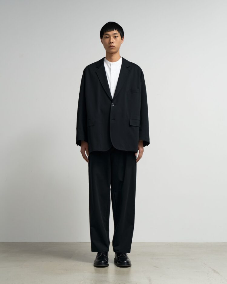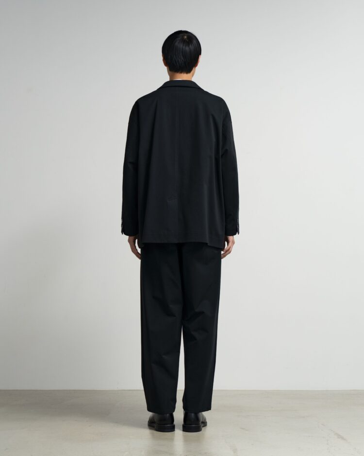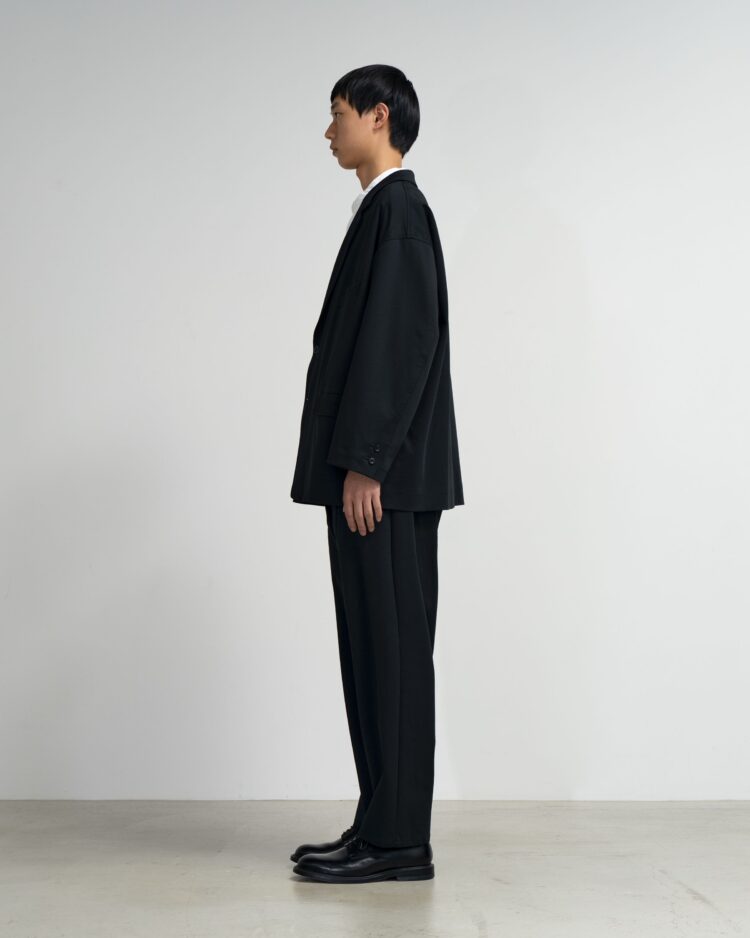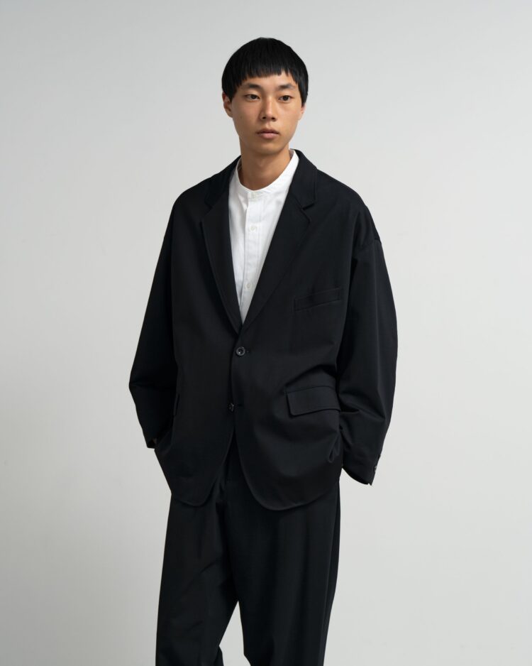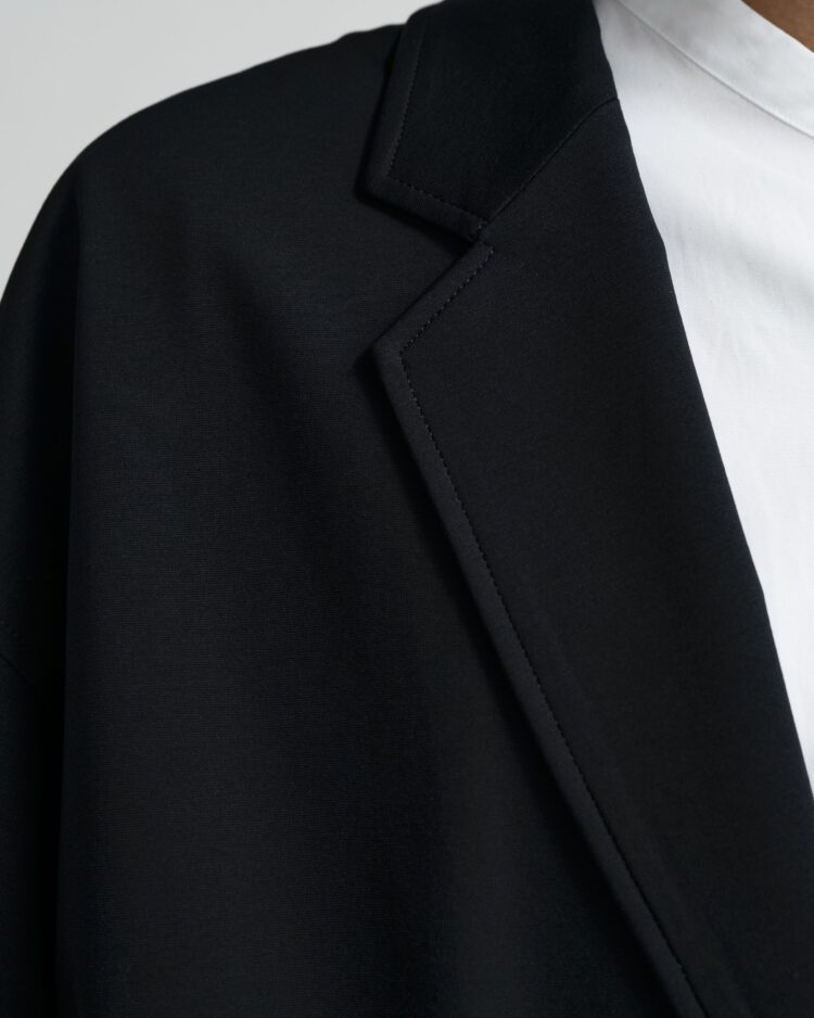 ハイゲージの編機で製作した光沢感とハリ感のあるオリジナルのポンチ素材。ドロップショルダーでボリュームのあるシルエットのジャケット。動きやすくアクティブなスーチングスタイルが楽しめる。