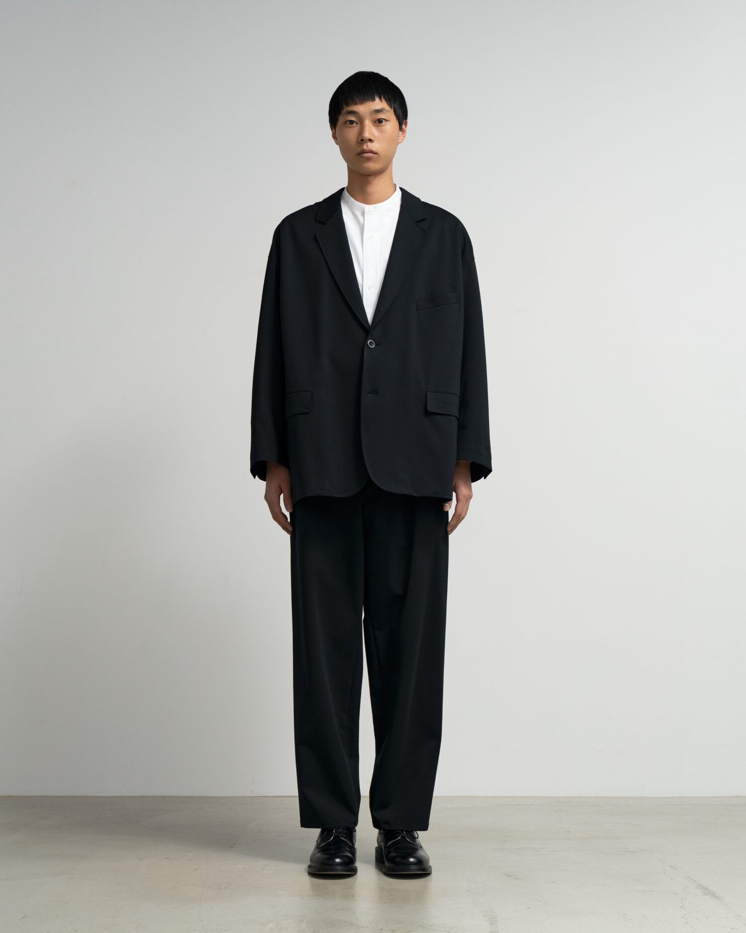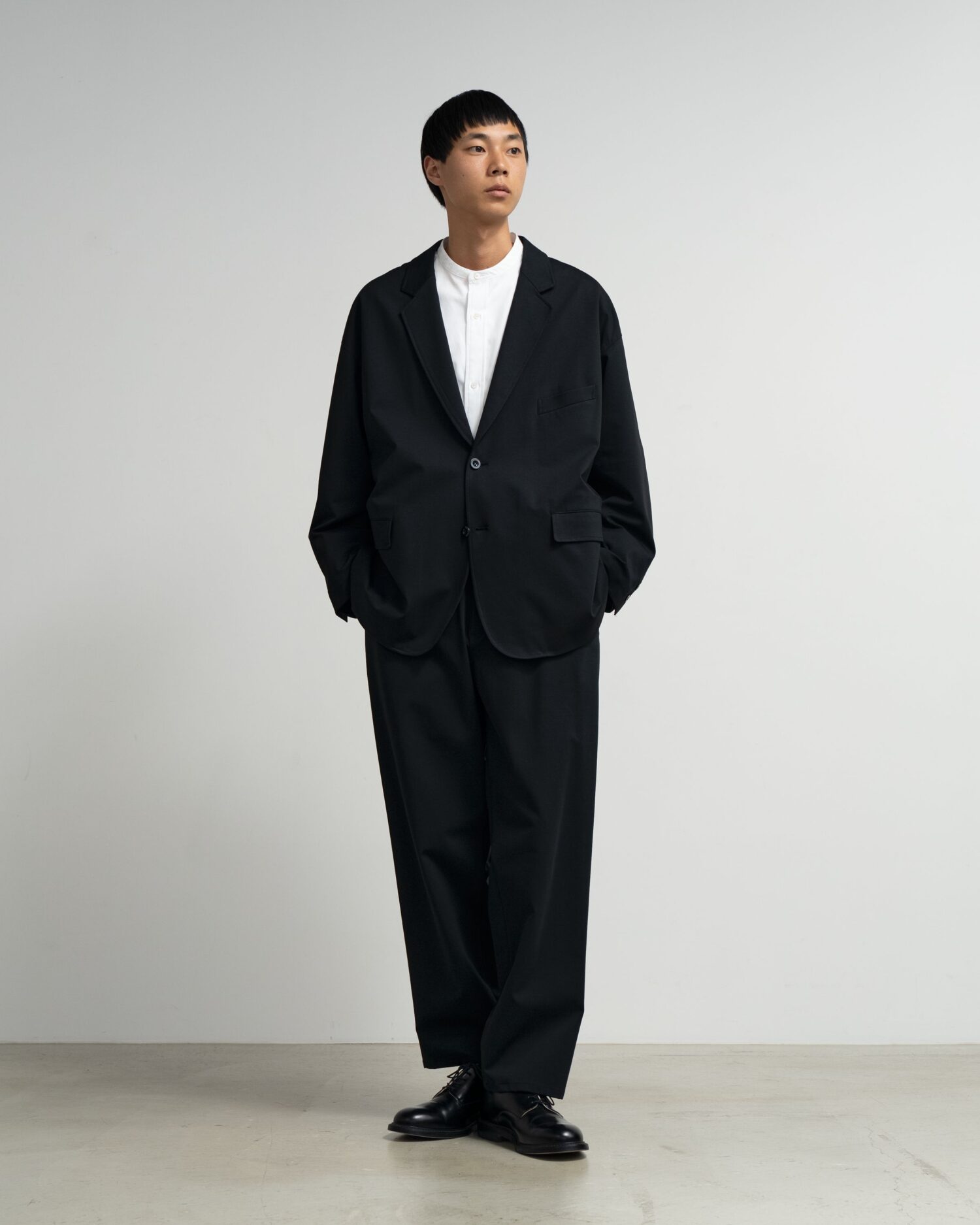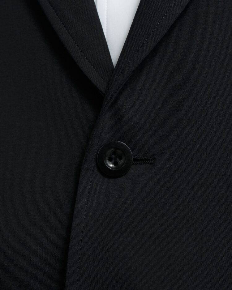 ハイゲージの編機で製作した光沢感とハリ感のあるオリジナルのポンチ素材。ドロップショルダーでボリュームのあるシルエットのジャケット。動きやすくアクティブなスーチングスタイルが楽しめる。