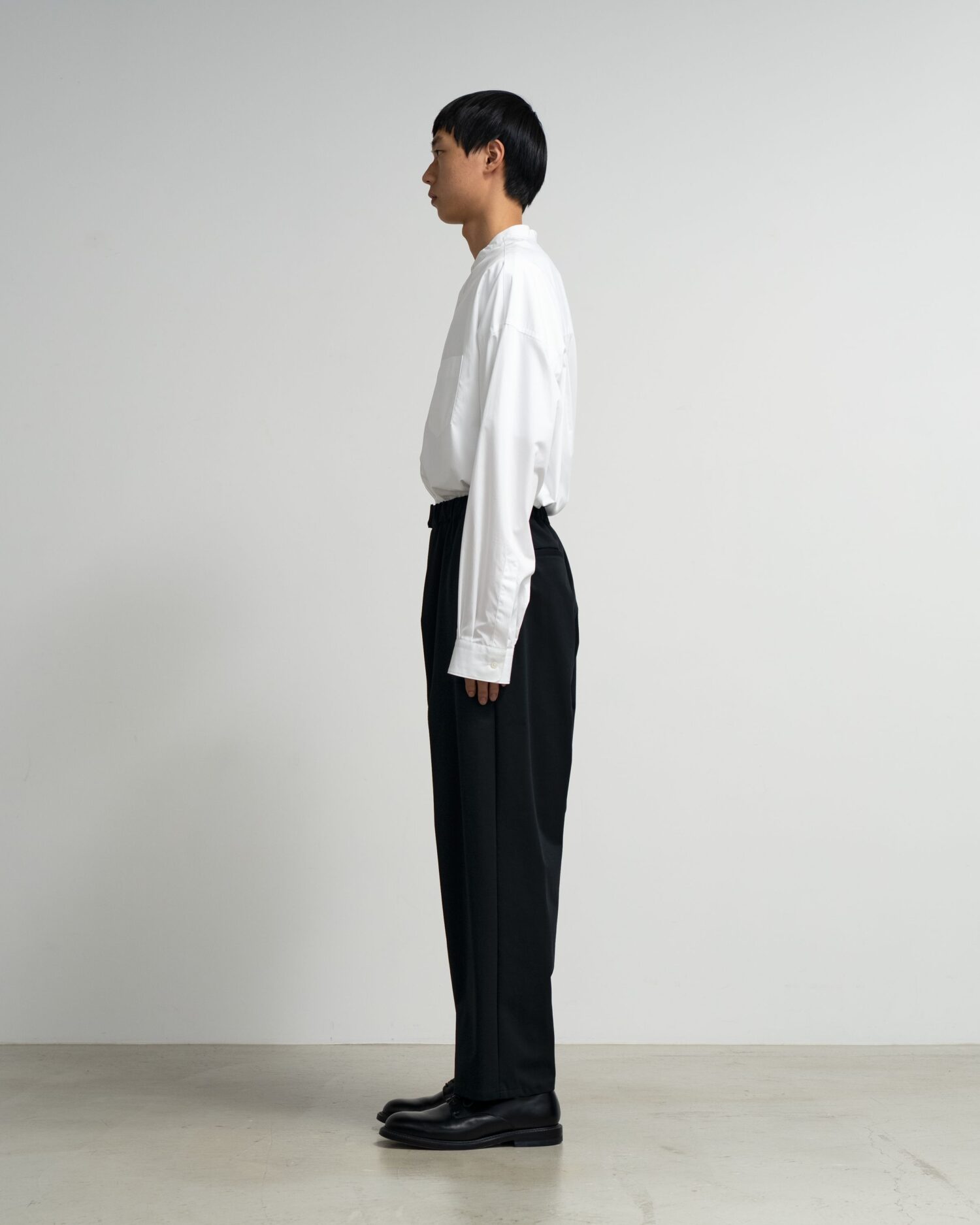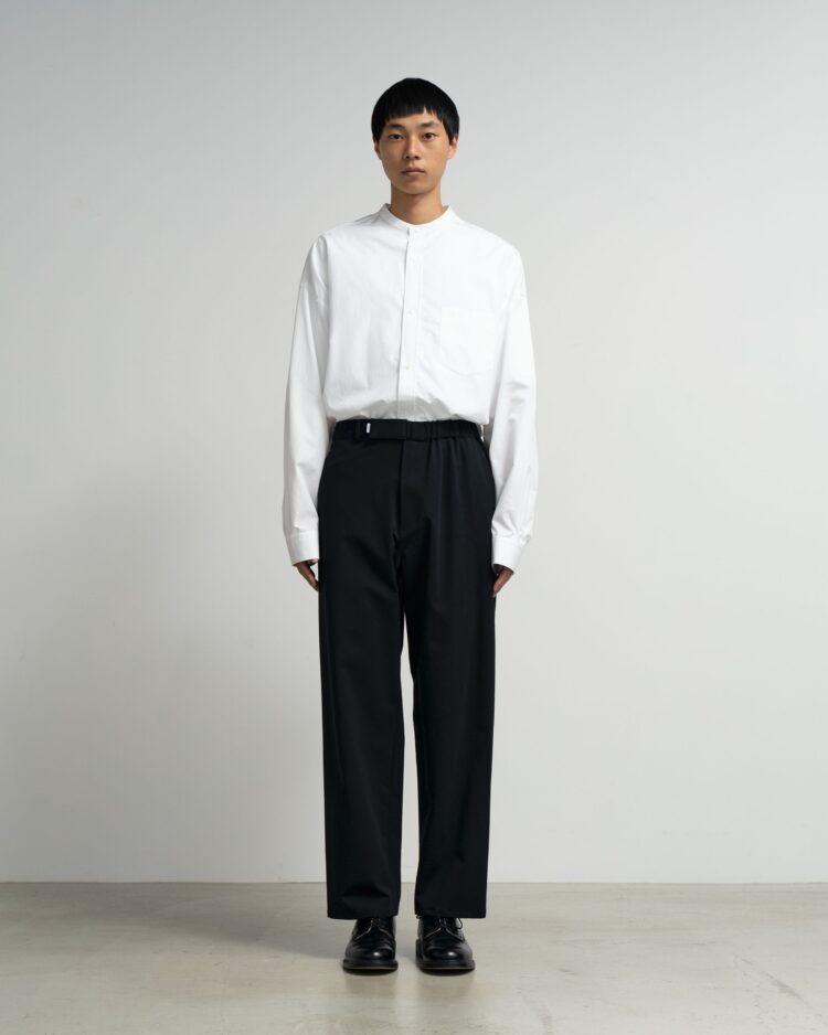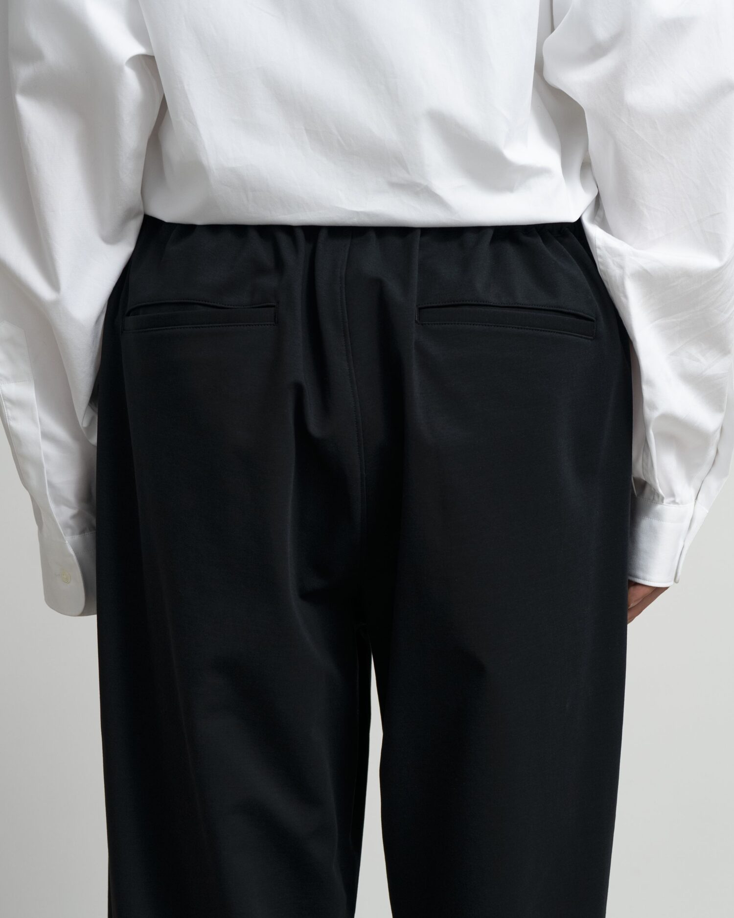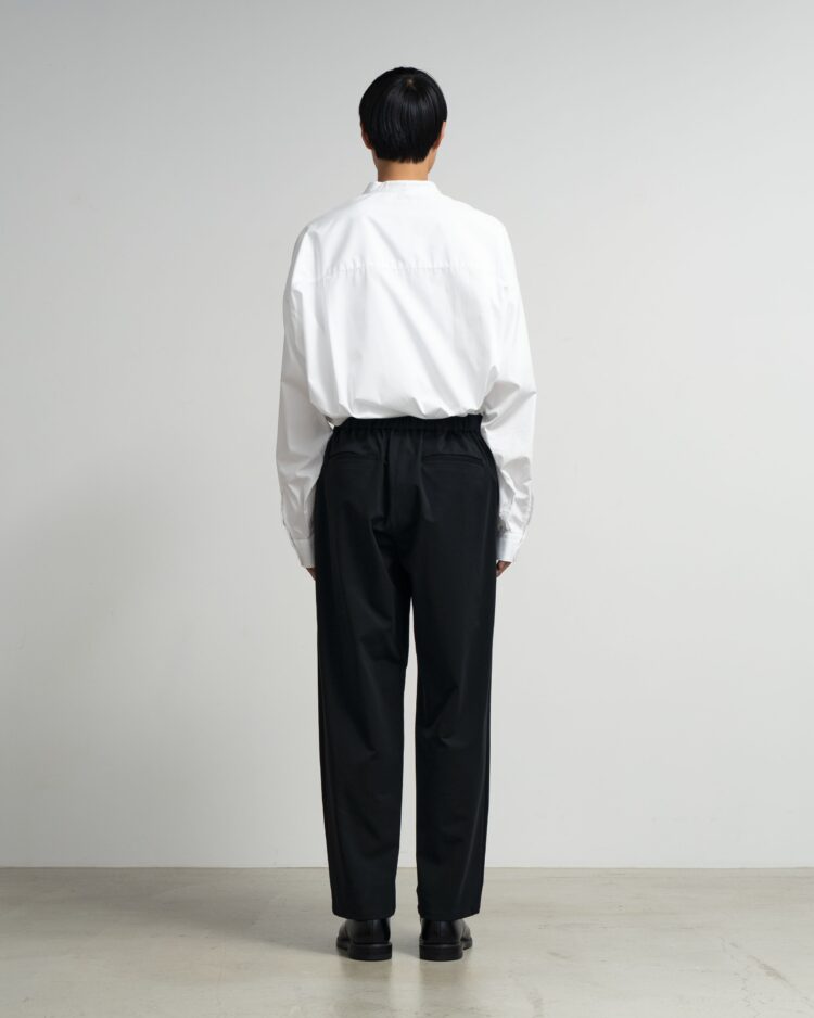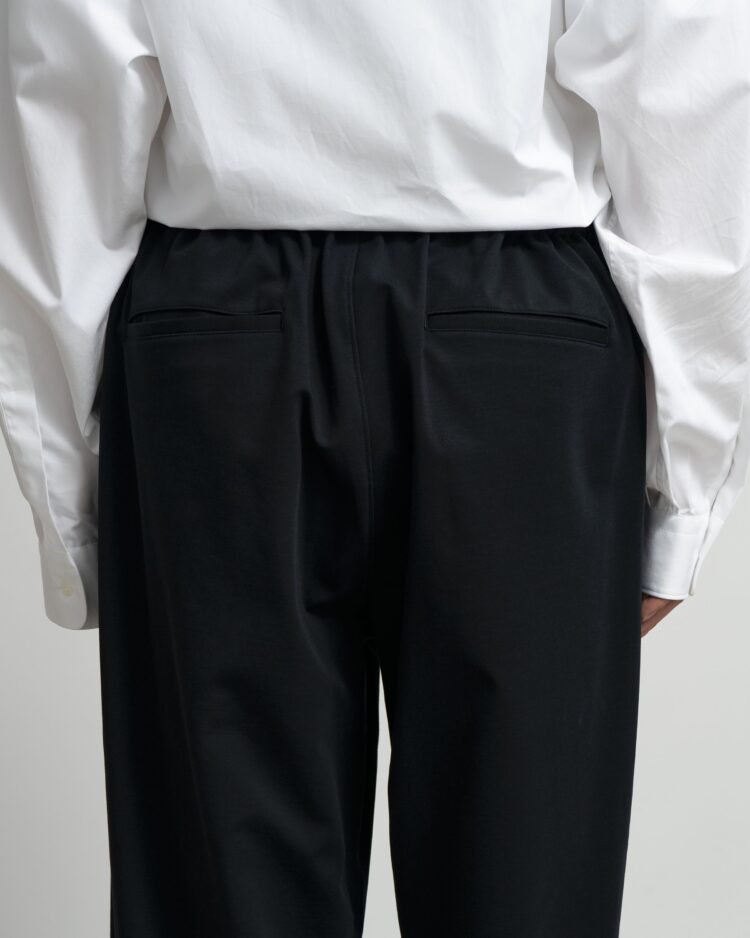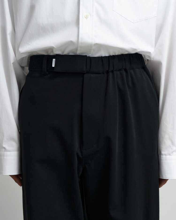 ハイゲージの編機で製作した光沢感とハリ感のあるオリジナルのポンチ素材。ウエストのサイズを簡単に調整できてシルエットもアレンジできるGraphpaper定番のシェフパンツ。裾幅を広げたワイドテーパードシルエット。