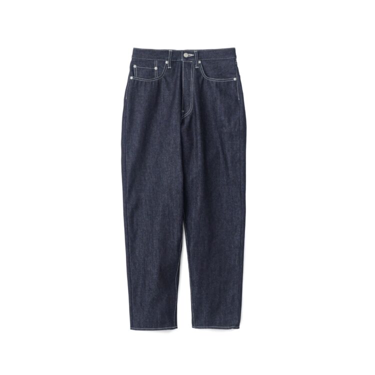 130年もの歴史を誇る米国Cone Denim社が作る13.75オンスのセルビッチデニム。今シーズンよりブラックデニムが仲間入り。デニム生地に最も適した原綿をブレンドし、独自のノウハウで紡ぎ、濃色のピュアインディゴで染色された縦糸は鮮やかで自然なタテ落ちを表現する。旧式力織機でゆっくりと織り上げることで生まれる、生地表面のざらっとした凹凸やムラがデニム本来の風合いを感じさせる魅力的な素材。ゆったりとした腿回りから、裾にかけて緩やかにテーパードさせたリラックスフィットのファイブポケットパンツ。ロゴの刻印入りのタックボタンを配し、クリーンなヌメ革のパッチがウエストを飾る。長く履き込むことで味わい深く、美しく色褪せていくリジッドタイプ。