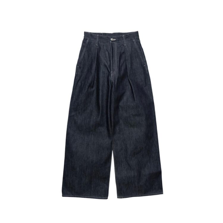 130年もの歴史を誇る米国Cone Denim社が作る13.75オンスのセルビッチデニム。今シーズンよりブラックデニムが仲間入り。デニム生地に最も適した原綿をブレンドし、独自のノウハウで紡ぎ、濃色のピュアインディゴで染色された縦糸は鮮やかで自然なタテ落ちを表現する。旧式力織機でゆっくりと織り上げることで生まれる、生地表面のざらっとした凹凸やムラがデニム本来の風合いを感じさせる魅力的な素材。腰まわりをスッキリと見せるハイウエスト設計のワイドストレートデニム。裾に向かってまっすぐ落ちる深めのタックが上品な印象を与える。長く着込むことで味わい深く、美しく色褪せていくリジットタイプ。