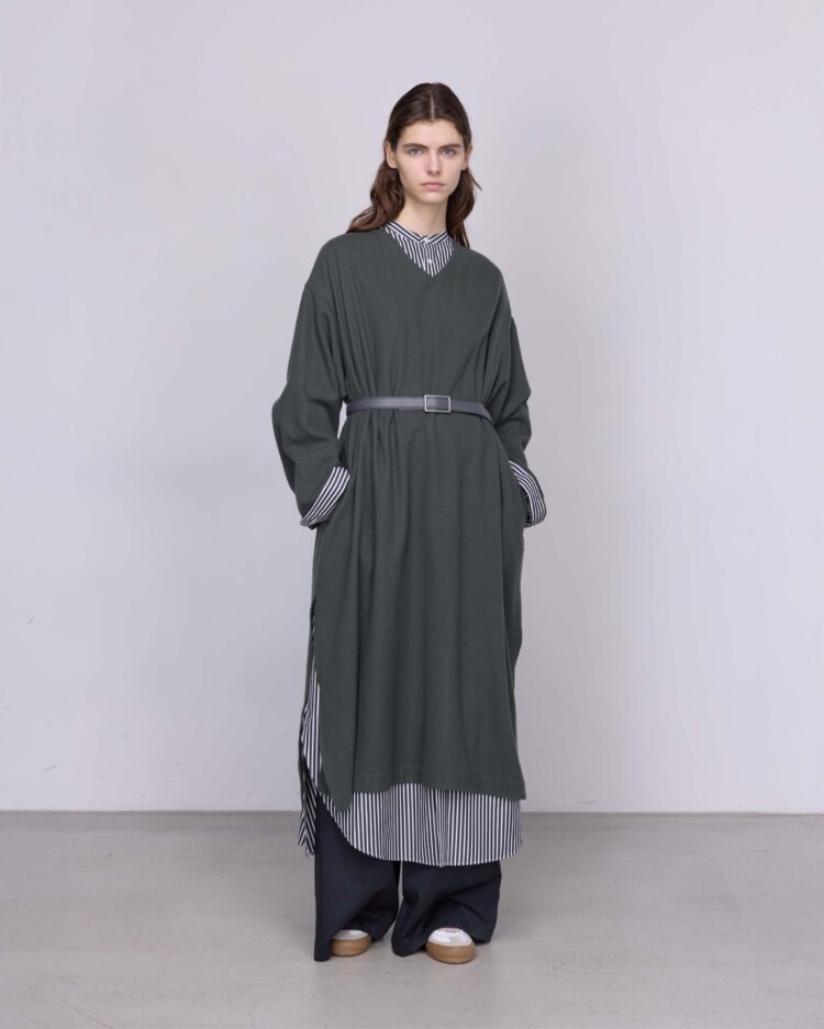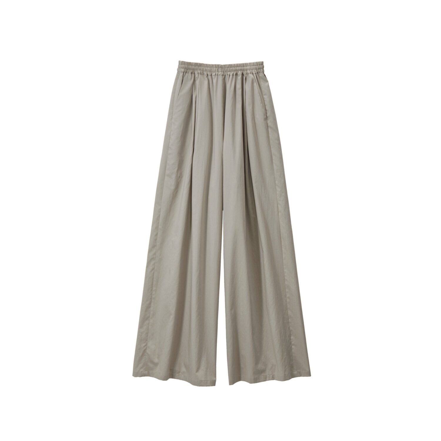 超長綿で織りあげた平織り生地にシリコンを原料にした特殊脂を含浸することで生地に反発感とハリ感を持たせ、さらにバイオ加工を合わせることで滑らかで柔らかい風合いを表現した素材。綿100%と思えないシルクのような質感が特徴。深い2タックでフロントにボリュームを持たせた2タックワイドパンツ。たっぷりと使用した表生地が歩くたびに美しく揺れる。