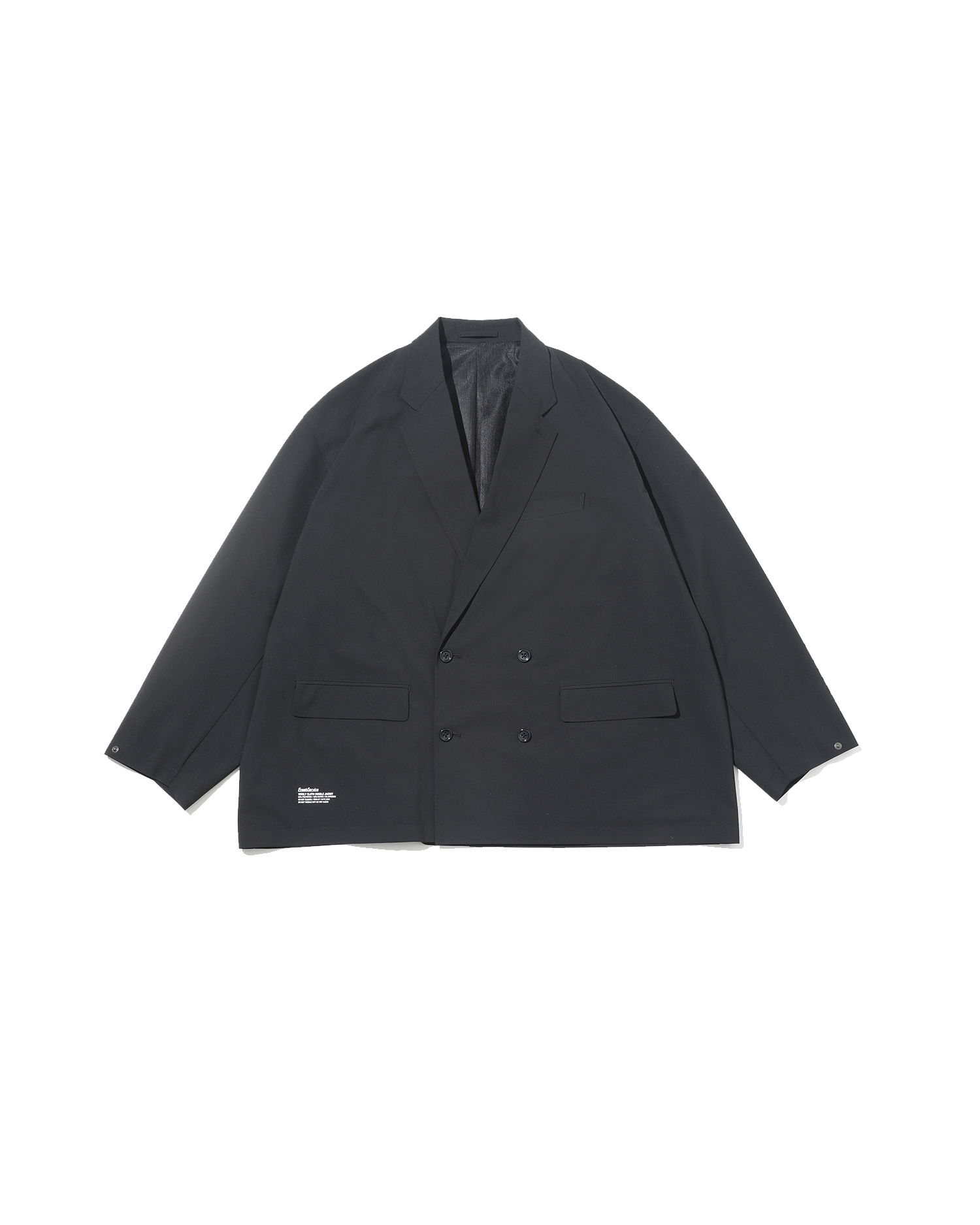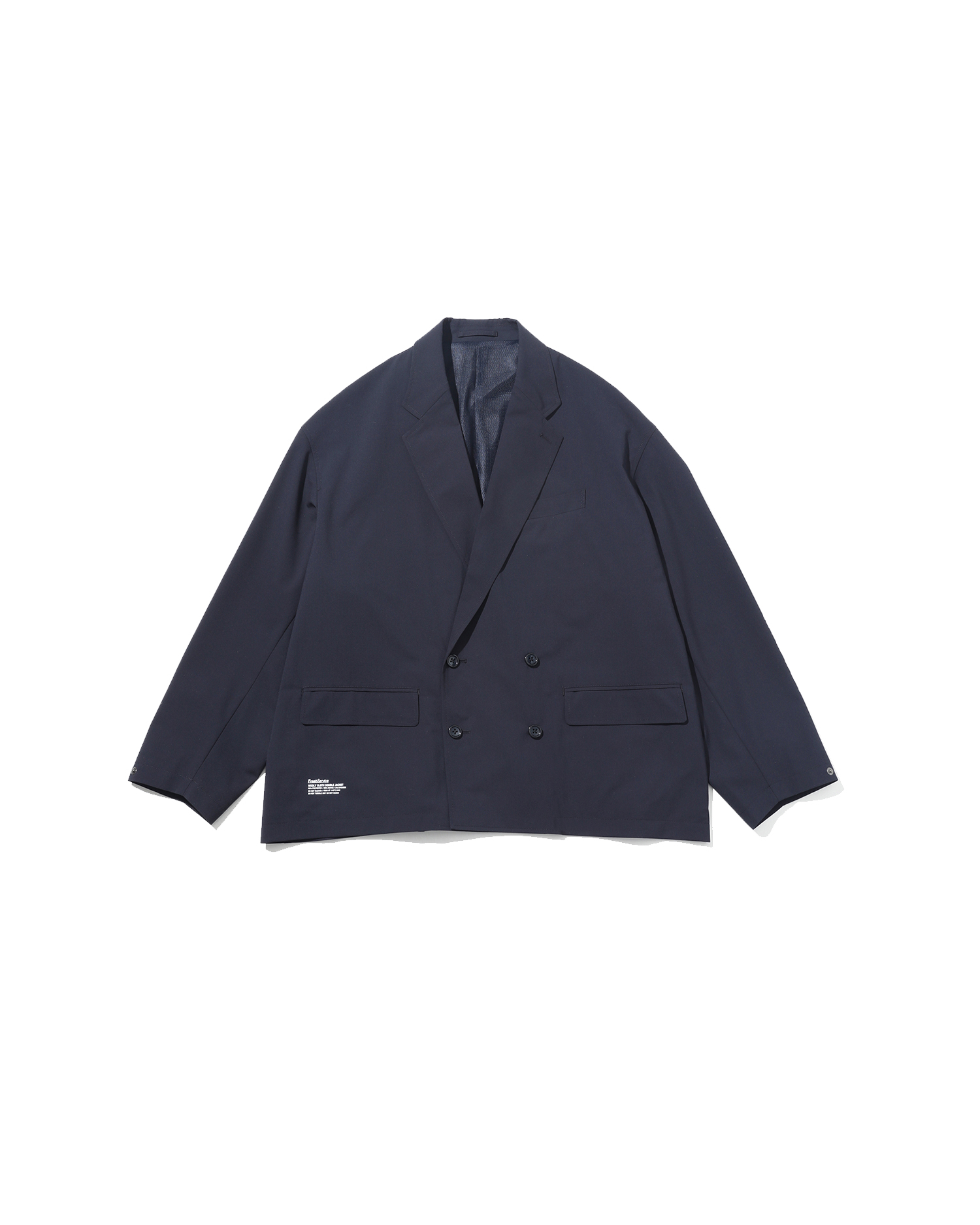 ウールのような表情のポリエステル生地で製作したボリュームのあるシルエットのダブルのジャケット。