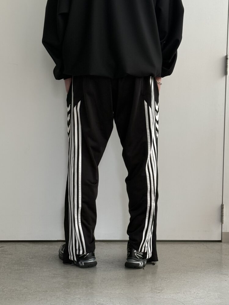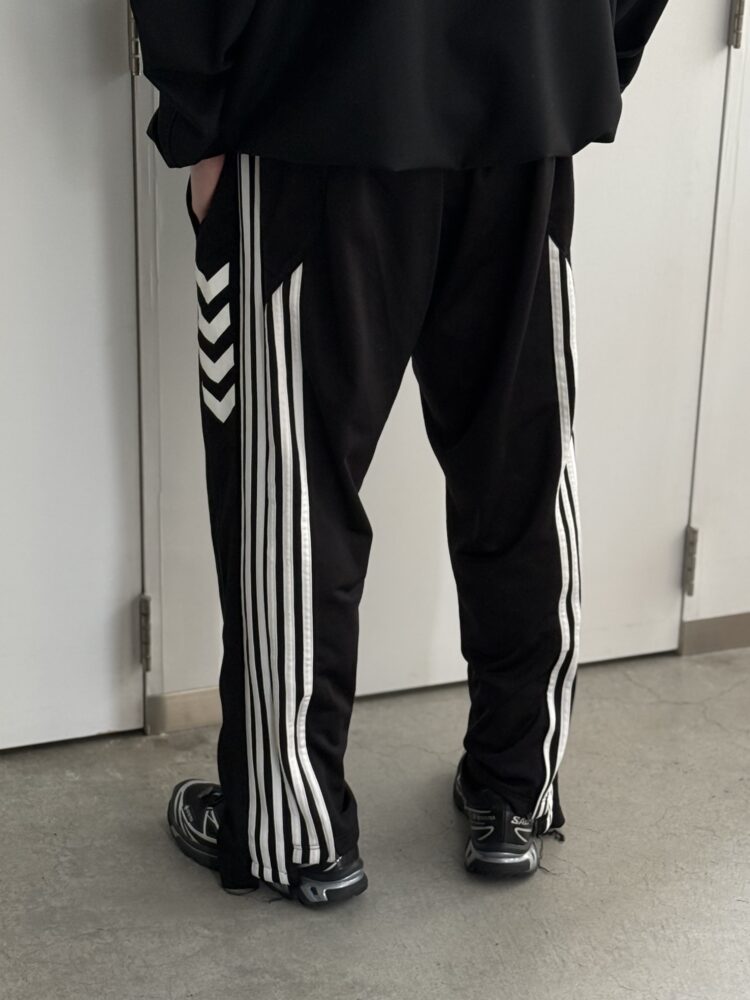 ヴィンテージのトラックパンツを2本以上使用して製作されたドッキングワイドトラックパンツ。 本来タイトなつくりのトラックパンツを股上やワタリを広くとり、オーバーサイズで着用いただけます。 素材はアソートとなります。