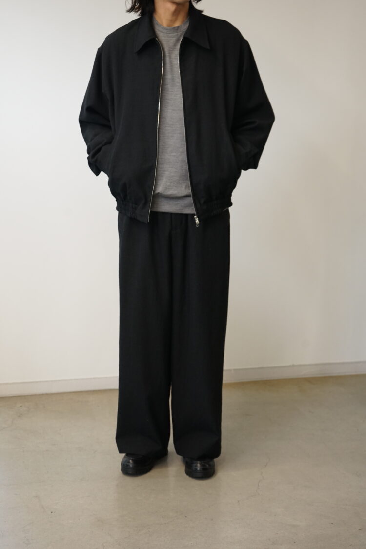 TUMBLED WOOL SERGE,100% WOOL ソフトな風合いと、表面の毛羽感や細かな凹凸が特徴のウールサージ。 生地の仕上げにかけたワッシャータンブラー加工で程よいカジュアル感を表現しました。 シャンブレーブラックは経糸が黒、緯糸がトップダークチャコールを使用し、白い横筋が見える特徴的な色味。 ヘリンボーンは柄が主張しすぎないように色味を工夫することで、遠めから見ると無地のミディアムグレーに見える奥深い色合いです。