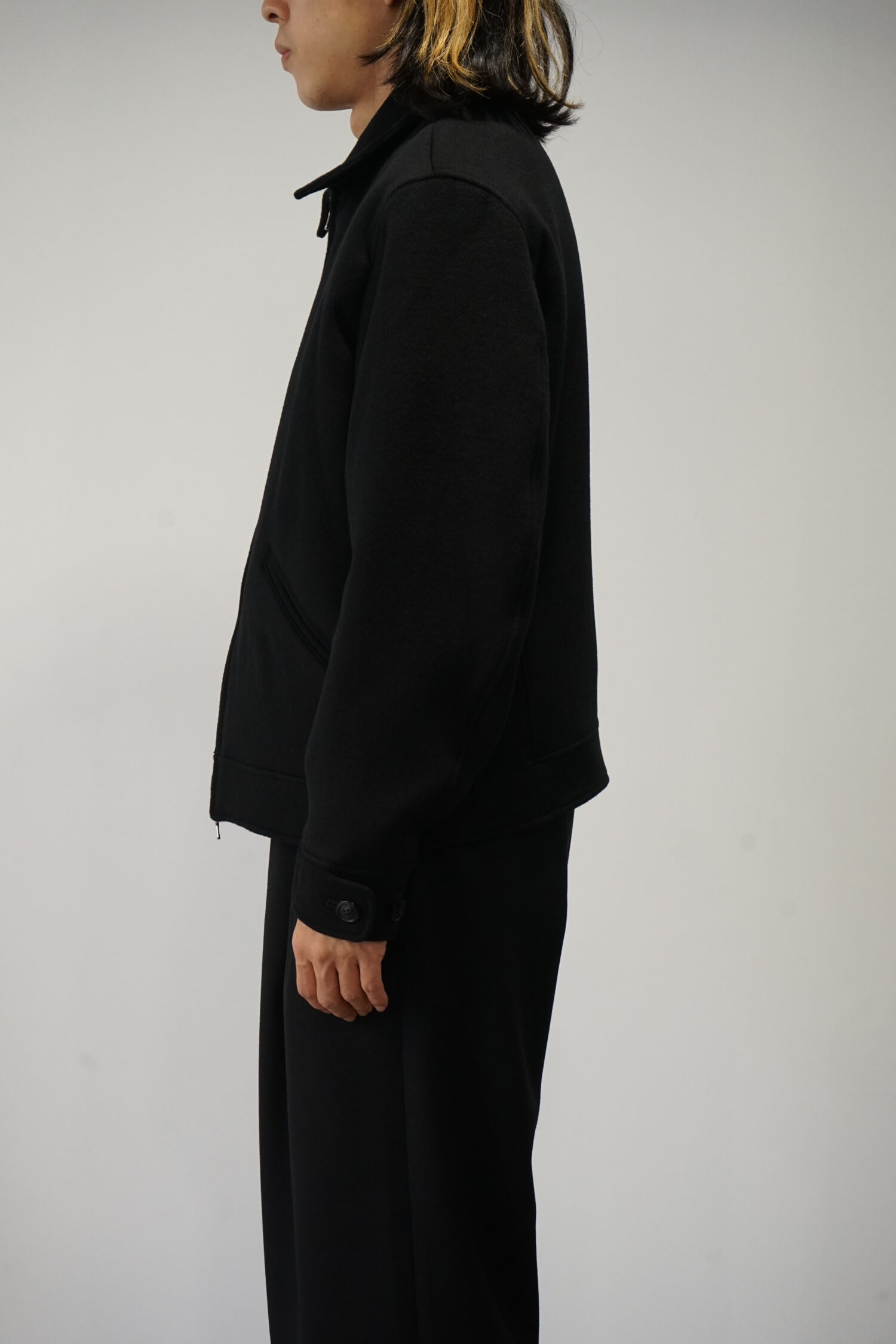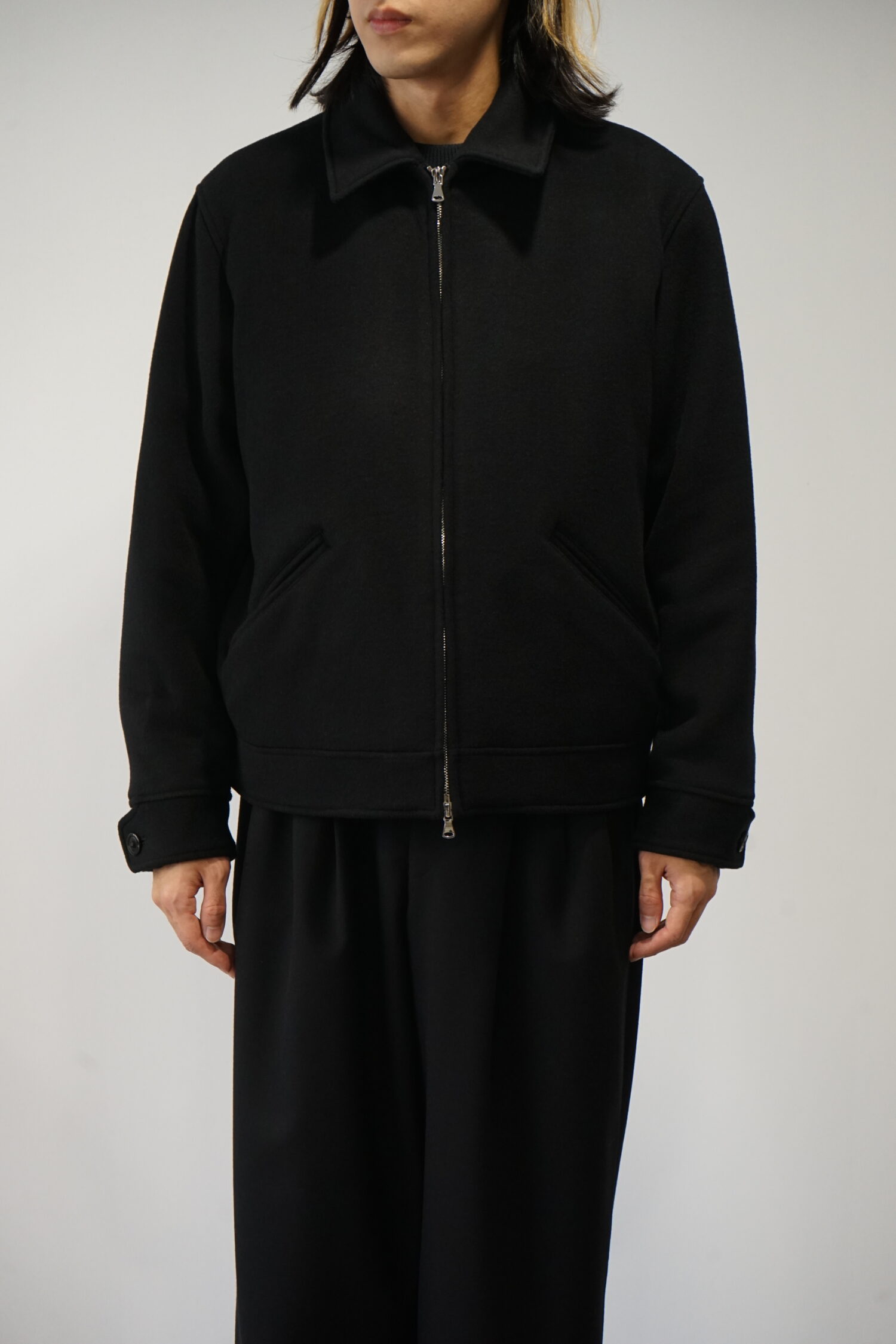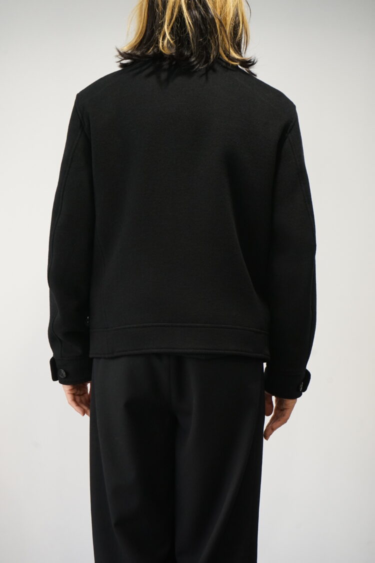鏡面仕上げのジッパーをアクセントに、両玉縁ポケットや内ポケットを左右に備え、袖口はカフス仕様でボタンにより調整できるなど、ディテールにもこだわりが光ります。
