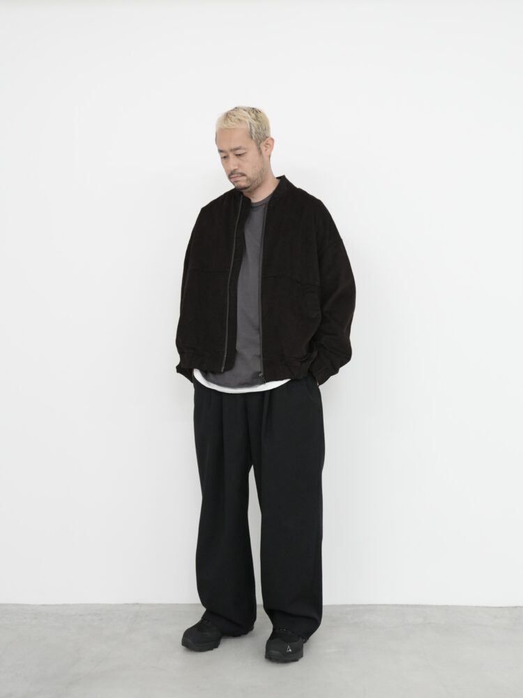 コットンとリヨセルをバランスよくブレンドした生地を使用。なめらかで通気性に優れ、程よいドレープ感を備えています。肌あたりは柔らかく、それでいて形を保つ安定感も兼ね備え、自然な快適性と穏やかな構造美を両立。さらに洗い加工を施すことで一層ソフトに仕上げられ、着用を重ねるごとに豊かな表情へと変化していきます。