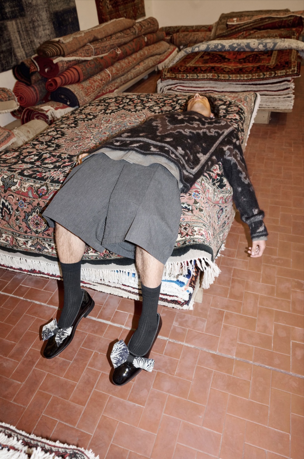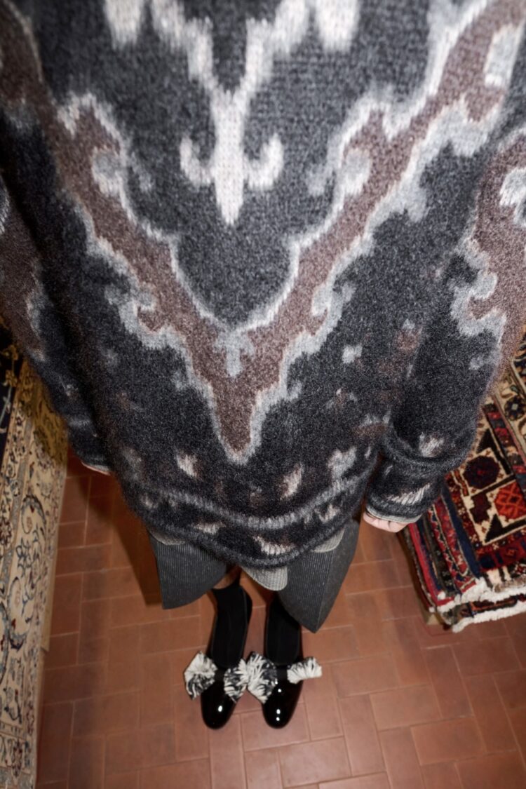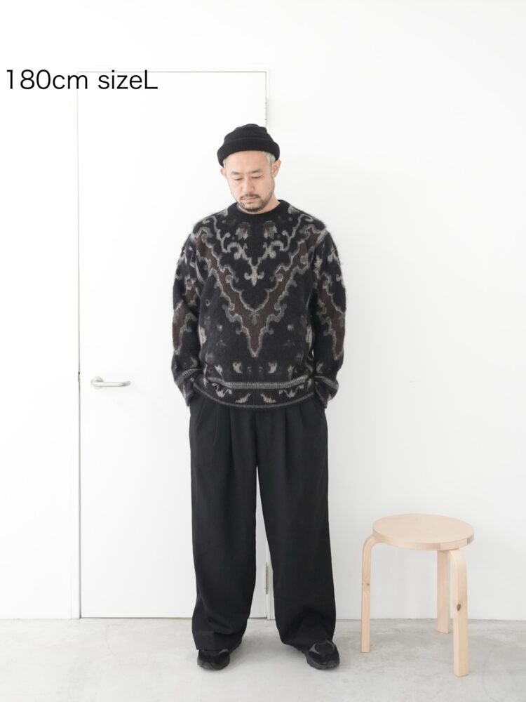 カシミヤとモヘヤ素材をベースにブレントした生地を使用したニットウェア。カーペット柄。