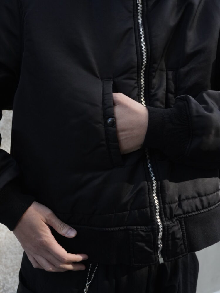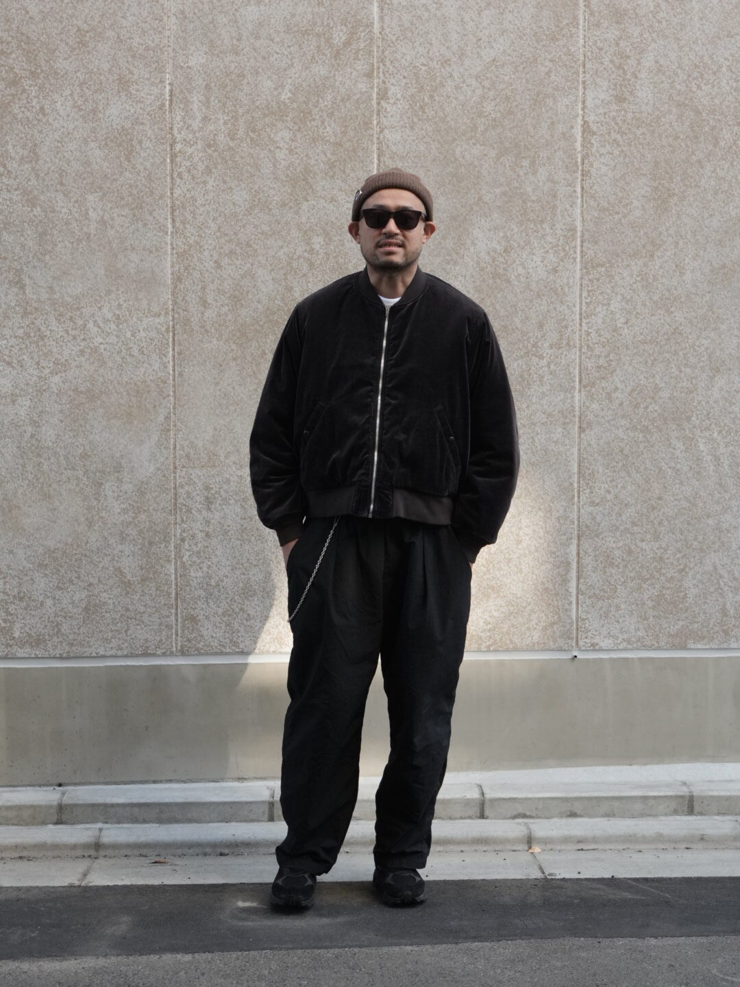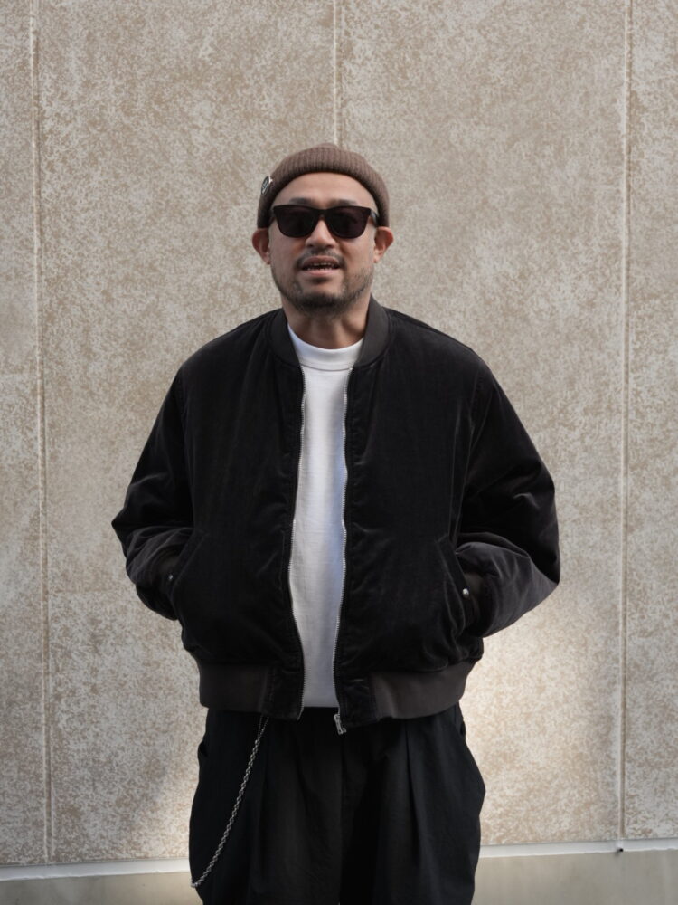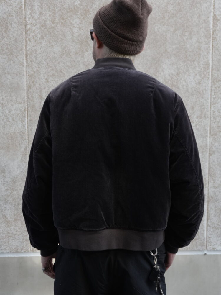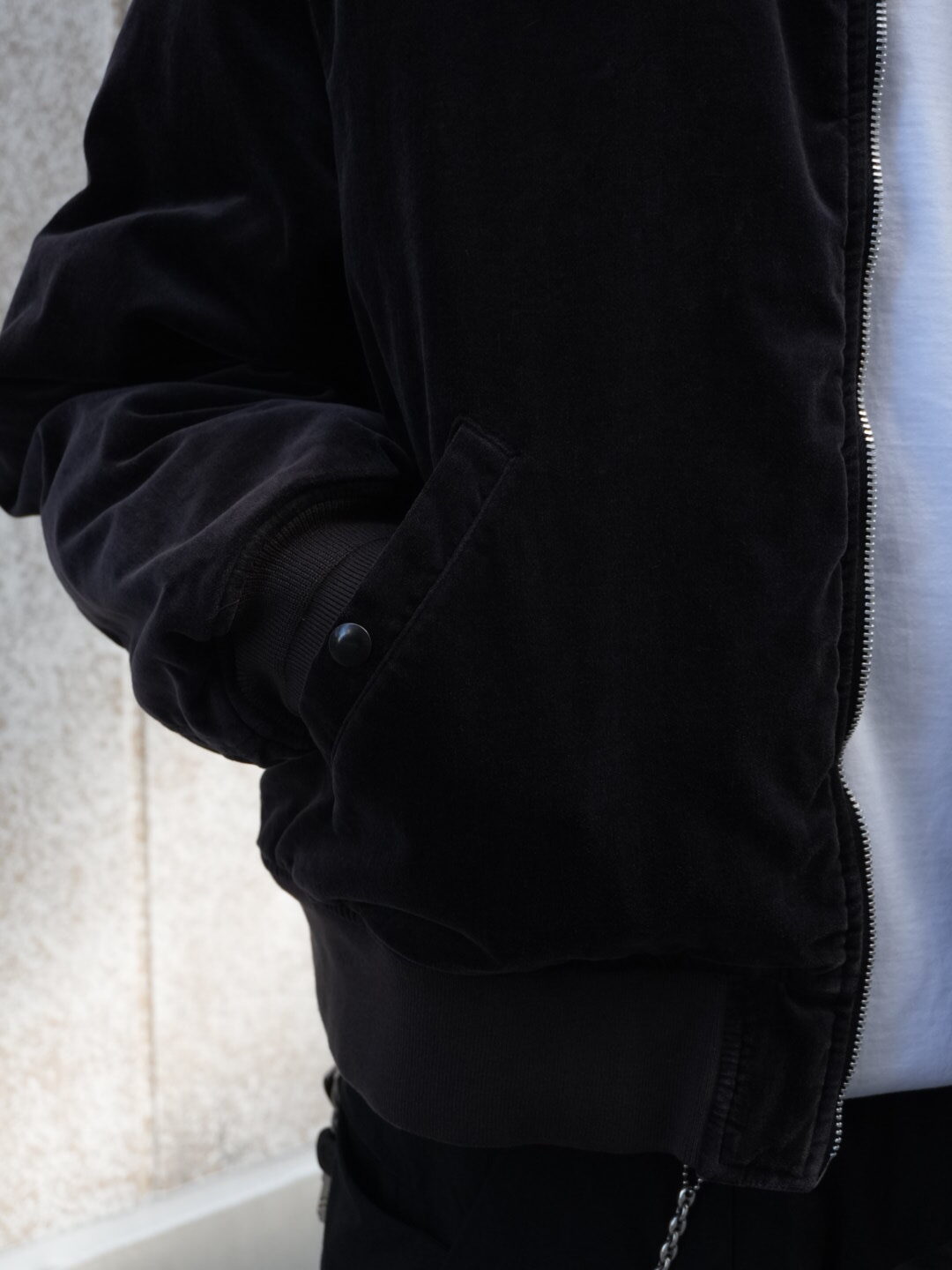 特徴的なA面はMA-1デザインでありながらもベロア素材を採用、B面はMA-1の裏地を活かしつつ、サイドにハンドウォーマーポケットを追加し、両面着用を可能にしました。