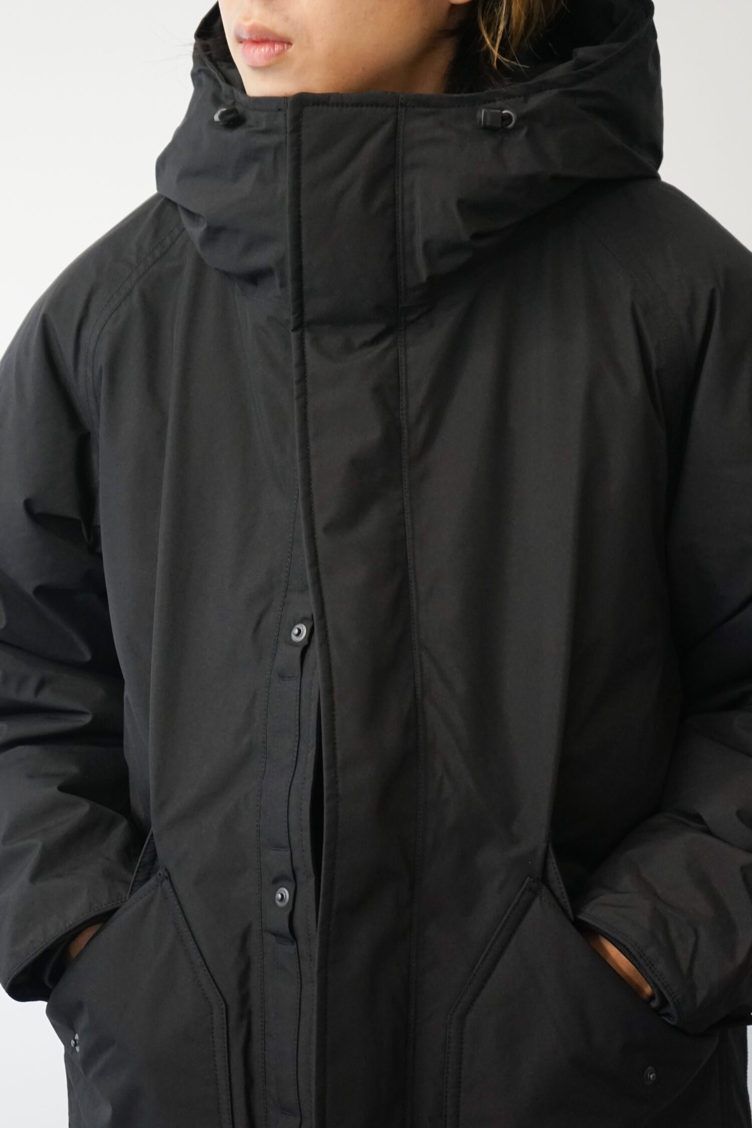 ・ミドル丈のフーデッドダウンコート。