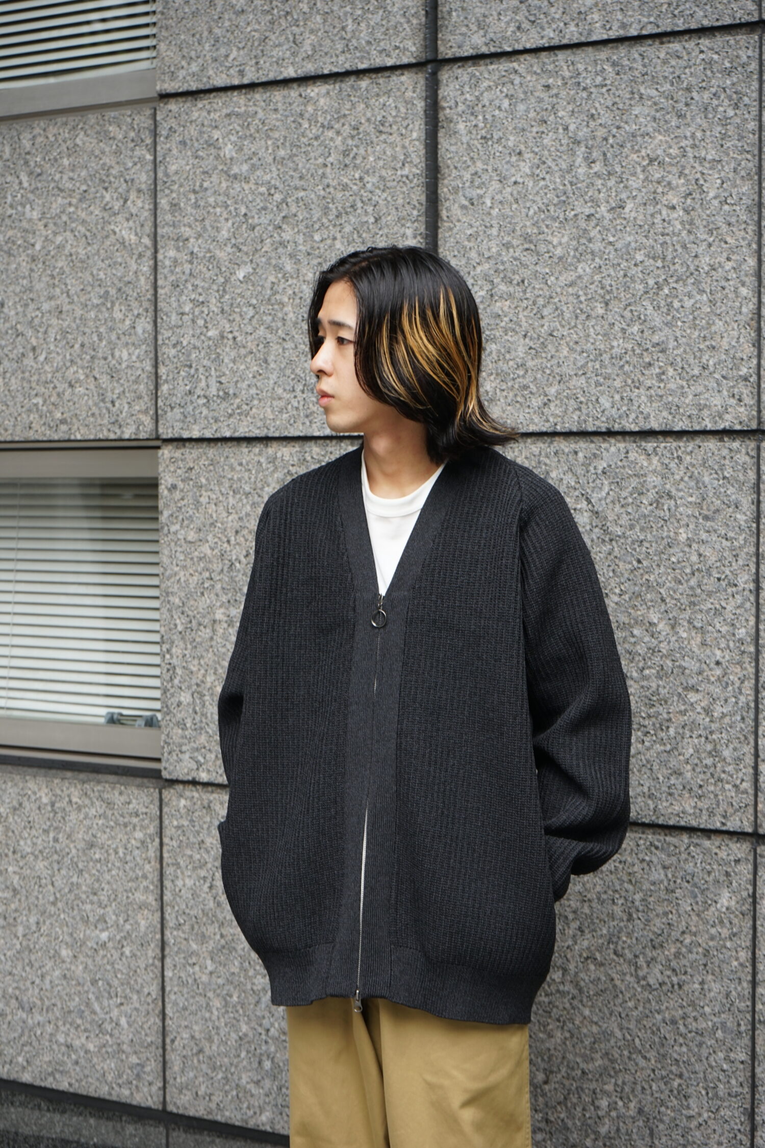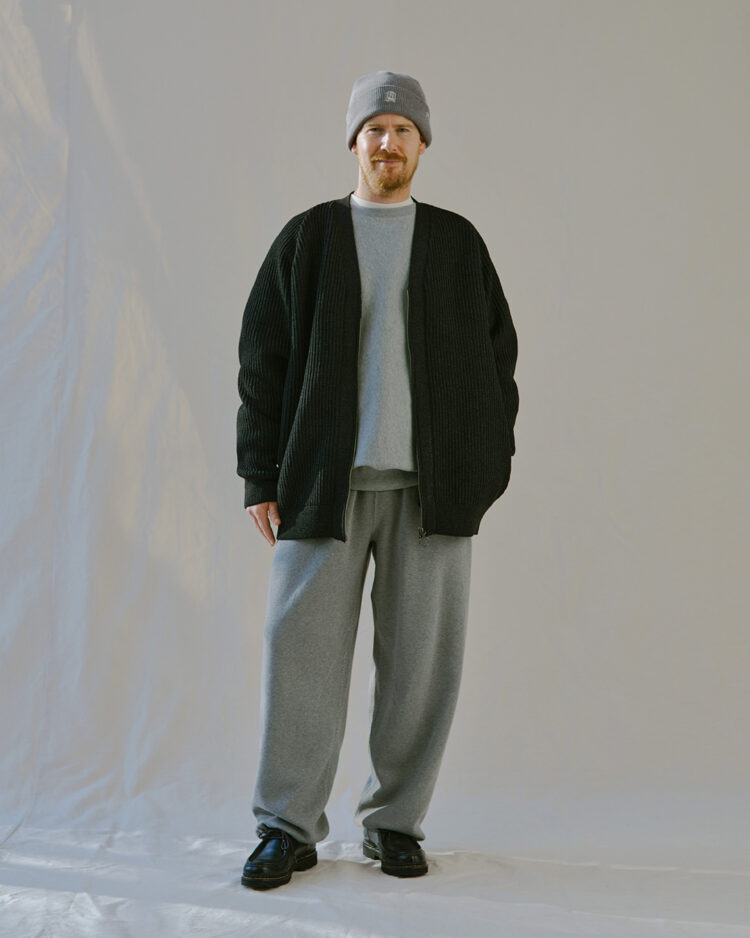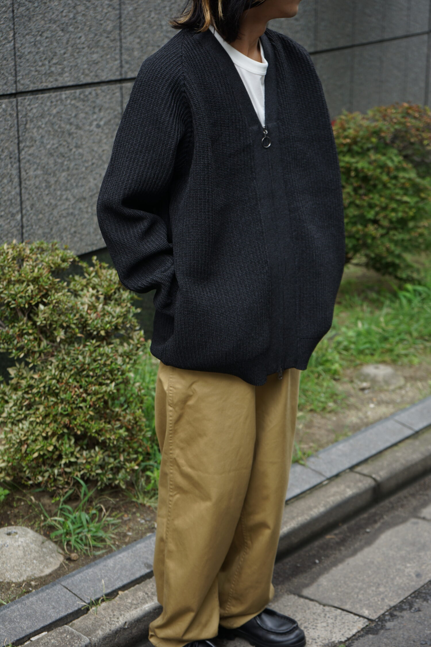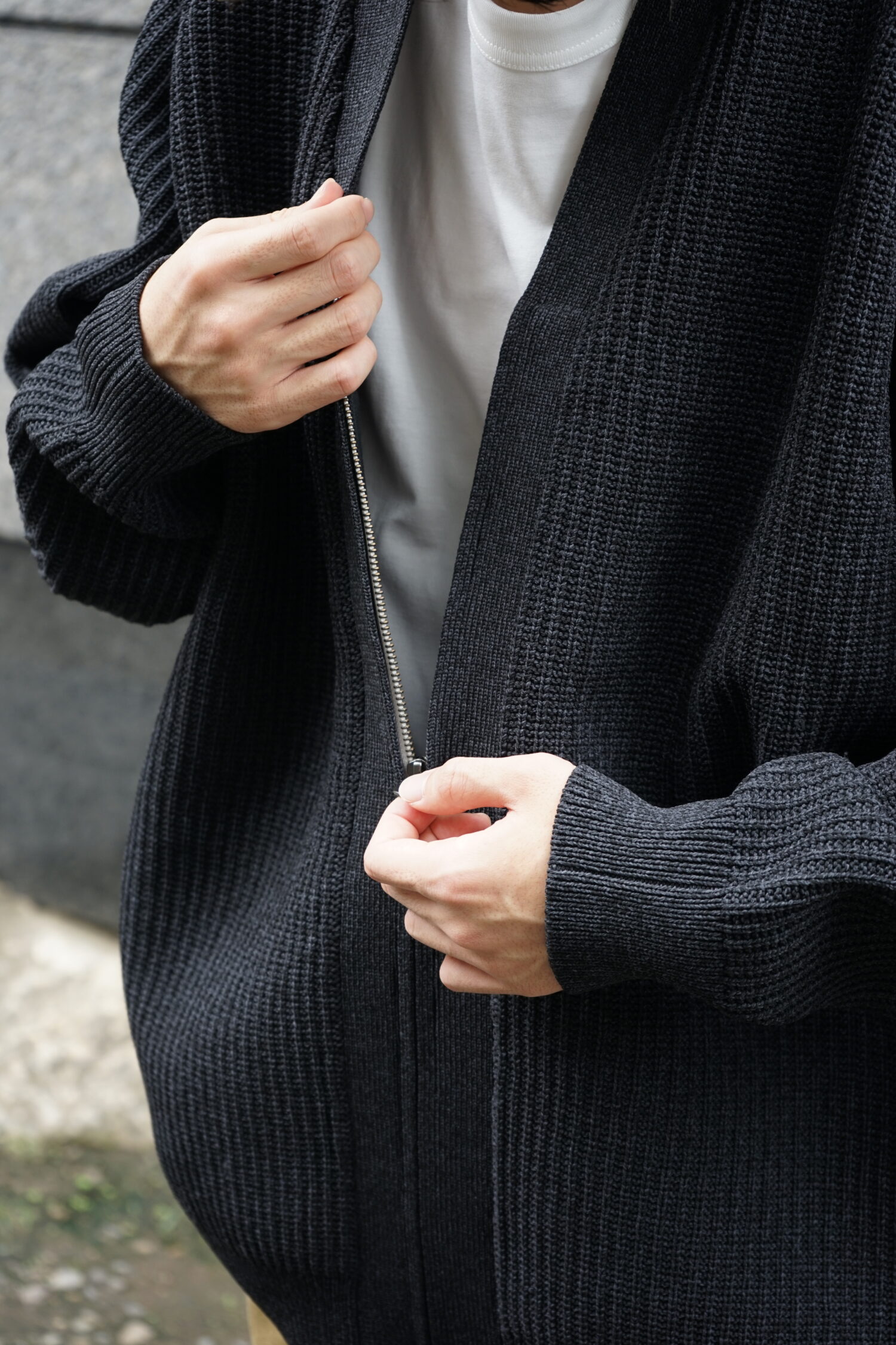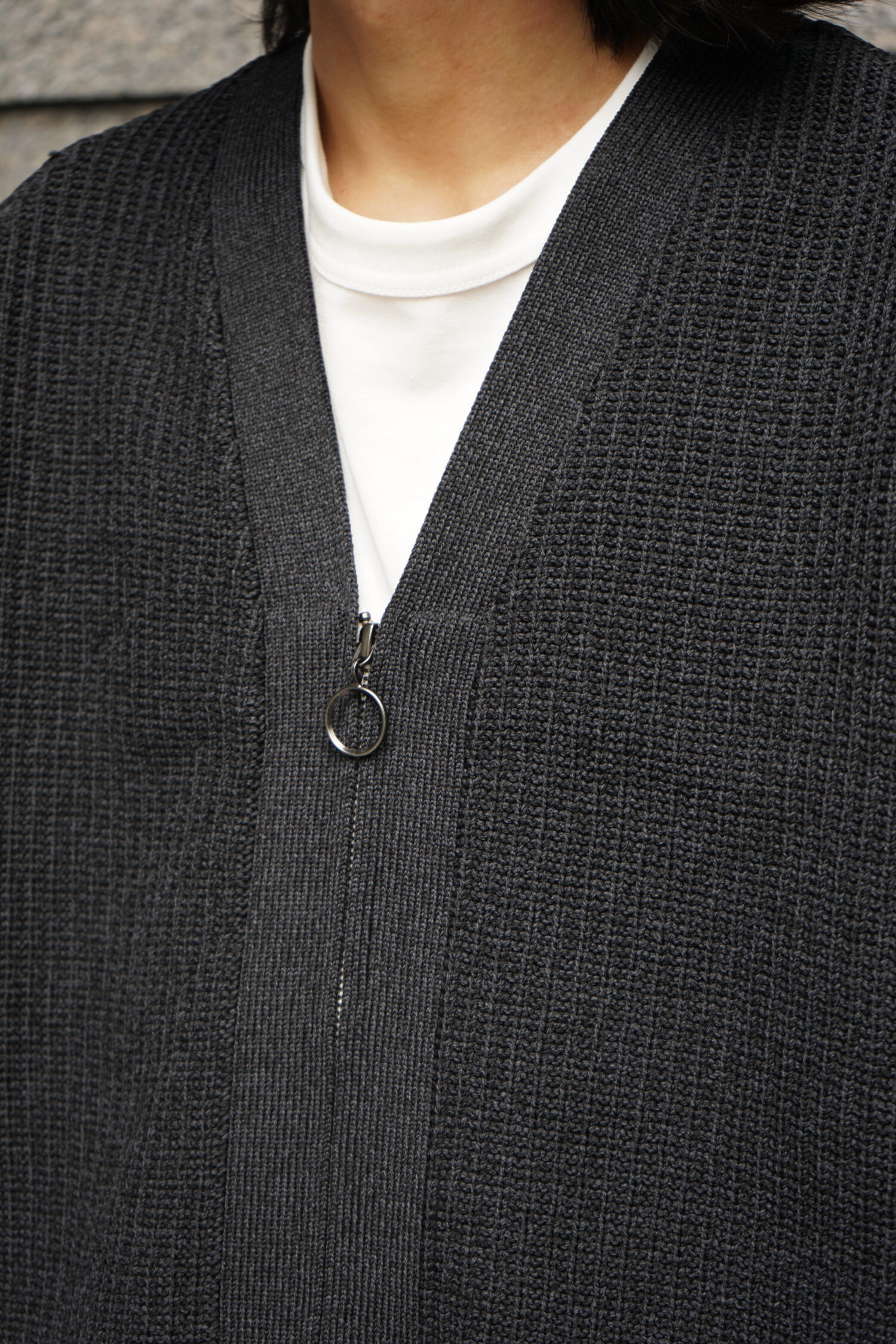 ・5G変形畦編みで仕上げたジップアップカーディガン。
