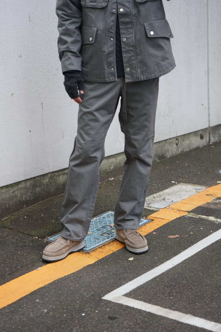 染色加工を施したコットンドリル素材を使用したワーカートラウザーズ。5ポケットとワークパンツの要素をミックスしたデザインで、腰回りから裾にかけてゆとりのあるストレートシルエットです。