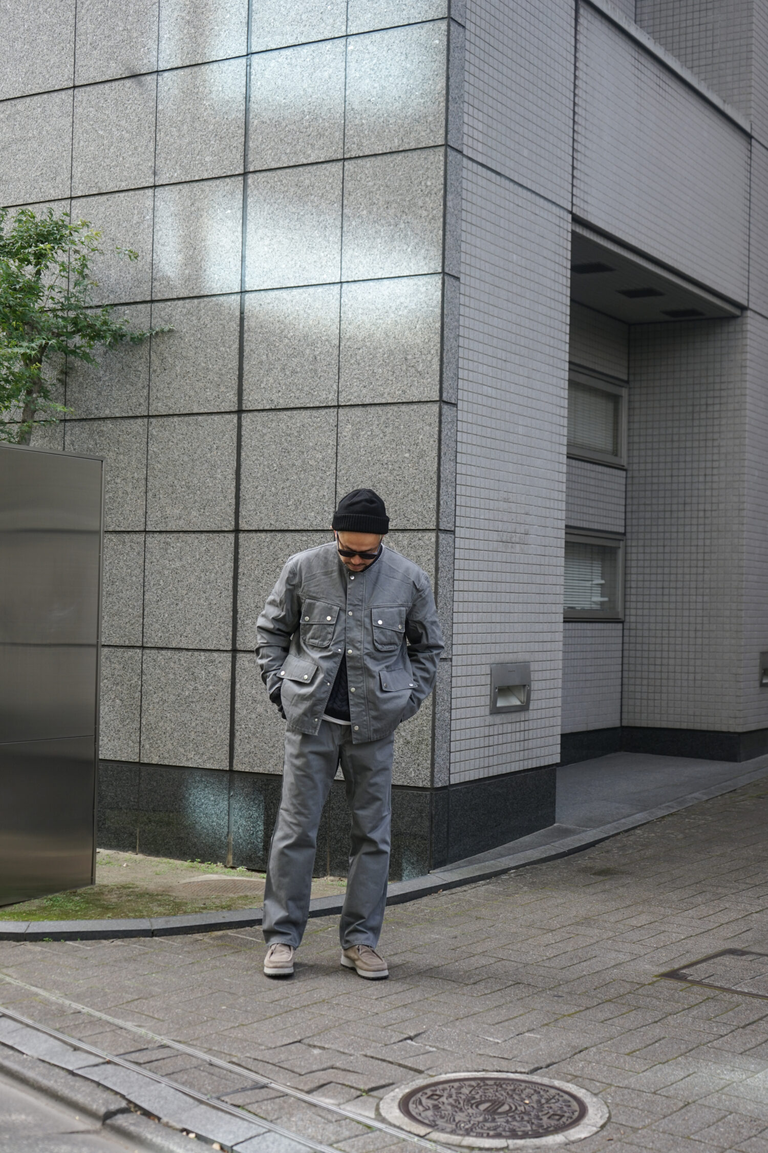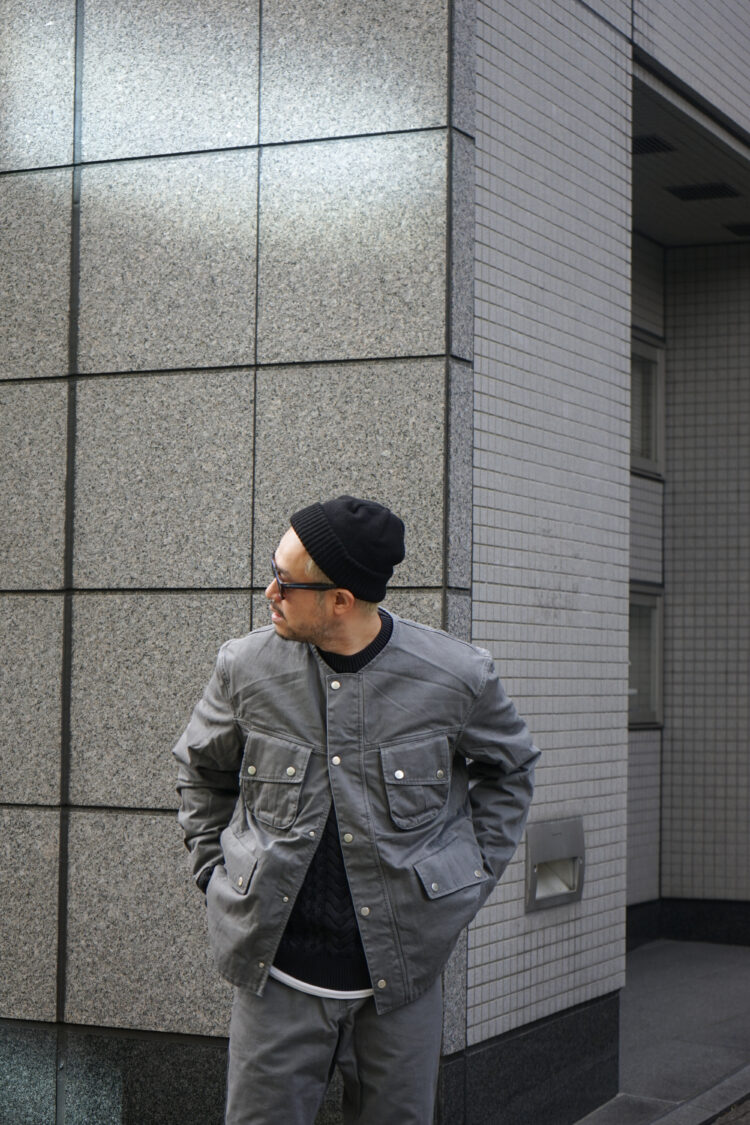 染色加工を施したコットンドリルを使用したライダージャケット。風合いある綾の表情とノーカラー仕様が特徴。ゆとりがありながらもやや丈の短いシルエット。
