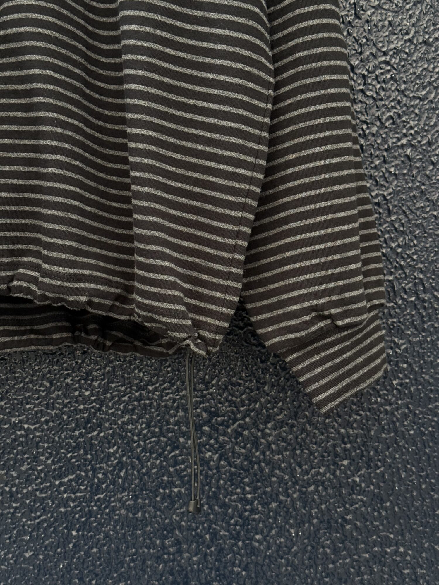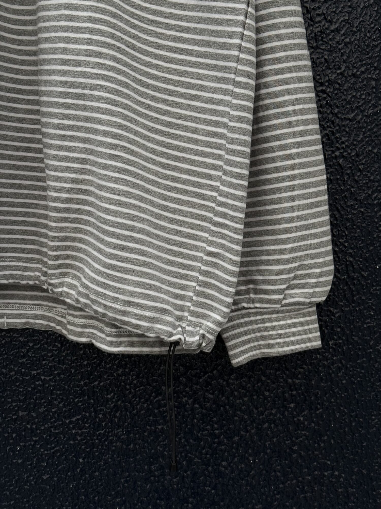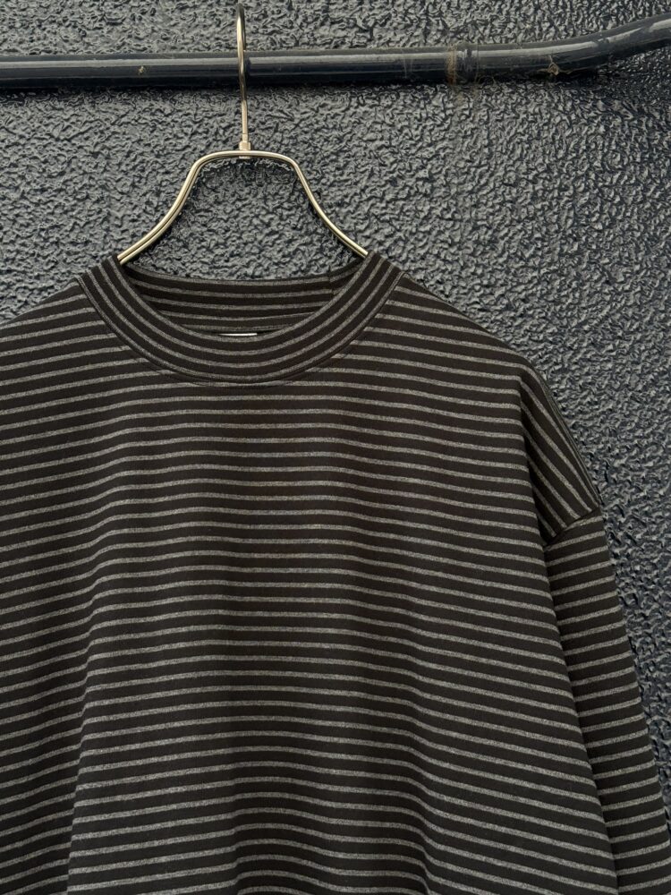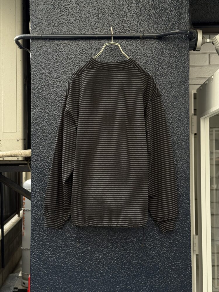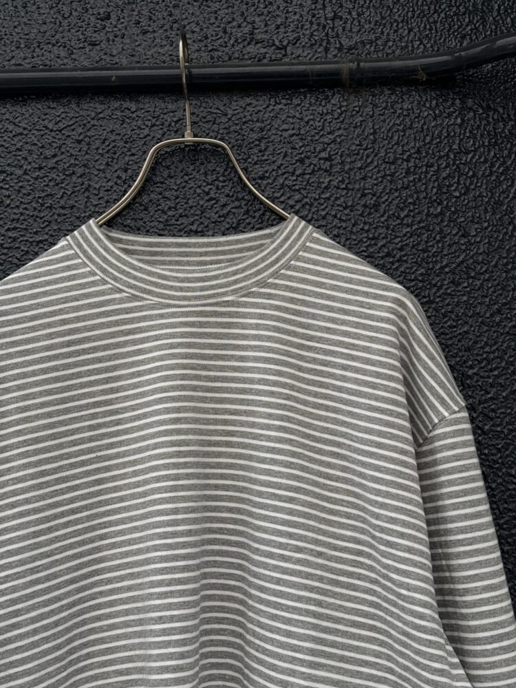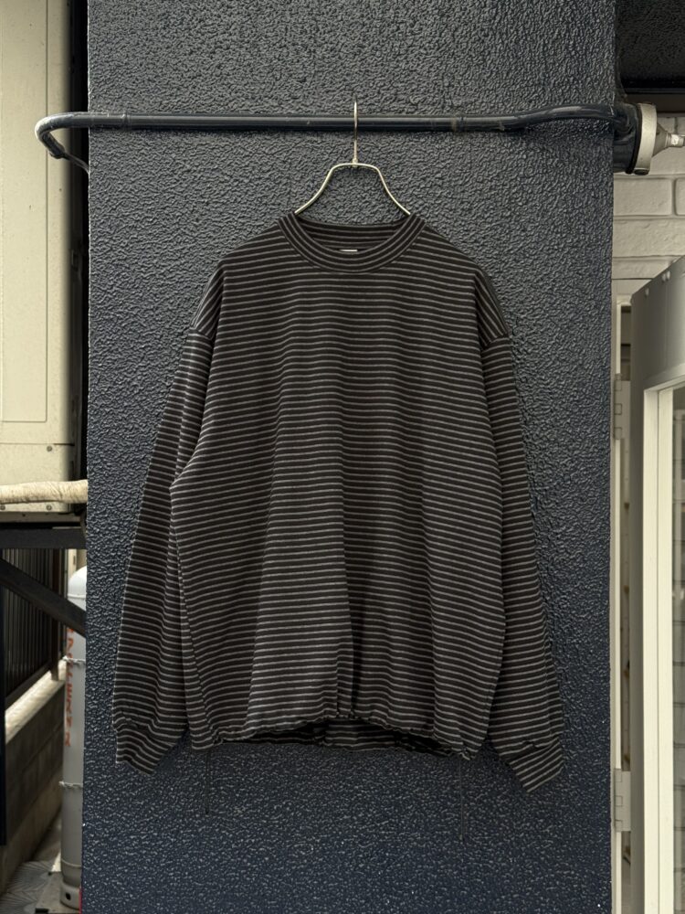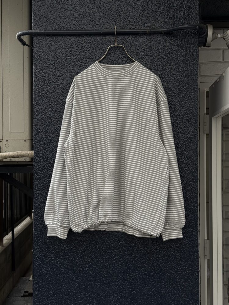 30/2コーマ糸で編み立てたオリジナルの細ボーダー天竺。RIBの同じピッチでボーダーになっております。裾のドローコードでシルエットを調整可能。