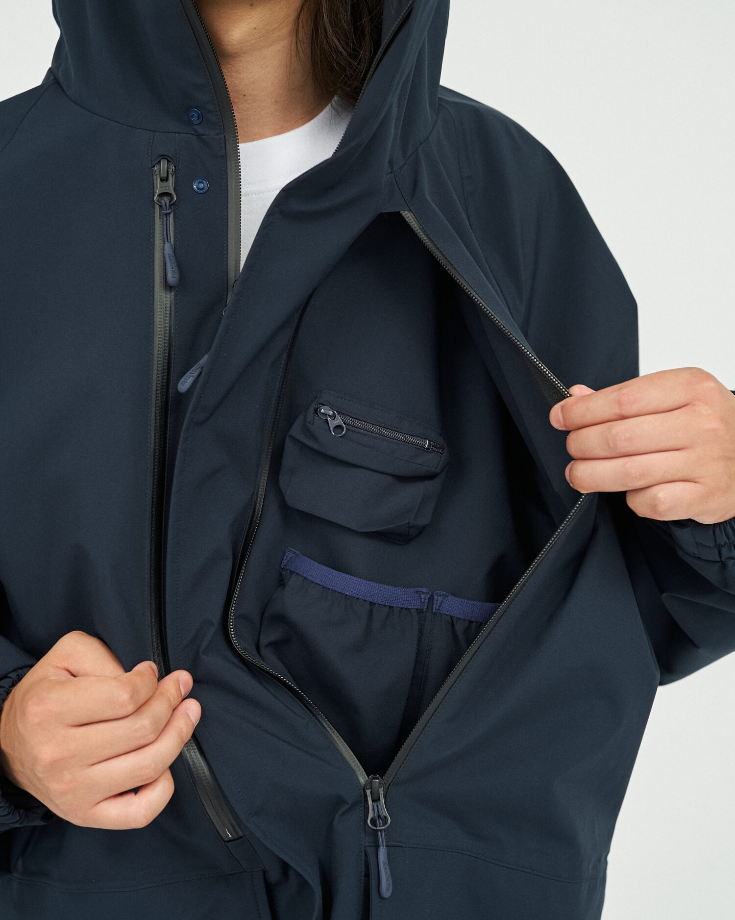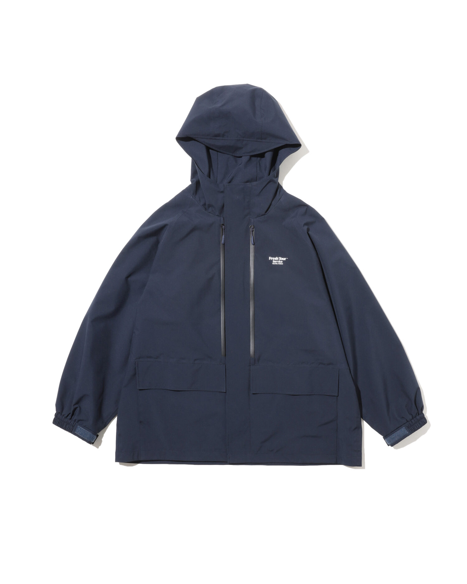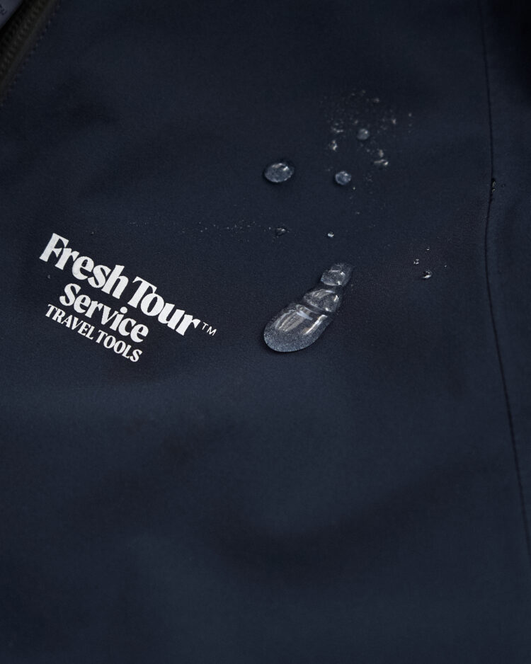 旅をテーマとしたFreshTourServiceからリリースされる、軽量で撥水、透湿性に優れたオリジナル3レイヤーファブリックを採用。