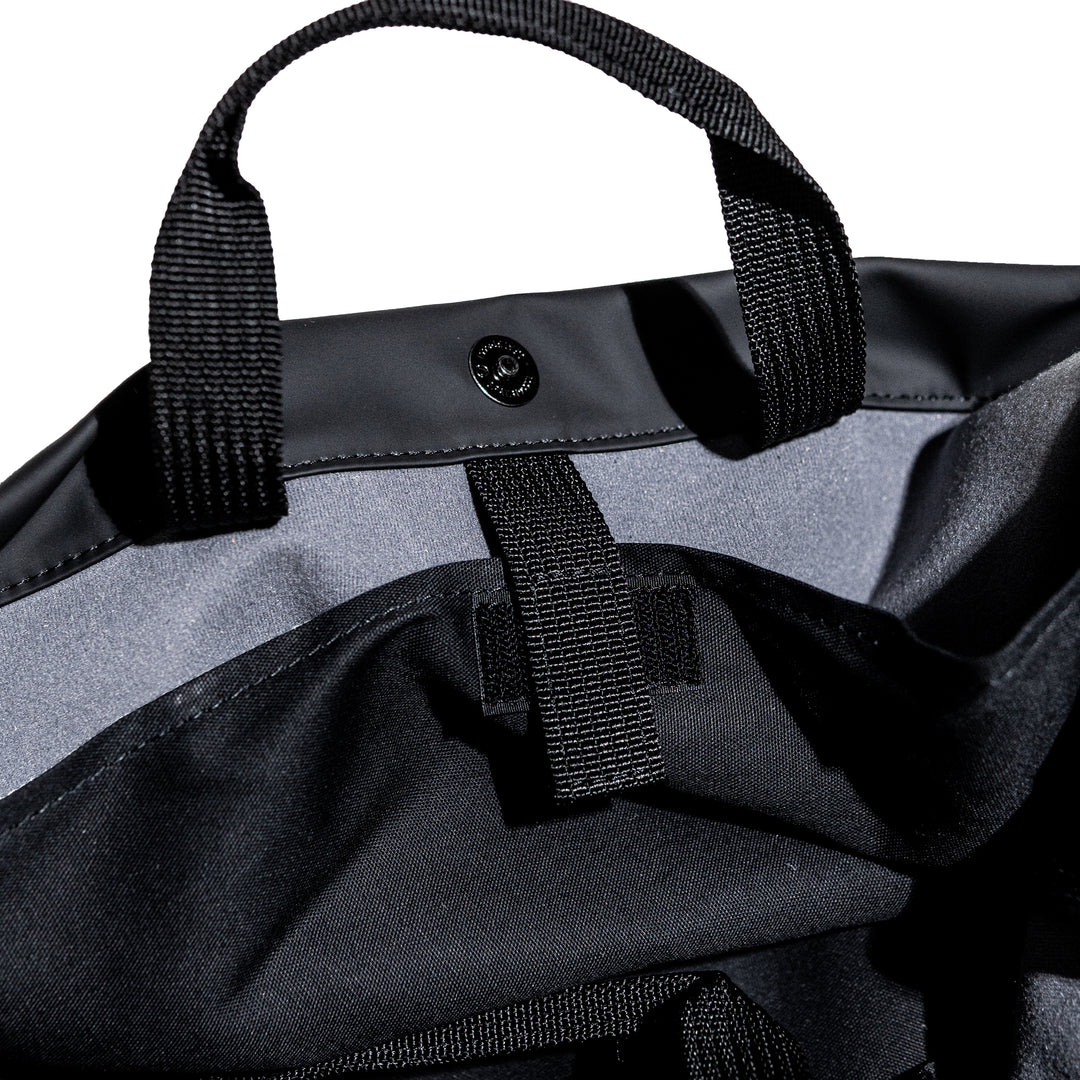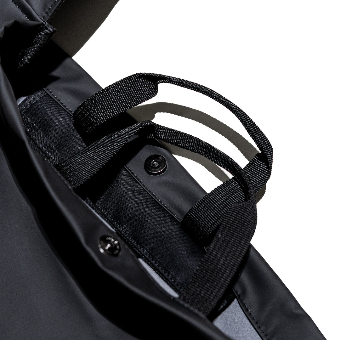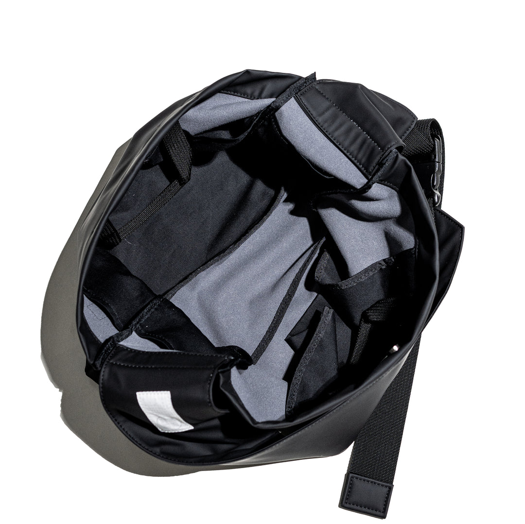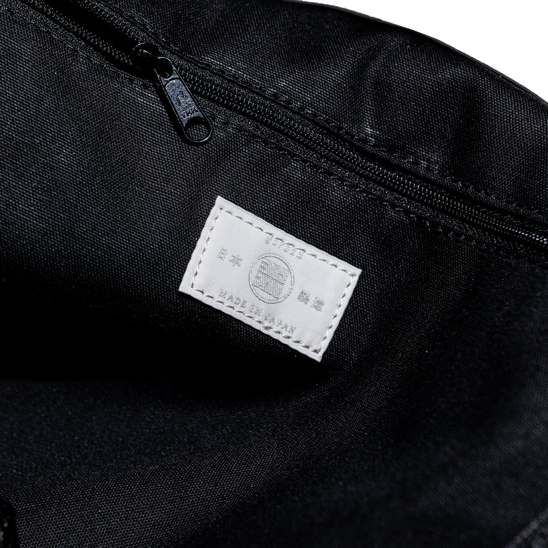 スライドタスキショルダー。その名の通り、YKKバックルをクイっと上げていただくと素早く、スムーズに長さ調節が可能となっており、モノの出し入れと、脱着が容易になっております。ショルダーテープを本体にまとめず、垂らす仕様です。ショルダー幅は12cm。ヴィジュアルインパクトありつつ、身体の負担を軽減する実用性も兼ね備えてあります。本体ボディは身体に掛けると体に沿って馴染む丸みを帯びたフォルムです。生地はポリカーボネートを使用。マットな表情。高耐久性と表面摩擦強度。通常のポリウレタンと比べ、高温多湿にも耐えます。PU特有の経年劣化にも強く、長くご使用いただけます。また環境に配慮された製法で作られた素材です。従来比70%のCO2排出量・揮発性有機溶剤約80%)。内装には手持ち用のハンドルがあり、トートバッグとしてもご使用いただけます。