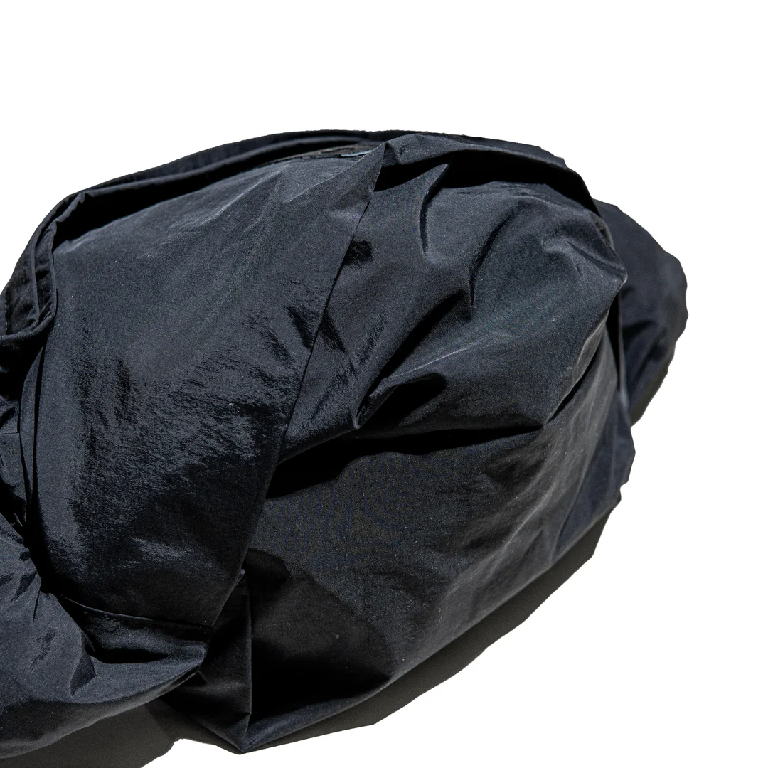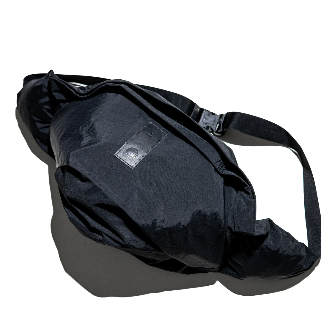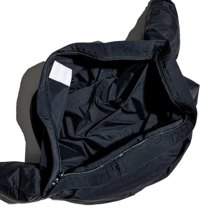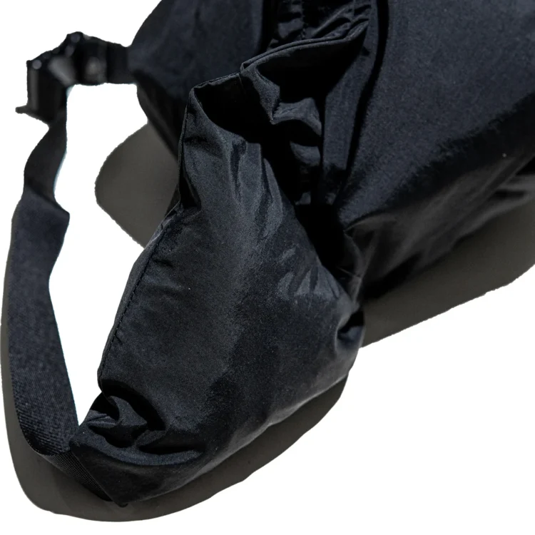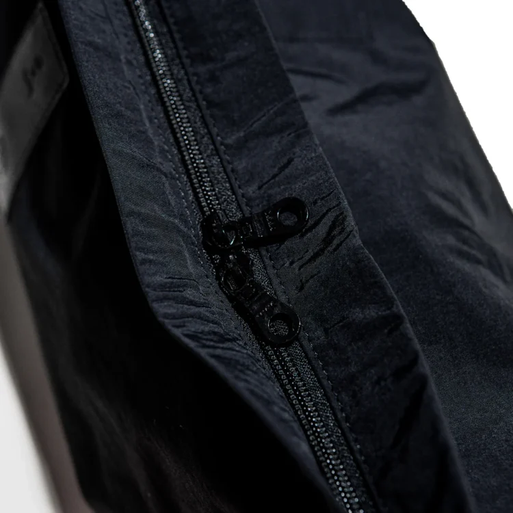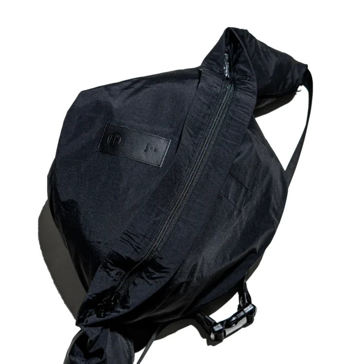 機動力を兼ね備えたタスキ型ショルダーパック。柔らかく、しなやかなコットンライクなナイロンとバッグの仕様と合わさってドレープ感を作り出します。本体と両サイドと3つ収納場所があります。本体はモノを収納すると、中にタックマチが内蔵されており、そのモノの大きにより立体的になる仕組みです。忍者の頭巾のようなヴィジュアルに変化します。両サイドにはファスナーポケットが完備されており、小分け可能。メインボディーはタスラン糸から作られた日本製ナイロンタフタ。こちらのタスラン糸はリサイクル。GRS認証を取得した工場で生産。撥水効果もありながら、フッ素フリーのCO撥水剤にて仕上げられており人体に優しい生地です。付属レザーは兵庫県姫路市にて製作されたyorozuオリジナル防水革。マットな仕上がり。サスティナブルな製法。しなやかなで肌触りが心地よいです。