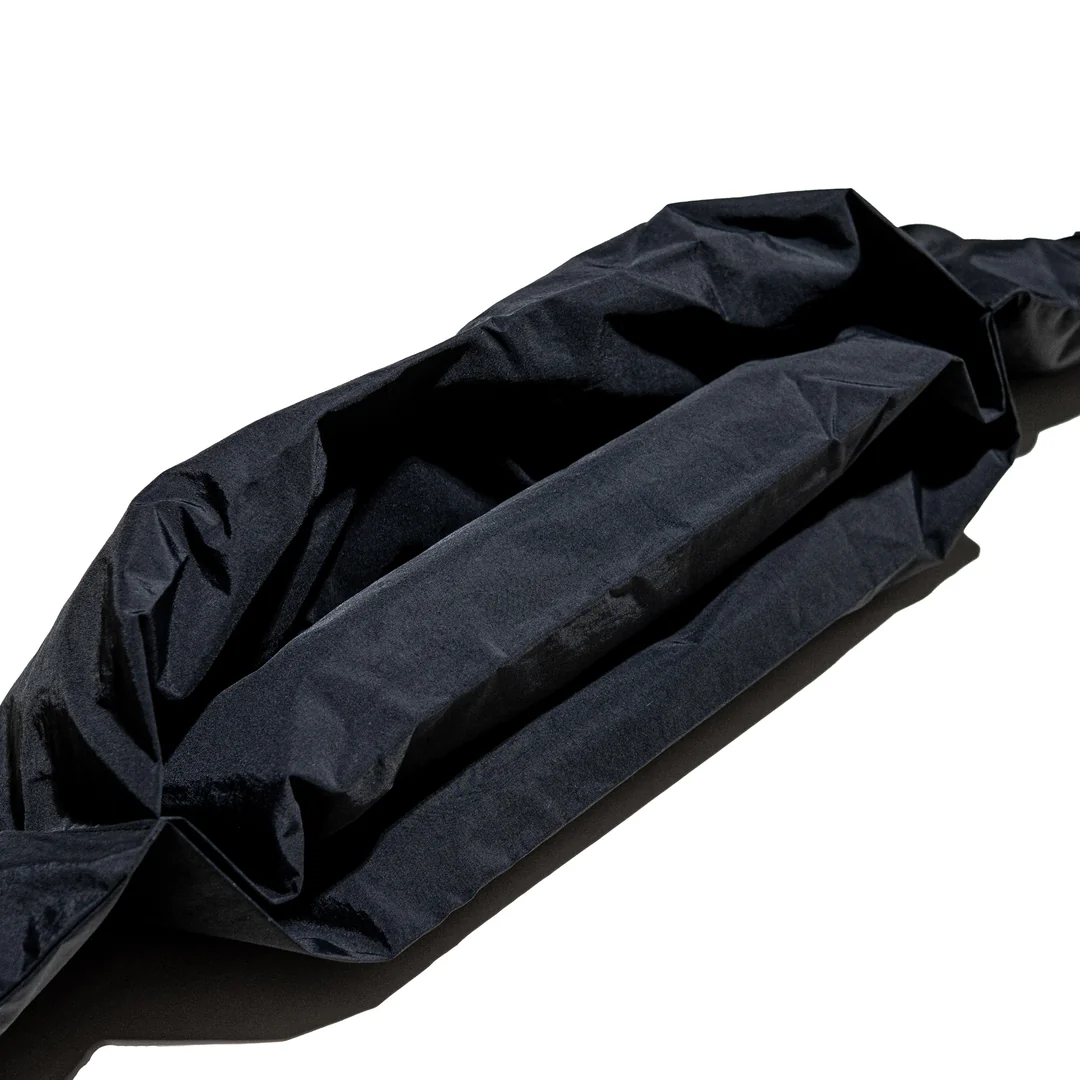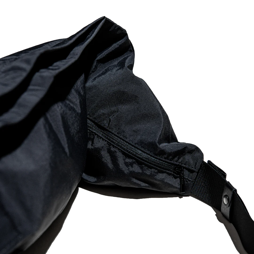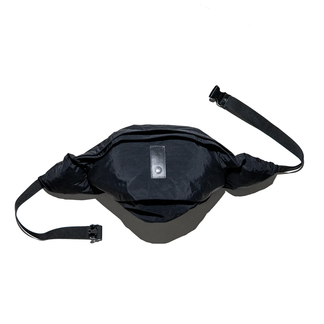 機動力を兼ね備えたタスキ型ショルダーパック。柔らかく、しなやかなコットンライクなナイロンとバッグの仕様と合わさってドレープ感を作り出します。本体と両サイドと3つ収納場所があります。本体はモノを収納すると、中にタックマチが内蔵されており、そのモノの大きにより立体的になる仕組みです。忍者の頭巾のようなヴィジュアルに変化します。両サイドにはファスナーポケットが完備されており、小分け可能。メインボディーはタスラン糸から作られた日本製ナイロンタフタ。こちらのタスラン糸はリサイクル。GRS認証を取得した工場で生産。撥水効果もありながら、フッ素フリーのCO撥水剤にて仕上げられており人体に優しい生地です。付属レザーは兵庫県姫路市にて製作されたyorozuオリジナル防水革。マットな仕上がり。サスティナブルな製法。しなやかなで肌触りが心地よいです。
