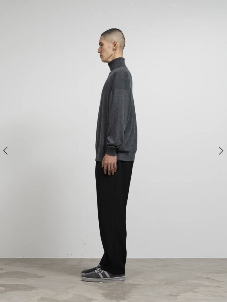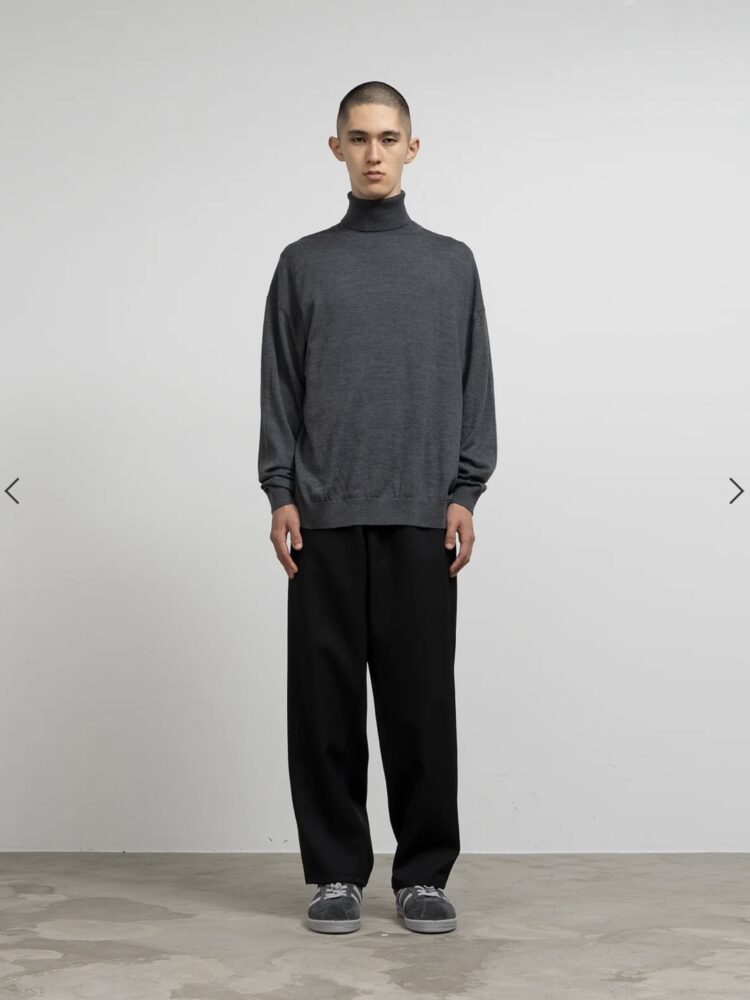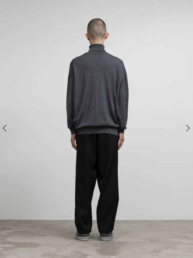 超細番手 S160'sのウール糸にアップデートをしたベーシックニット。糸が持つ自然な光沢と十分な油脂分による滑らかな肌触りをより心地よい仕上がりに。程良くボリュームのある3サイズ展開の長袖タートルネック。