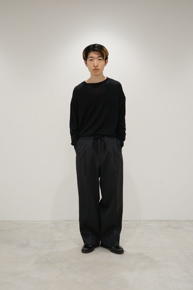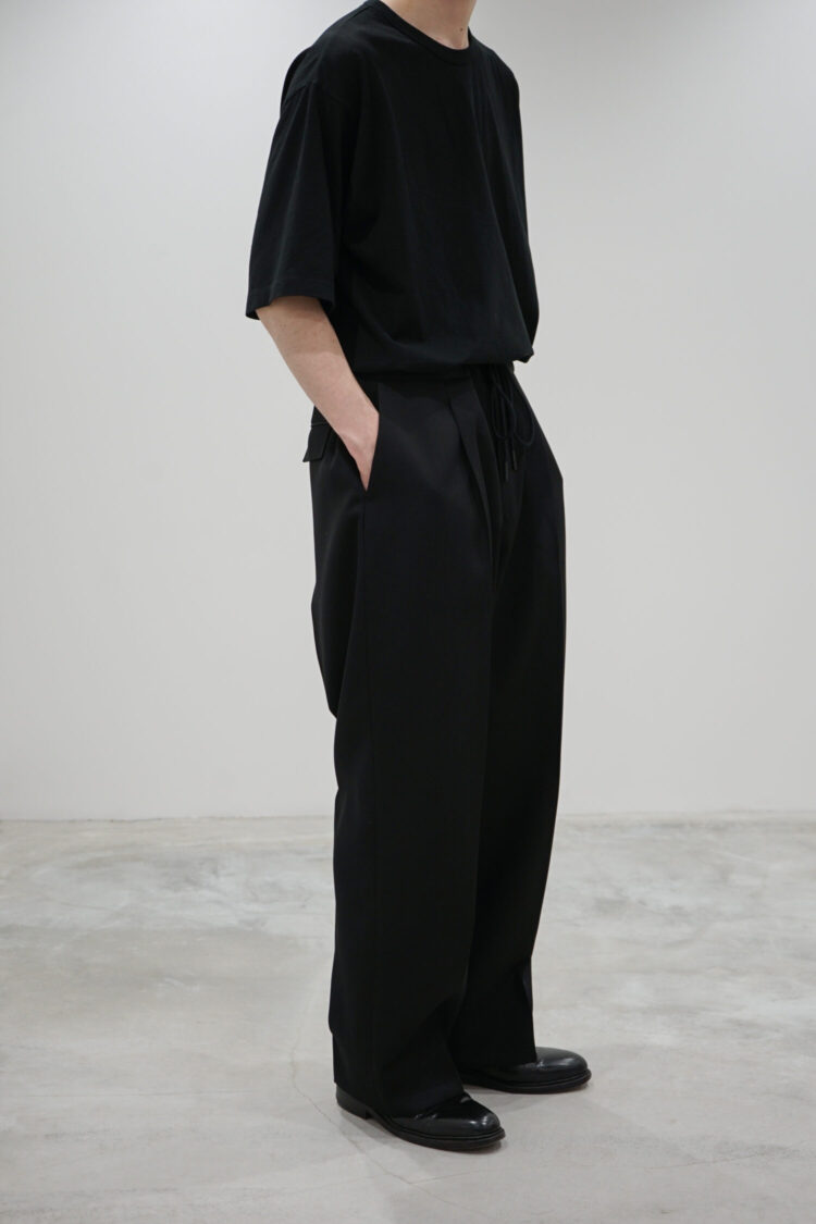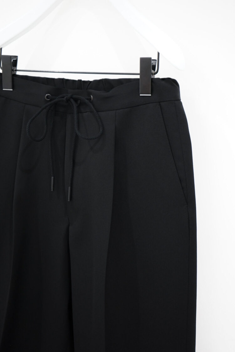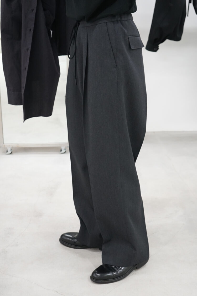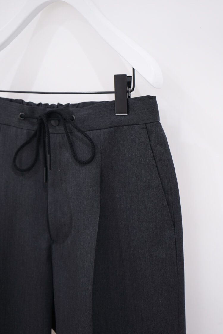 メリノウールのギャバジン素材を使用したイージースラックス。伝統的なスラックスをベースに、ウエストからワンタックを入れ、裾にかけてストレートのラインを出し、クセのないワイドシルエットのパンツに仕上げました。ウエストはスピンドルで絞る仕様で後ろにはゴムを通し、履き心地の良さを実現。ウエスト位置の調整が可能な為、スタイリングにも取り入れやすい一着。ディテールには伝統的なポイントも仕込んだTHE RERACSならではのイージーパンツです。
