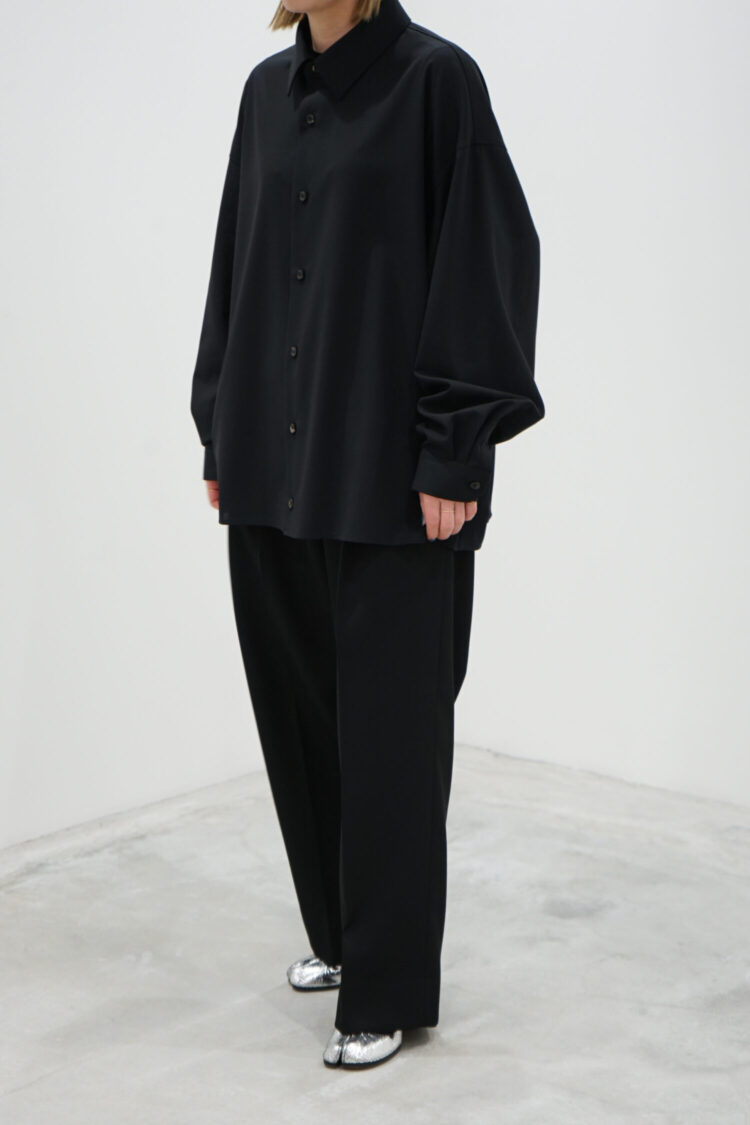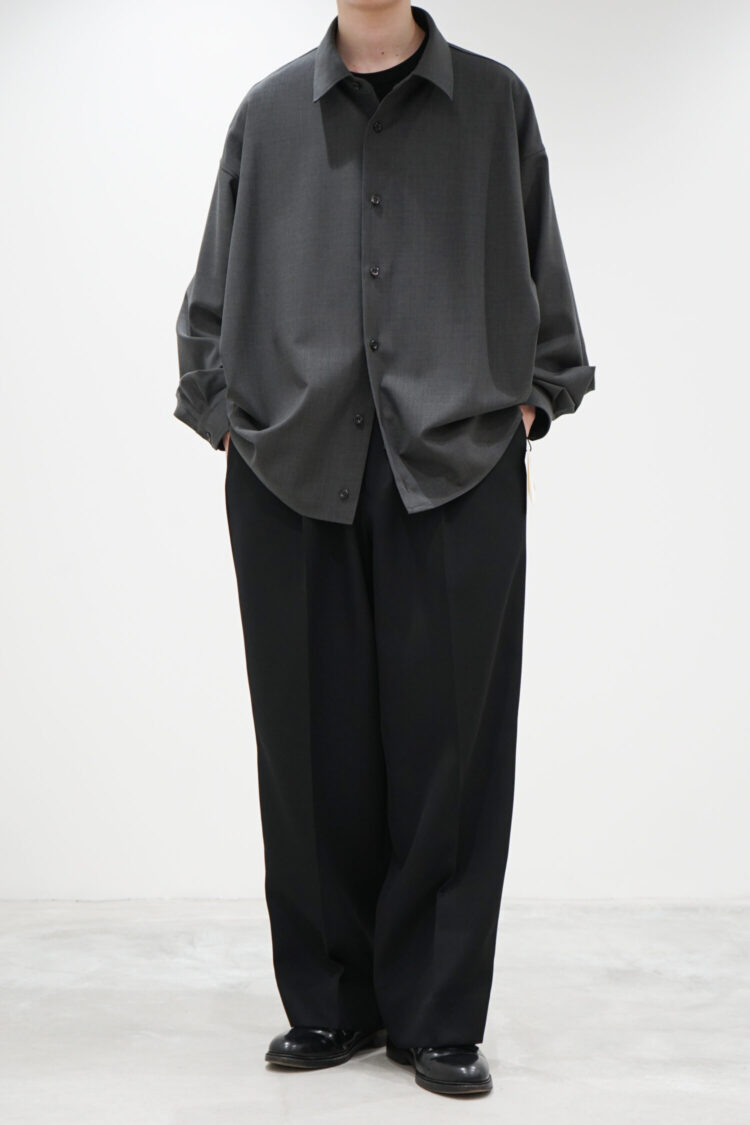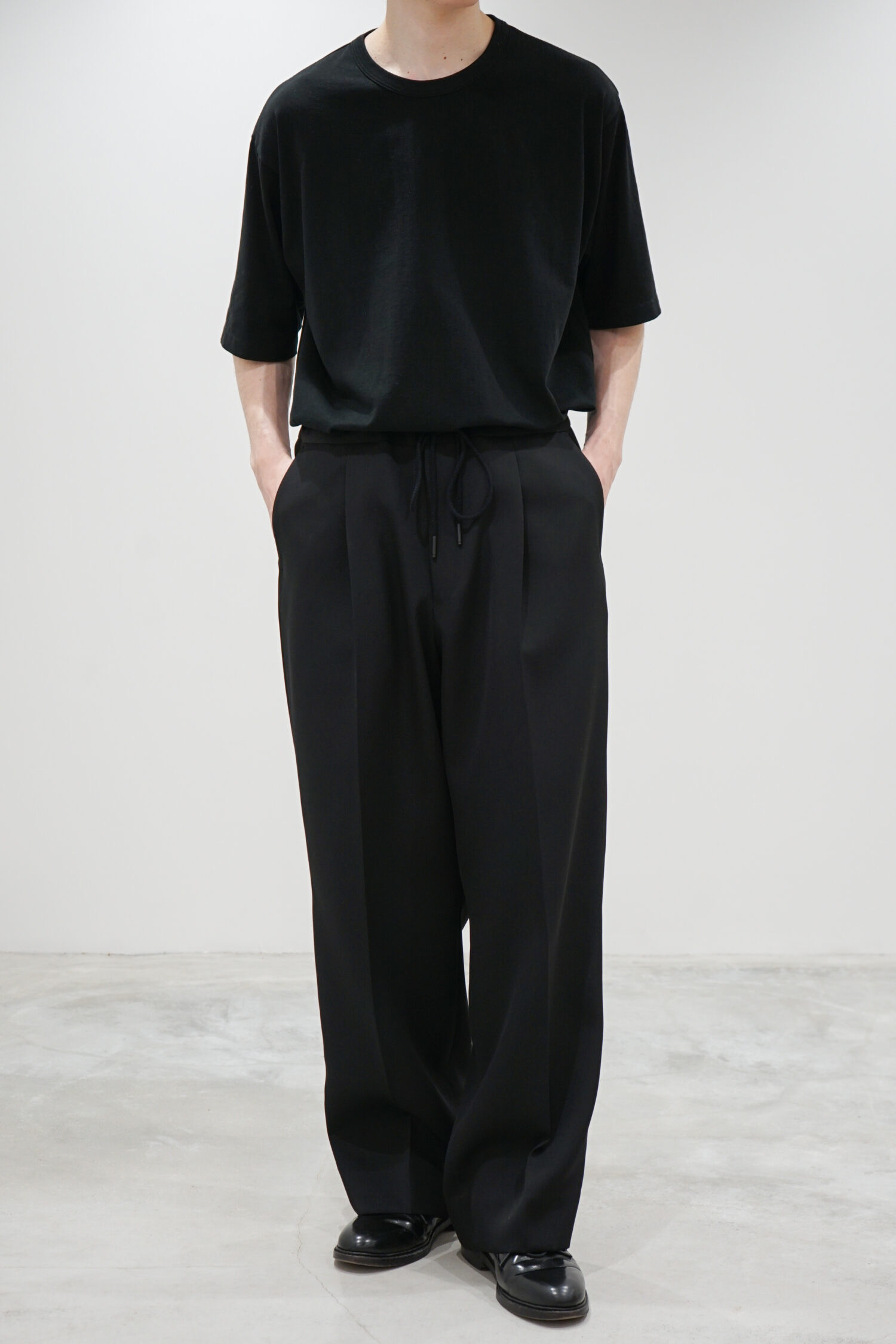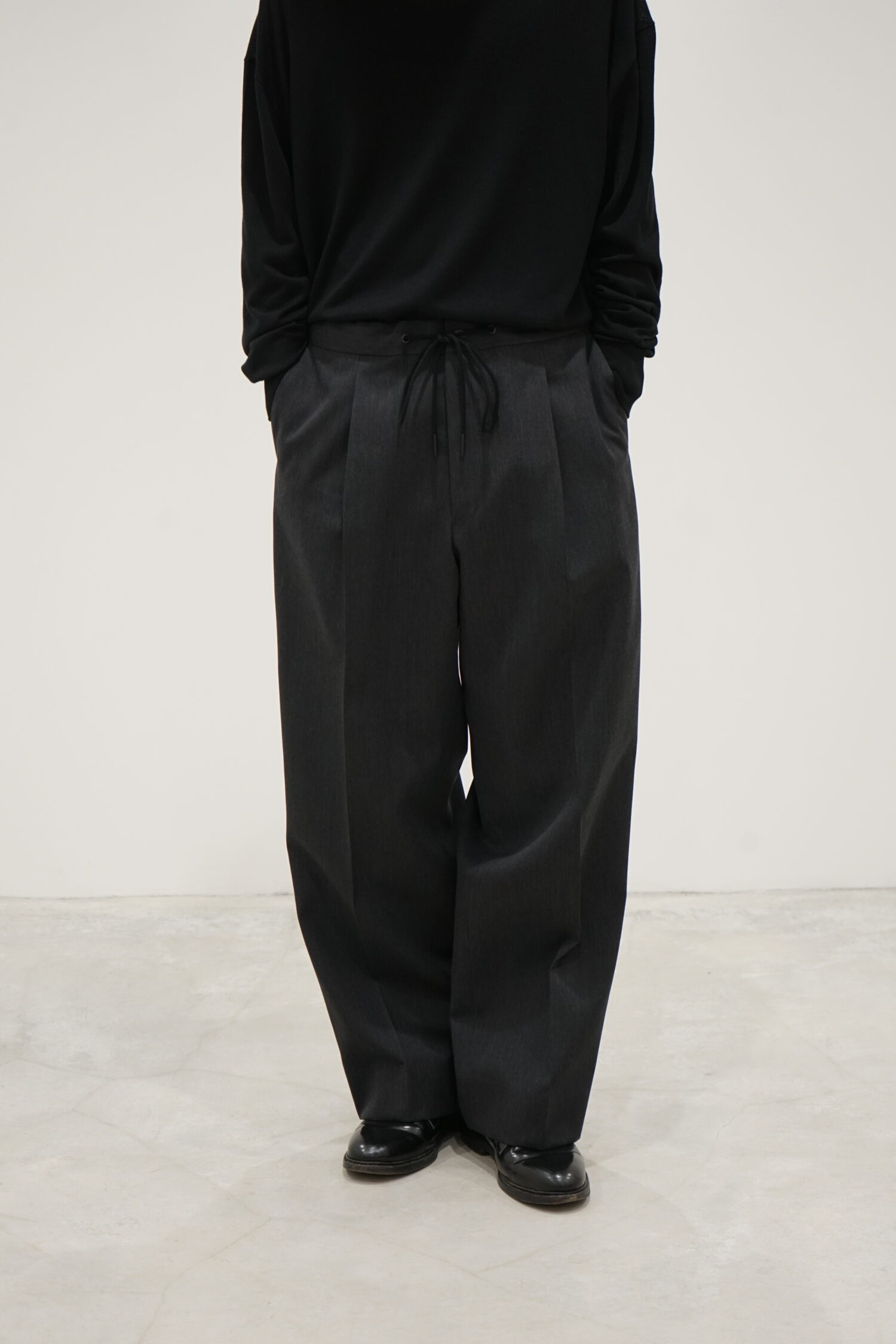 メリノウールのギャバジン素材を使用したイージースラックス。伝統的なスラックスをベースに、ウエストからワンタックを入れ、裾にかけてストレートのラインを出し、クセのないワイドシルエットのパンツに仕上げました。ウエストはスピンドルで絞る仕様で後ろにはゴムを通し、履き心地の良さを実現。ウエスト位置の調整が可能な為、スタイリングにも取り入れやすい一着。ディテールには伝統的なポイントも仕込んだTHE RERACSならではのイージーパンツです。