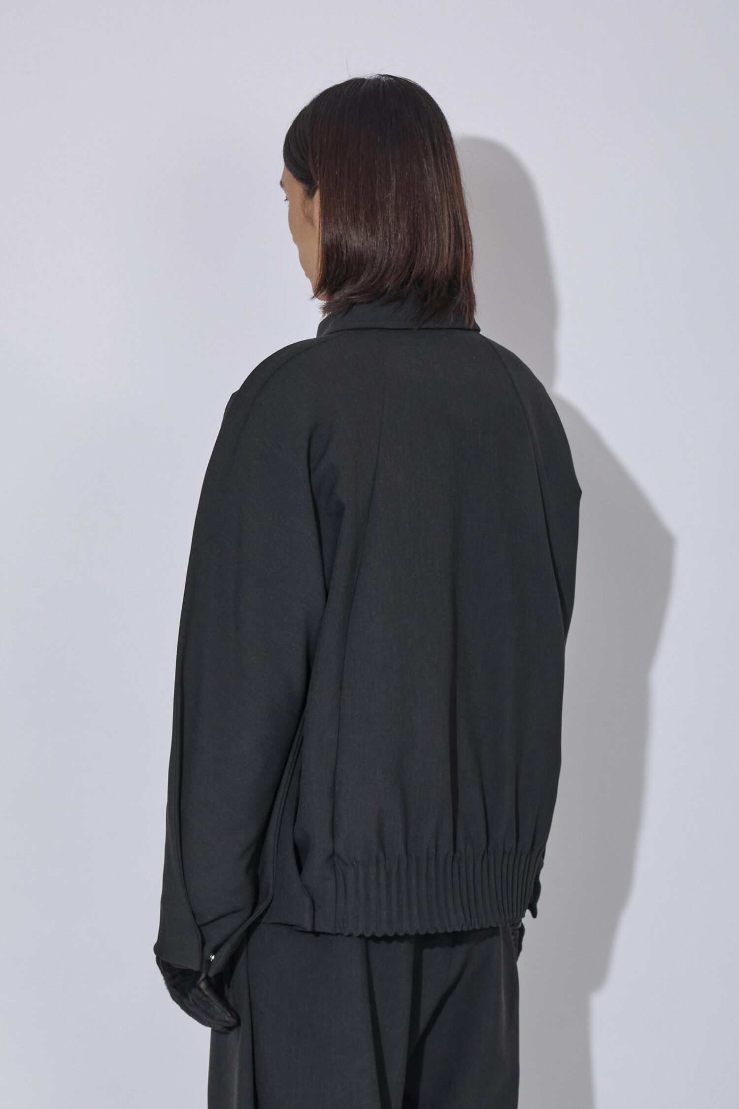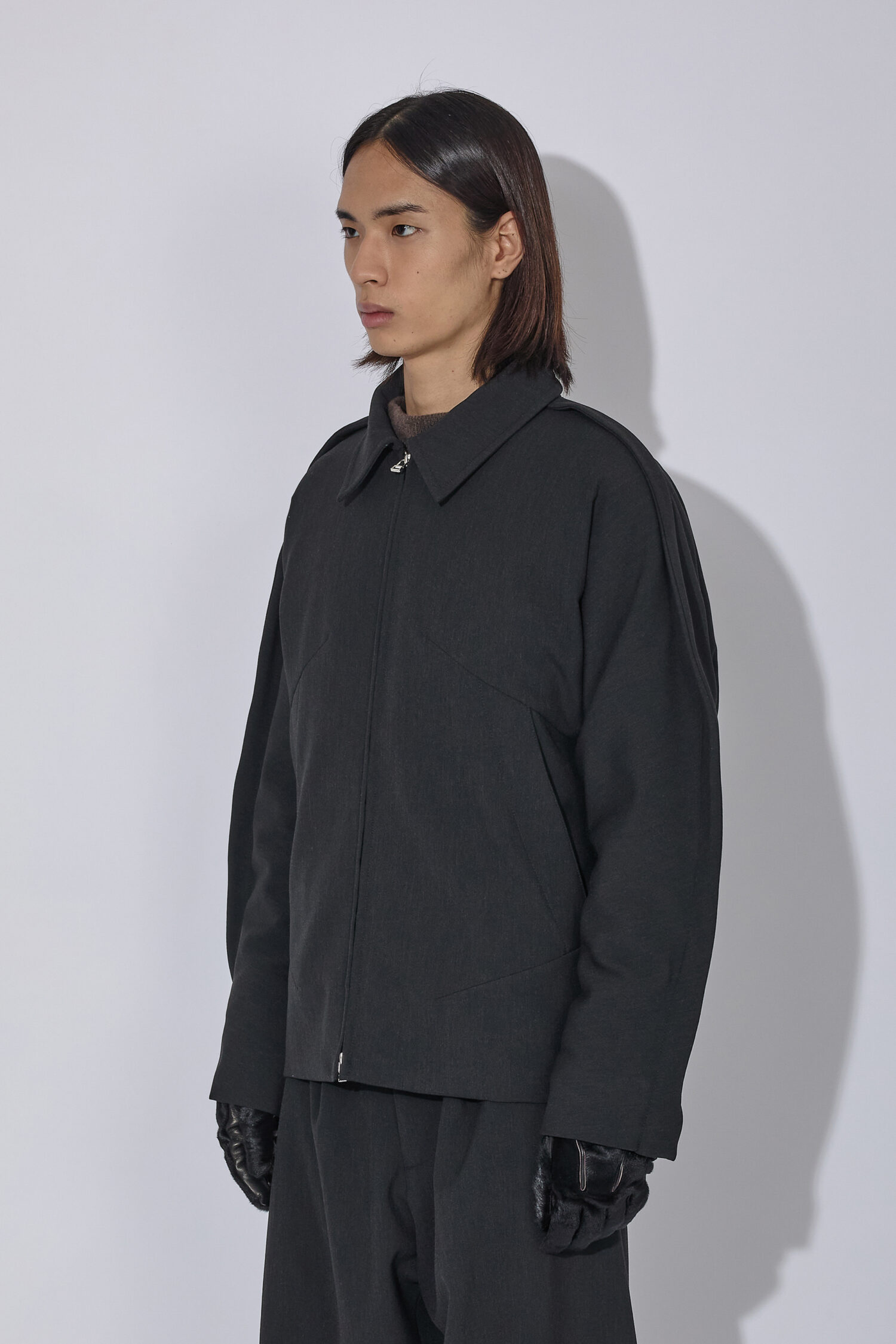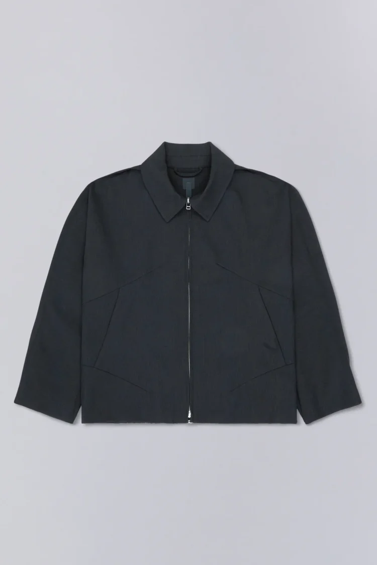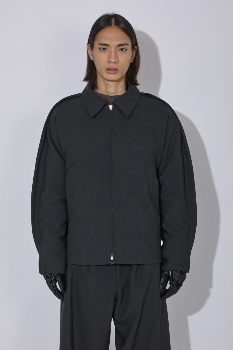 Uvasジャケットは、ソフトな二重織りのメランジ生地で作られており、腕の上と下の縫い目を強調する延長部分に「フィン」が施されています。これらの要素とドロップアームホール構造が組み合わさり、丸みのあるダイナミックなシルエットを生み出しています。ミラー仕上げの袖口タブ、Tカットスリーブ、ダーツポケット構造など、衣服の技術的な複雑さはディテールに反映されています。