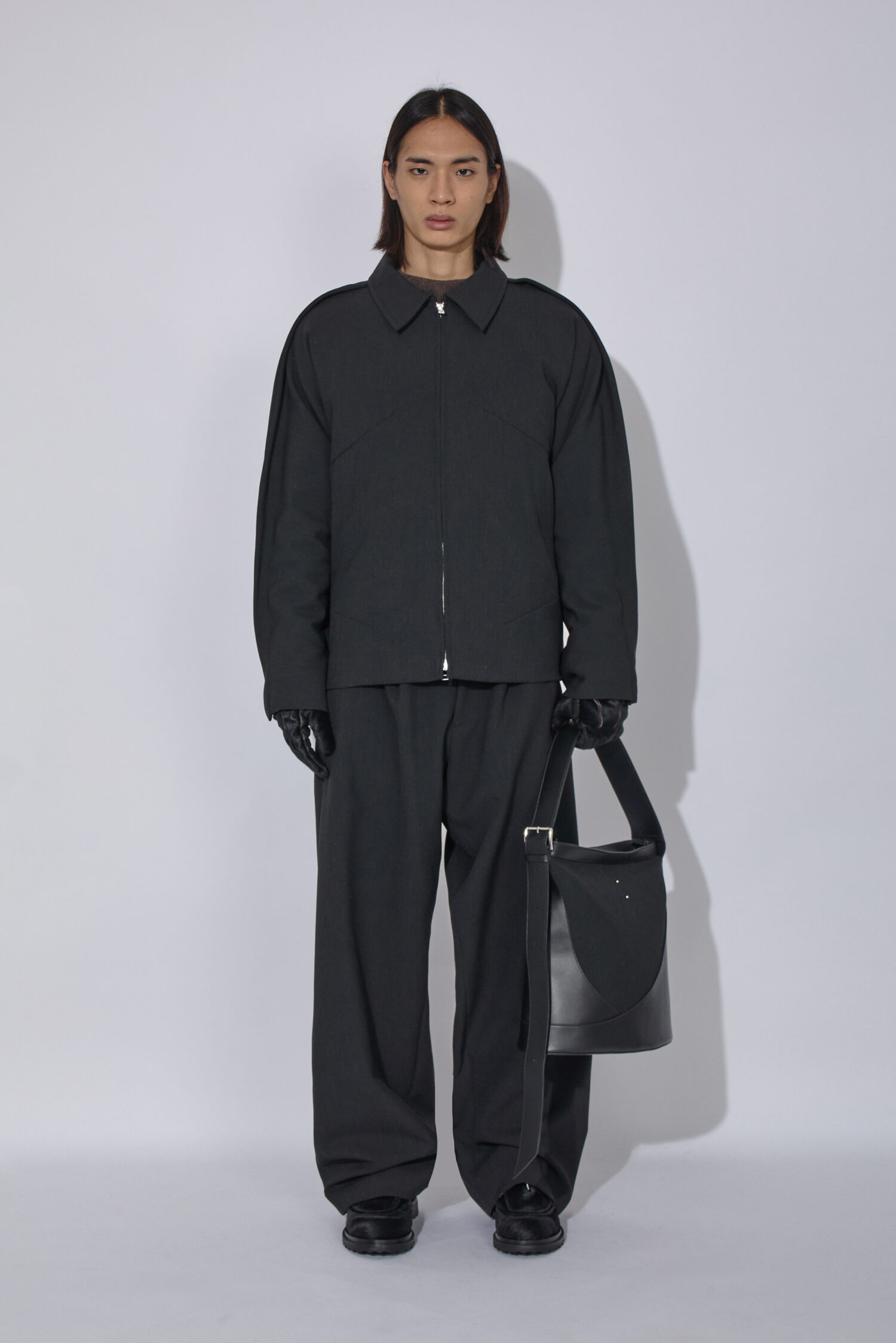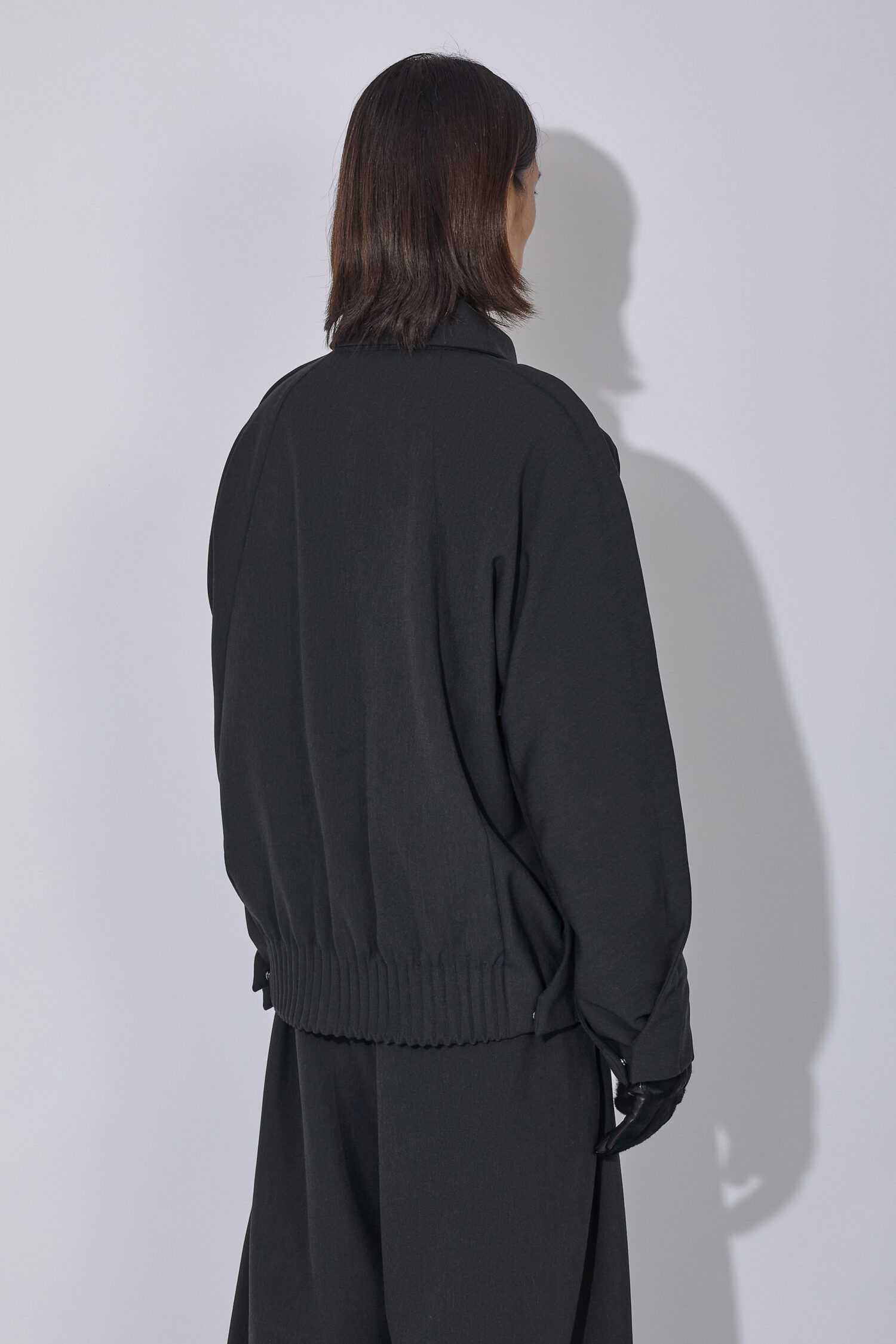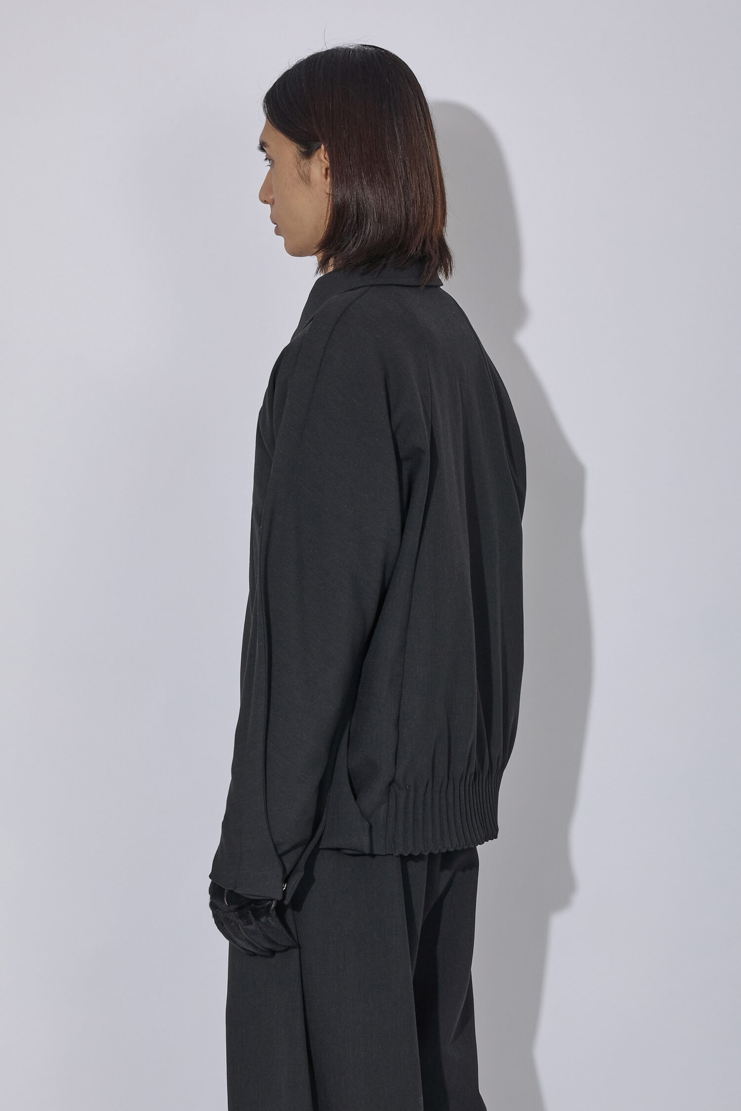 Uvasジャケットは、ソフトな二重織りのメランジ生地で作られており、腕の上と下の縫い目を強調する延長部分に「フィン」が施されています。これらの要素とドロップアームホール構造が組み合わさり、丸みのあるダイナミックなシルエットを生み出しています。ミラー仕上げの袖口タブ、Tカットスリーブ、ダーツポケット構造など、衣服の技術的な複雑さはディテールに反映されています。