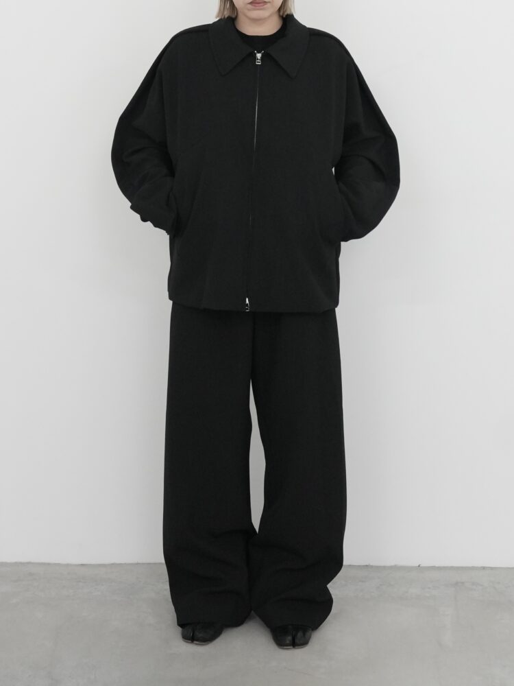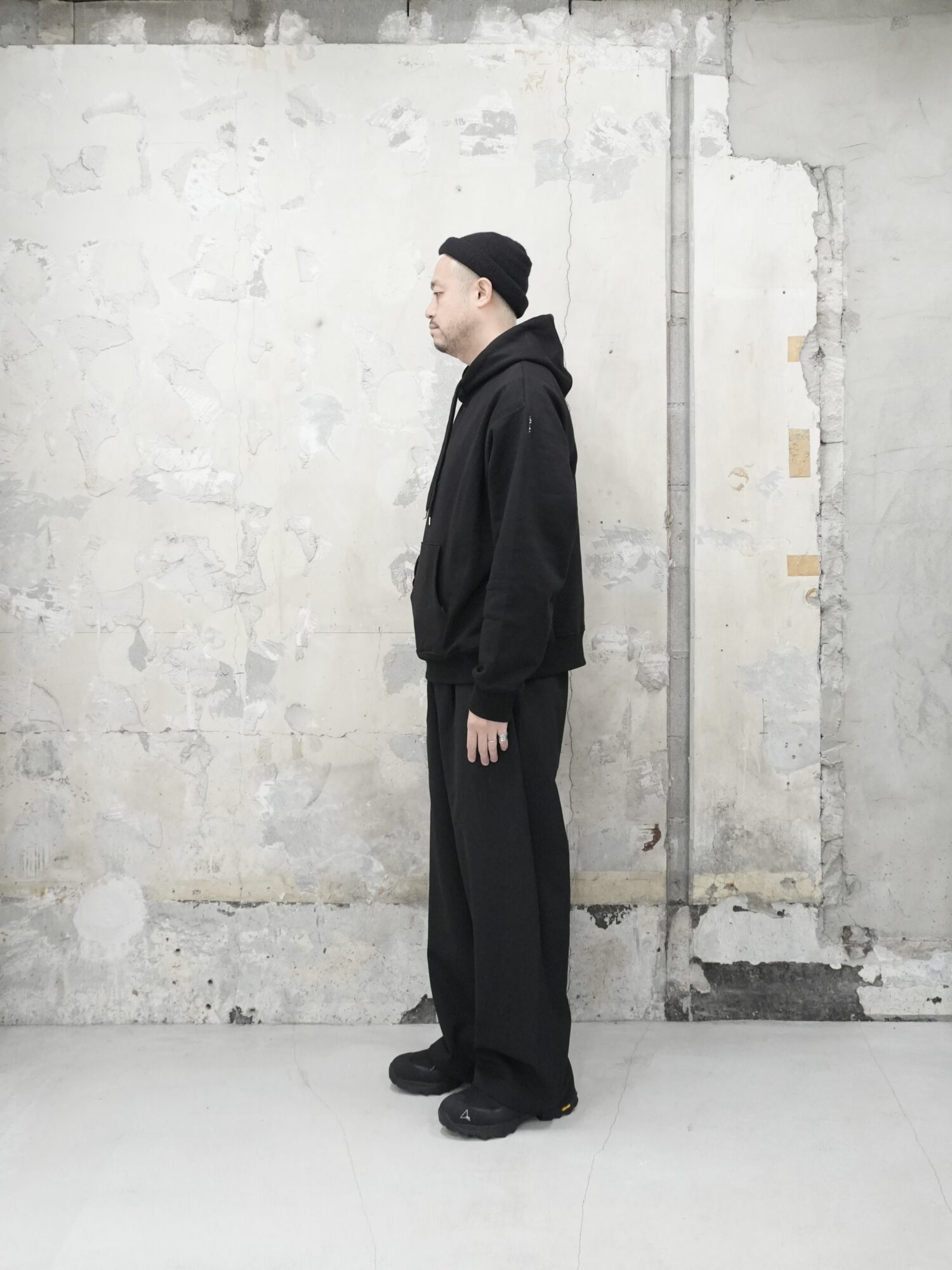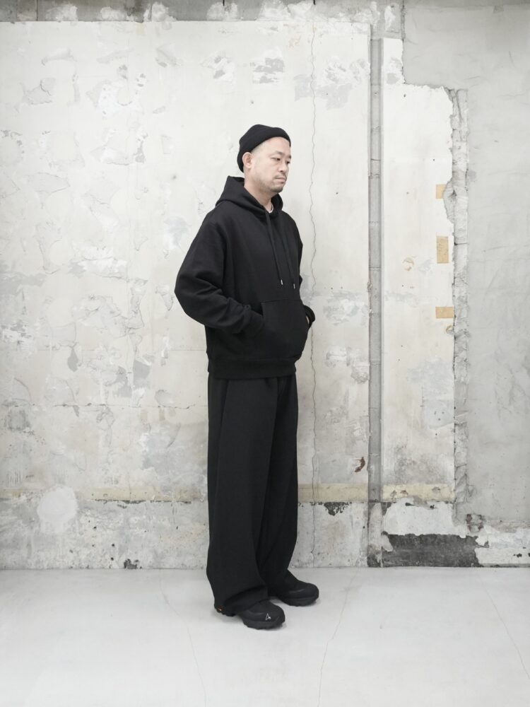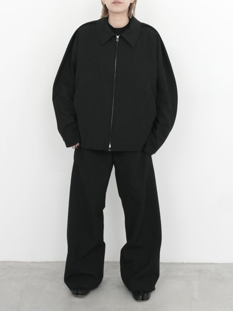 柔らかく構造的な二重織りのメランジ生地で作られた Uvas Trousers は、サイドエントリーのウェルト ポケットが特徴で、プリーツで部分的に隠されており微妙に幅広のシルエットを実現しています。背面のウェルトポケットは角張ったフラップの下に隠されており、ブランドの特徴的なデザイン言語を反映しています。