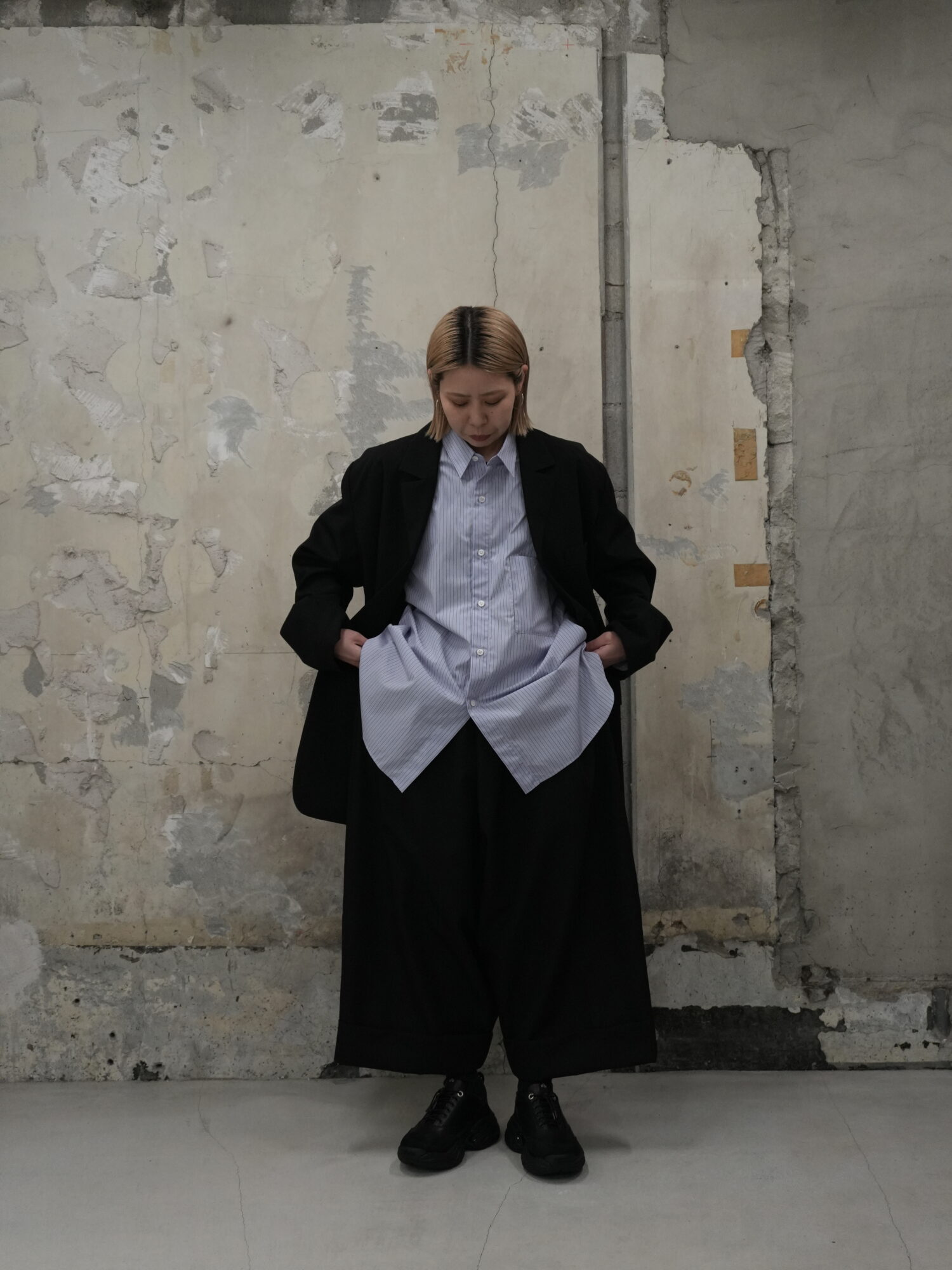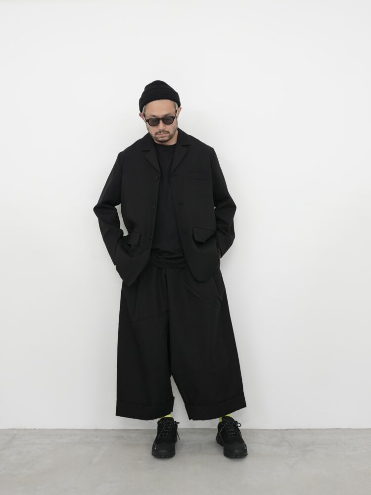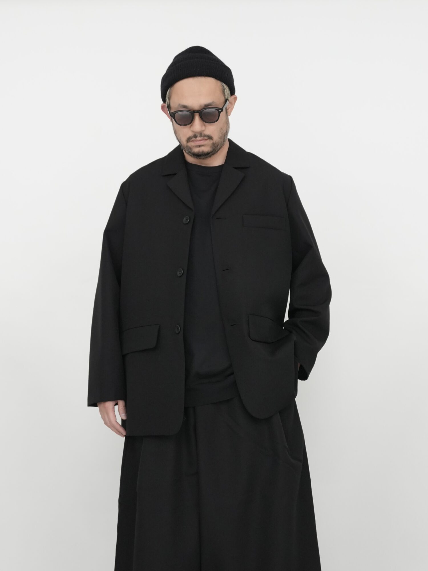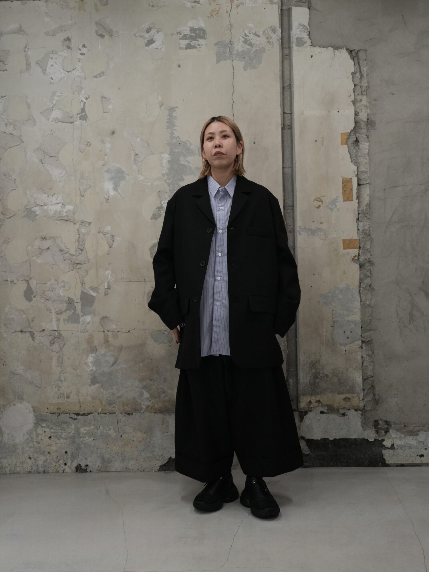 「Artist」は、ミニマルなロングラインのシングルブレストジャケット。大きめの胸ポケットのウェルトと、伝統的なテーラードポケットを拡張したデザインがクラシックな印象を残しつつ、わずかに調整されたプロポーションで新鮮な表情を見せます。ゆとりのある襟とラペルは高めの位置で折り返され、縦のラインを強調しながら全体のシルエットを伸びやかに引き立てます。
