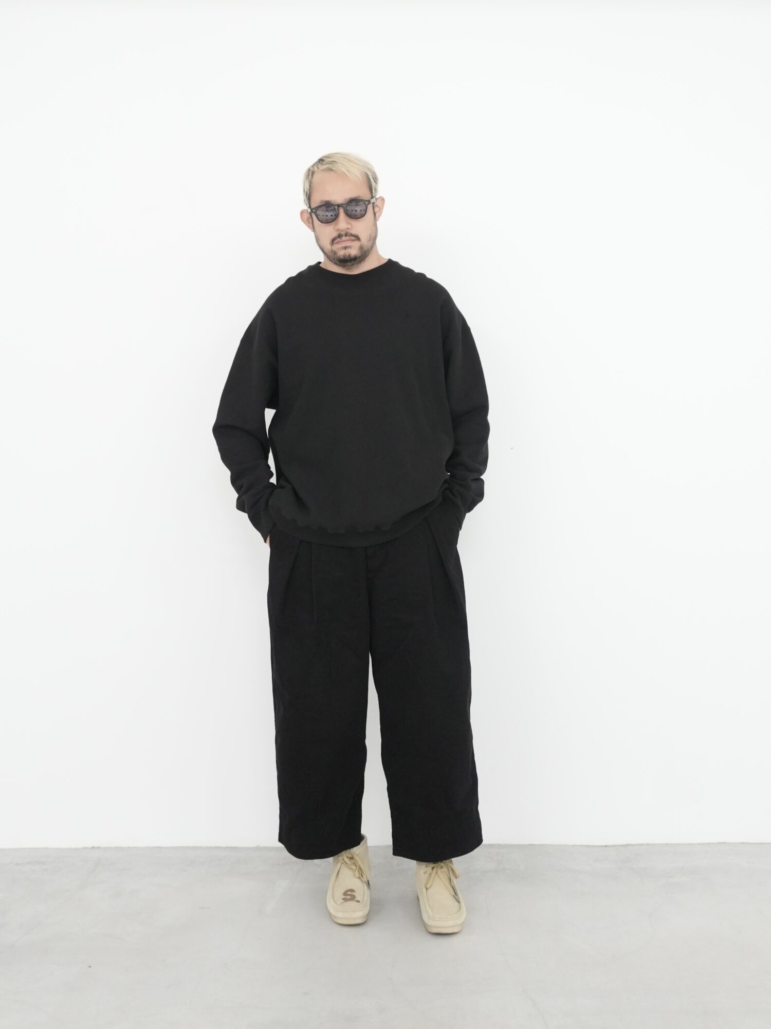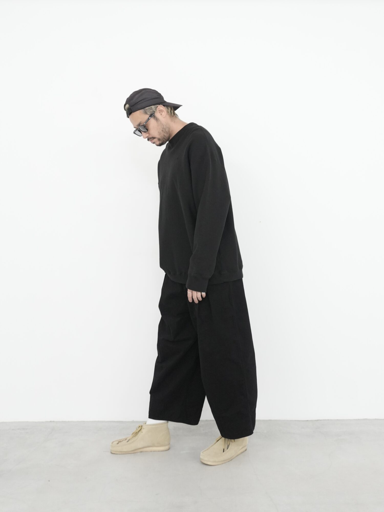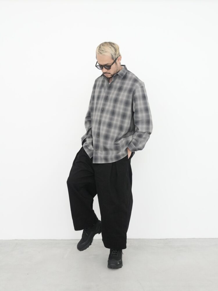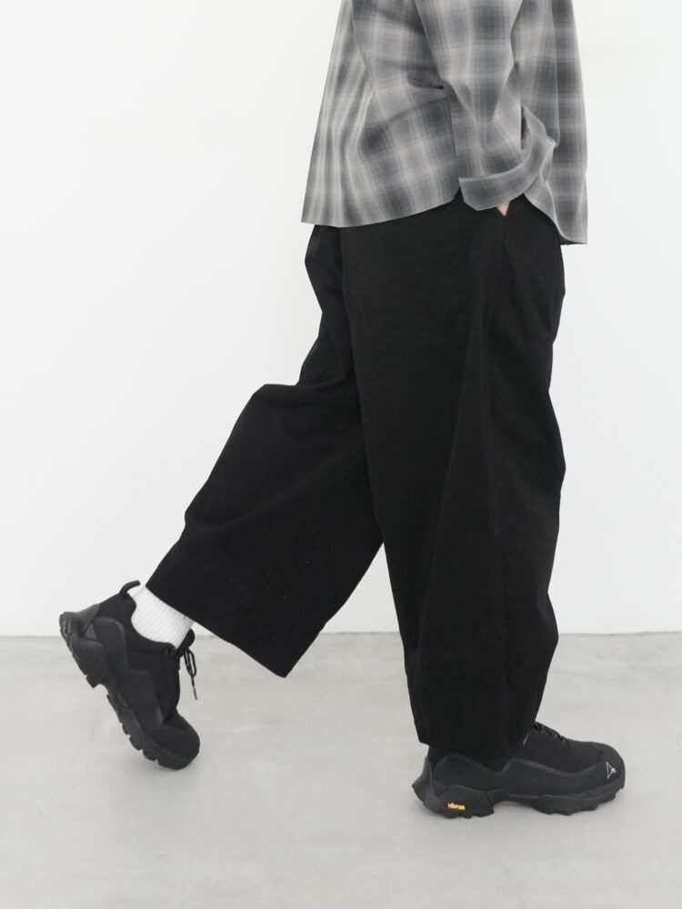 この実用的なトラウザーは、新しいワークツイルコットンを使用し、Toogoodの特注カラーでガーメントダイ加工を施しています。中厚手の生地はウォッシュ加工が施され、柔らかな手触りです。Etcherは、裾に向かって細くなるクロップド丈のワイドレッグトラウザーです。フロントはフラットなウエストバンド、バックは伸縮性があり、フィット感を高めています。フロントのプリーツと膝のダーツがシルエットを際立たせます。