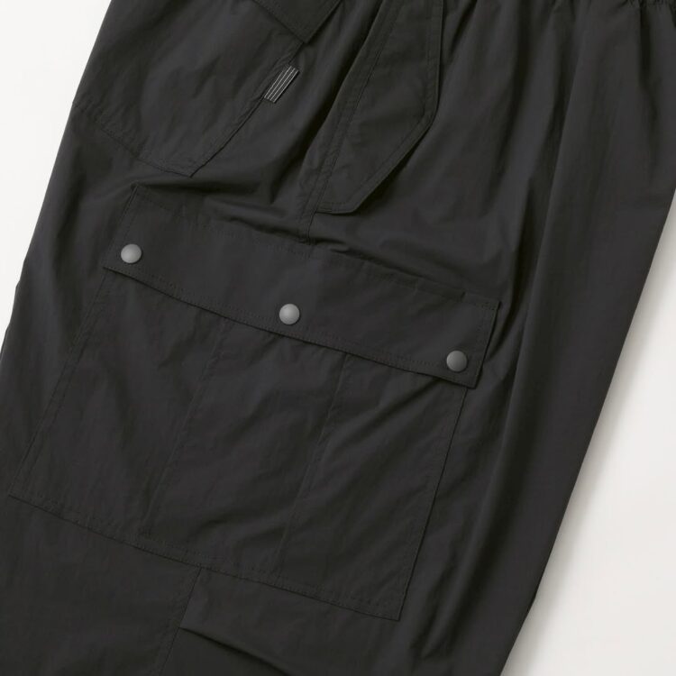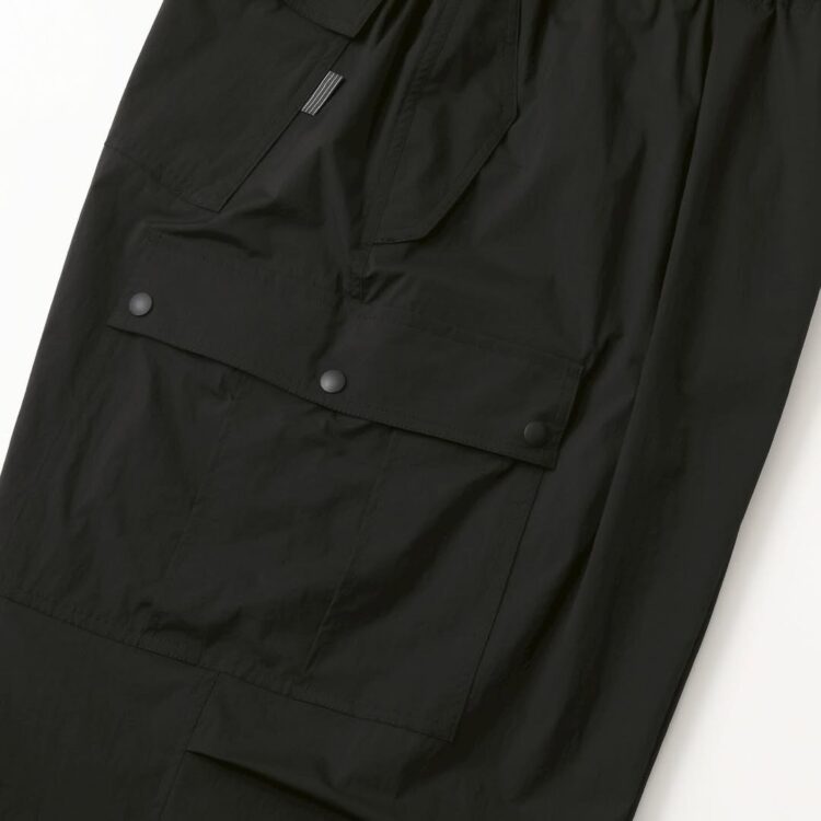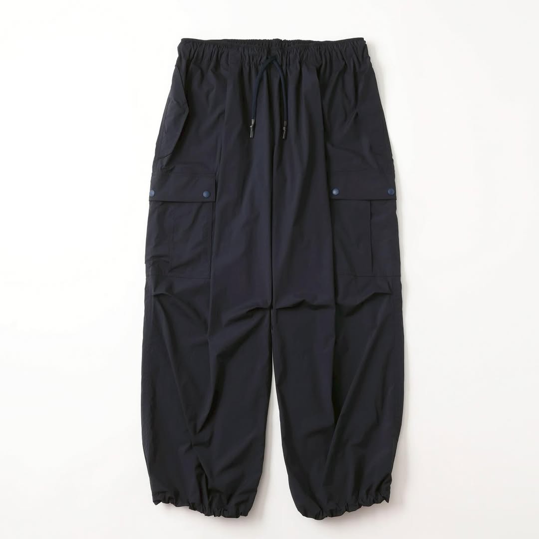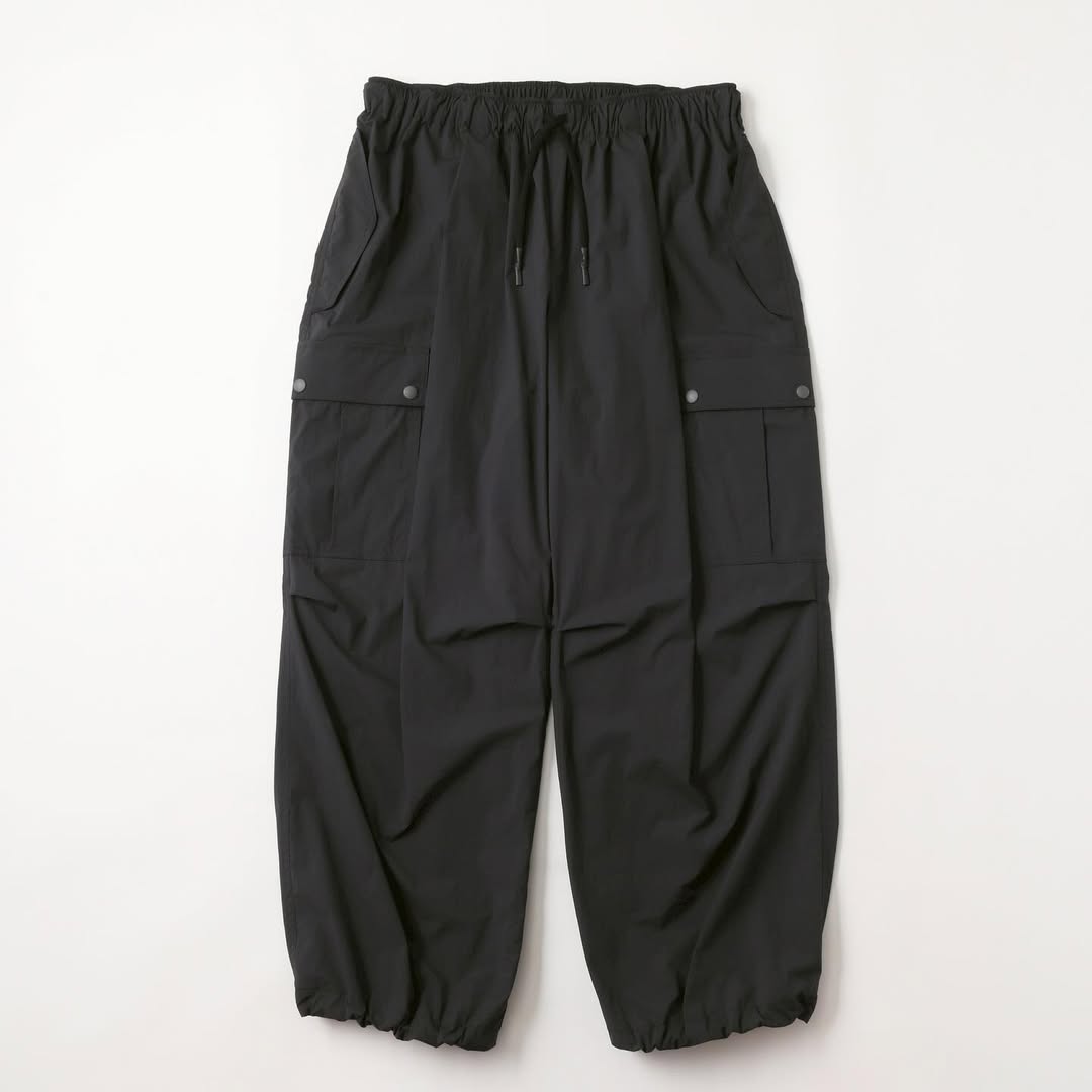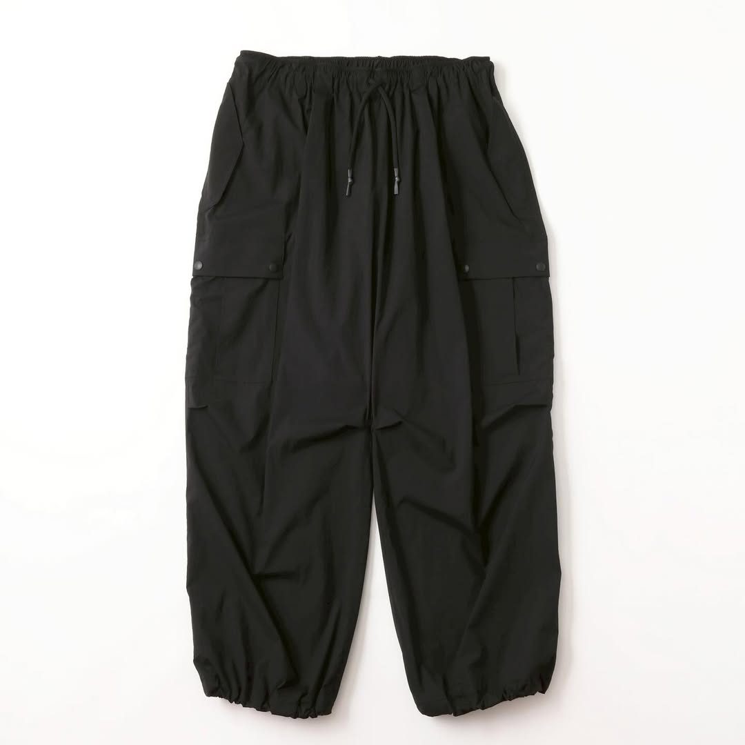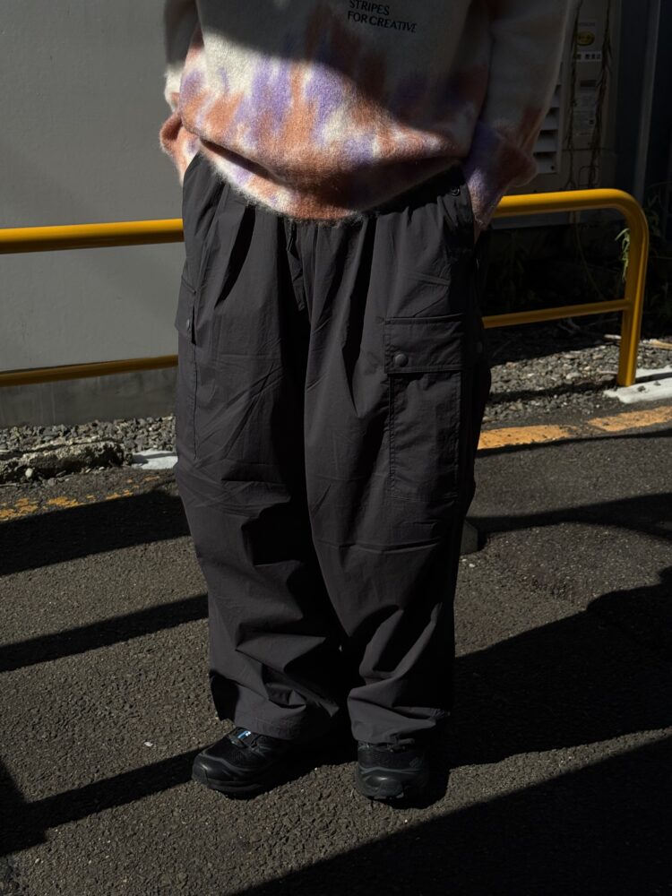 S.F.C (エスエフシー)のPARACHUTE CARGO PANTS / CHARCOAL になります。SFC WIDE CARGO PANTSをベースに、膝回りを大きくアレンジし、ワタリから裾にかけてさらにボリューム感のあるシルエットにアップグレードさせたカーゴポケット付きパラシュートパンツ。素材は20Dのナイロンを使った、超軽量・強撥水・ハイストレッチ生地を使用。細い糸を使用しながらも高密度であるため、独特なハリ感・上質な見え方が特徴の素材です。