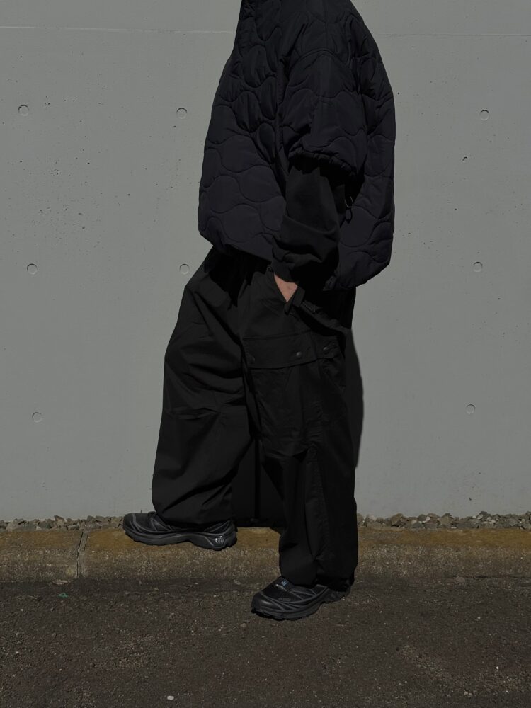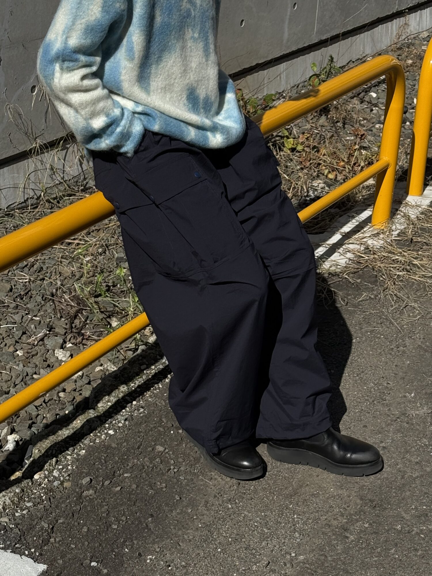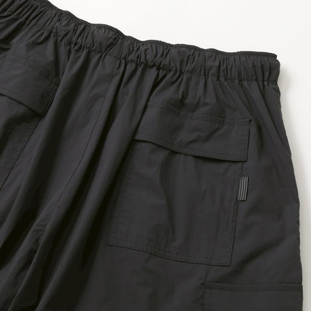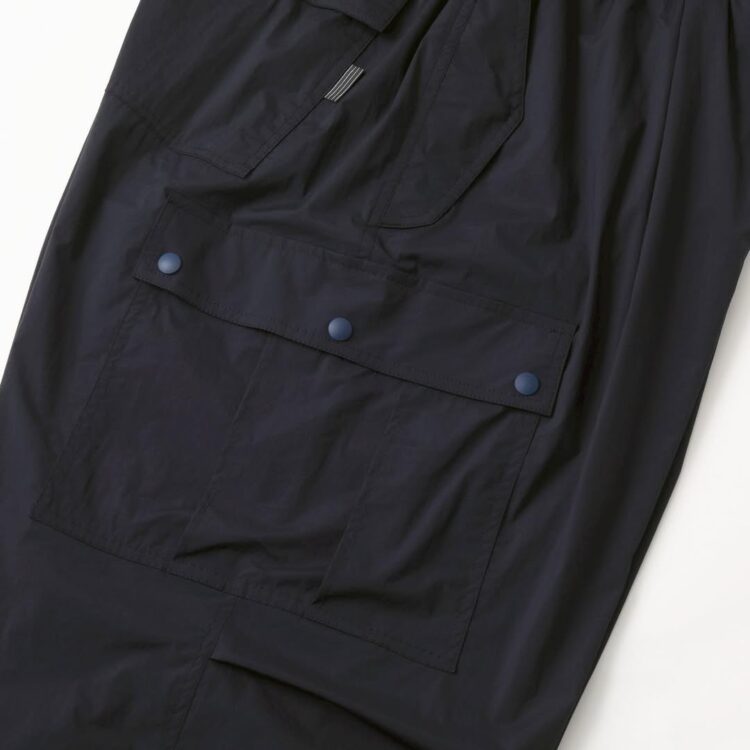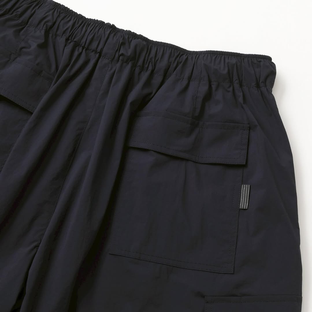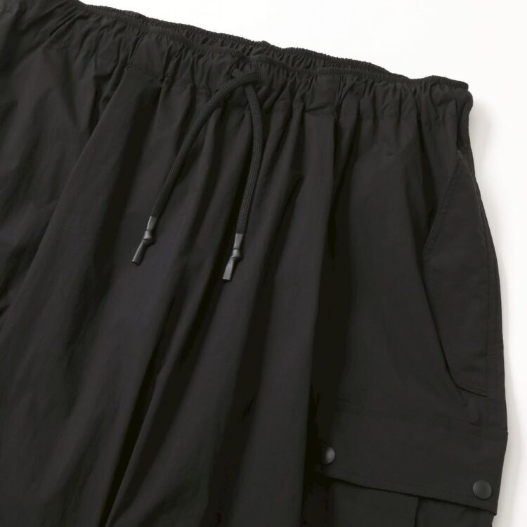 S.F.C (エスエフシー)のPARACHUTE CARGO PANTS / CHARCOAL になります。SFC WIDE CARGO PANTSをベースに、膝回りを大きくアレンジし、ワタリから裾にかけてさらにボリューム感のあるシルエットにアップグレードさせたカーゴポケット付きパラシュートパンツ。素材は20Dのナイロンを使った、超軽量・強撥水・ハイストレッチ生地を使用。細い糸を使用しながらも高密度であるため、独特なハリ感・上質な見え方が特徴の素材です。