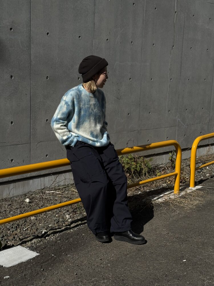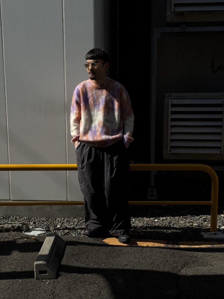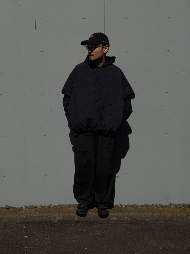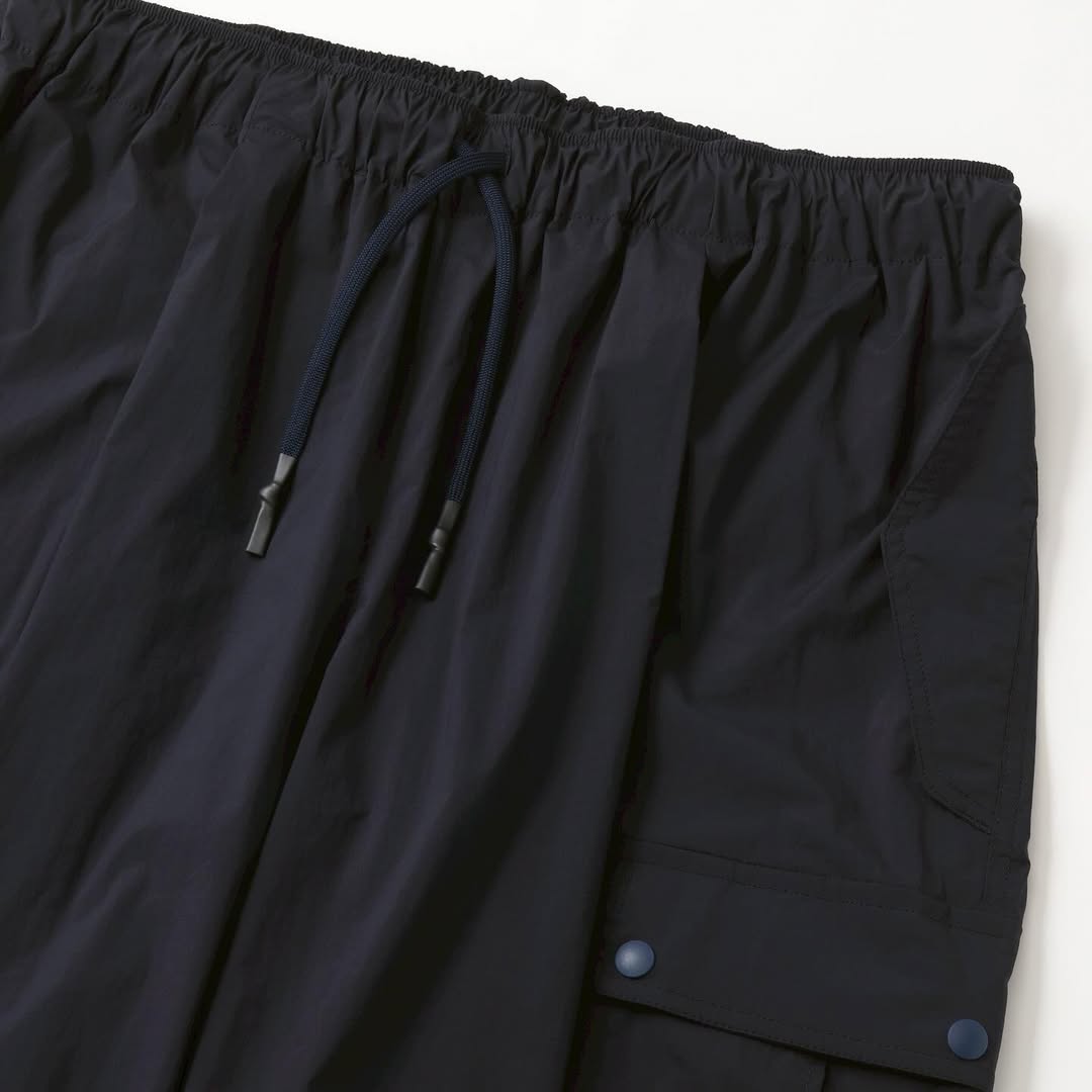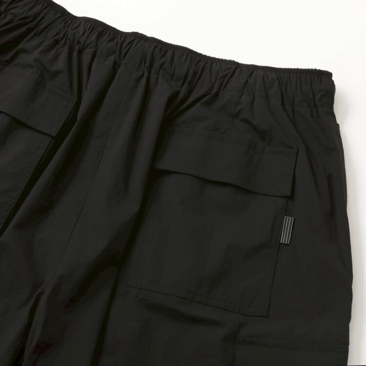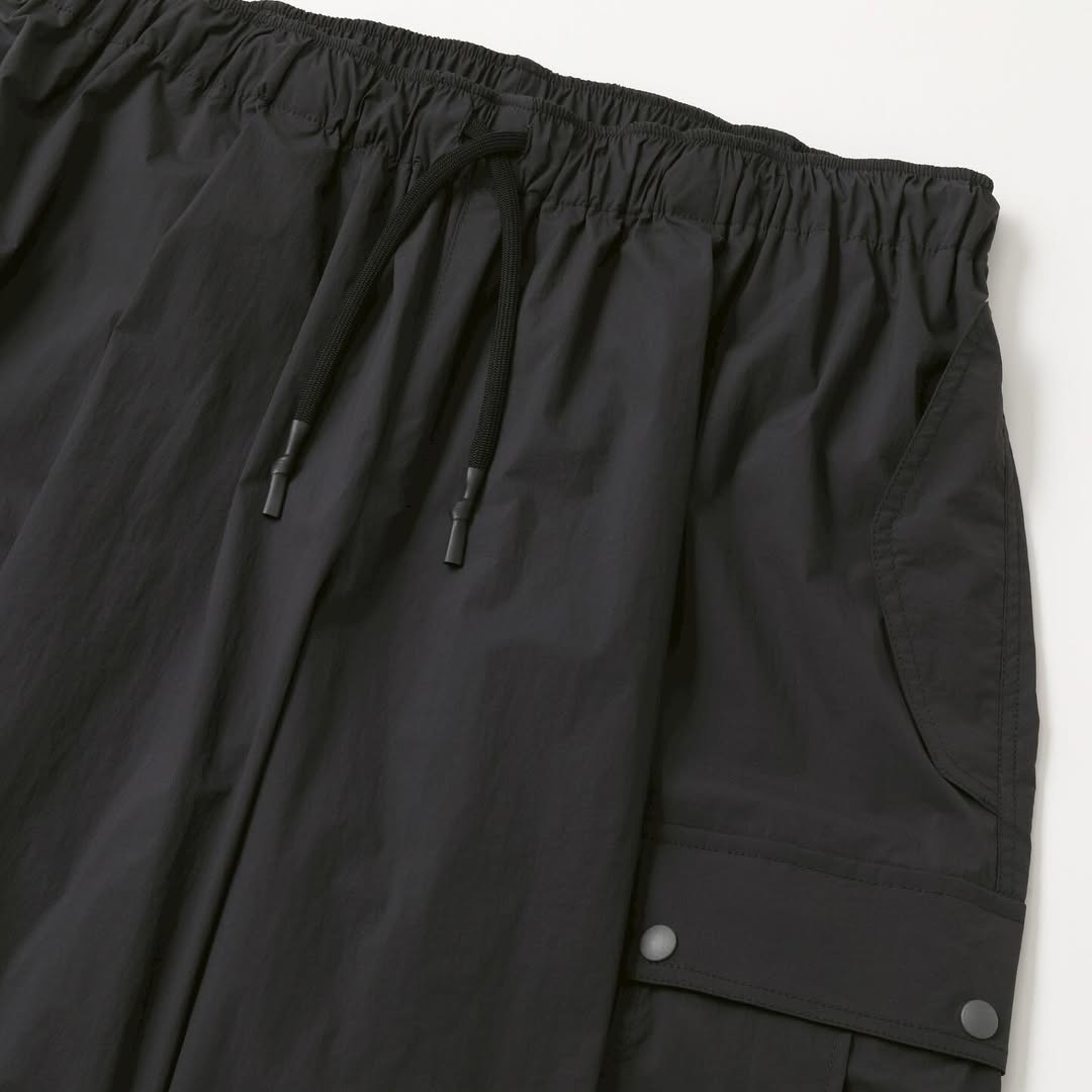 S.F.C (エスエフシー)のPARACHUTE CARGO PANTS / CHARCOAL になります。SFC WIDE CARGO PANTSをベースに、膝回りを大きくアレンジし、ワタリから裾にかけてさらにボリューム感のあるシルエットにアップグレードさせたカーゴポケット付きパラシュートパンツ。素材は20Dのナイロンを使った、超軽量・強撥水・ハイストレッチ生地を使用。細い糸を使用しながらも高密度であるため、独特なハリ感・上質な見え方が特徴の素材です。