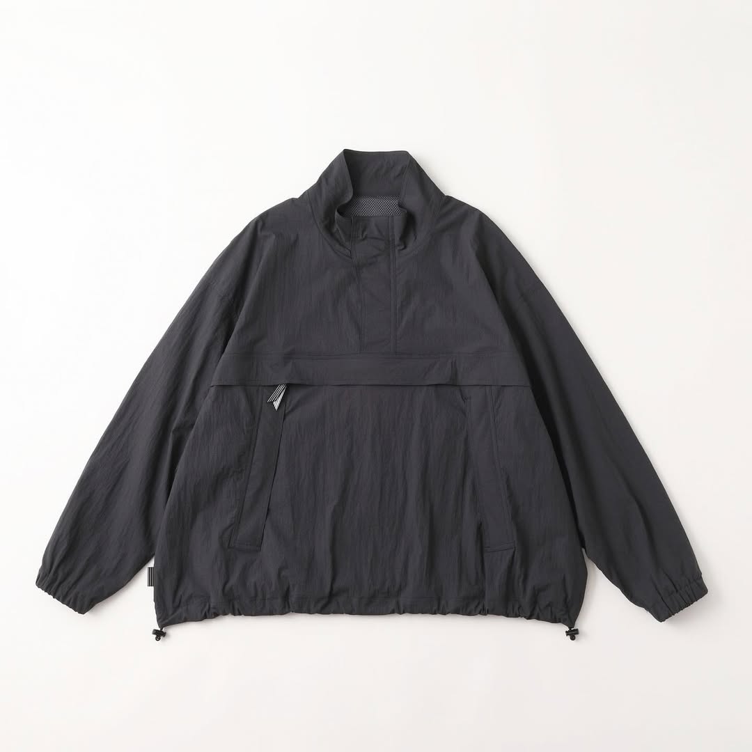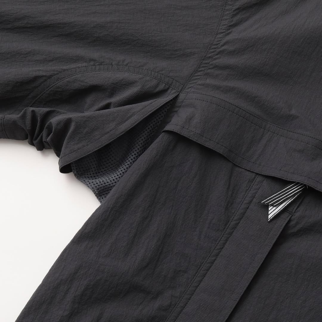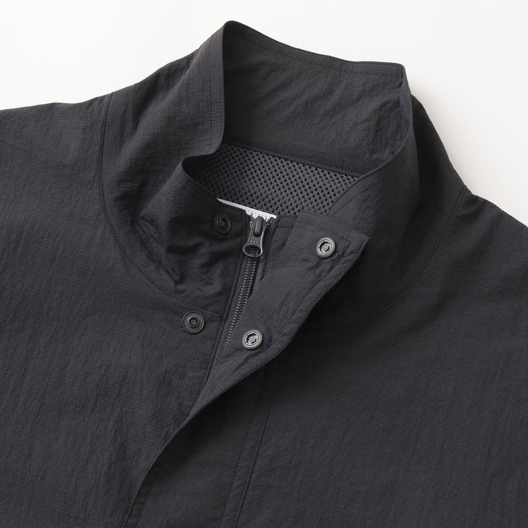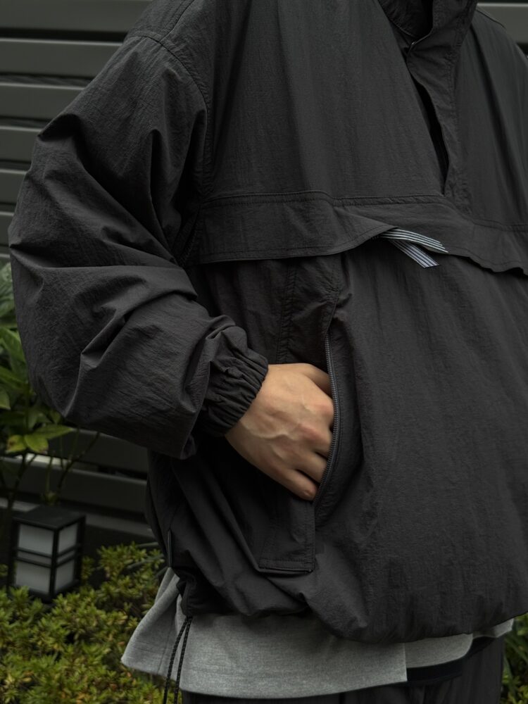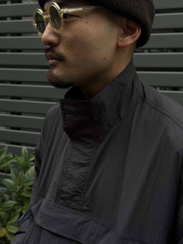 クラシカルなデザインでありながら、背中、脇のベンチレーションなど機能的なディティールを加えたナイロンANORAK。素材はタテ15D、 ヨコ20Dナイロン使用した超軽量ストレッチ生地を使用。ナイロンとコットンを混紡しワッシャー加工を施す事で、シボ感のあるドライタッチとシャリ感を持たせた独特なナイロン素材です。