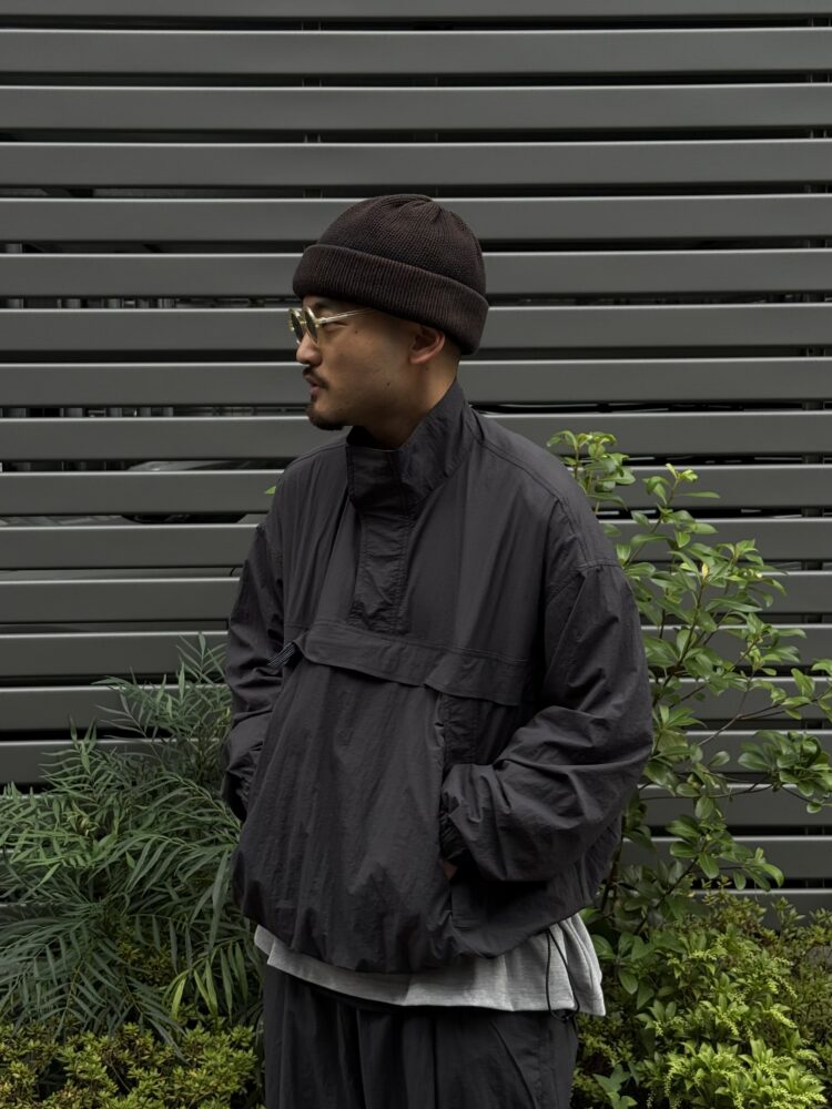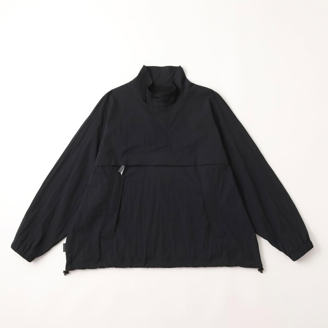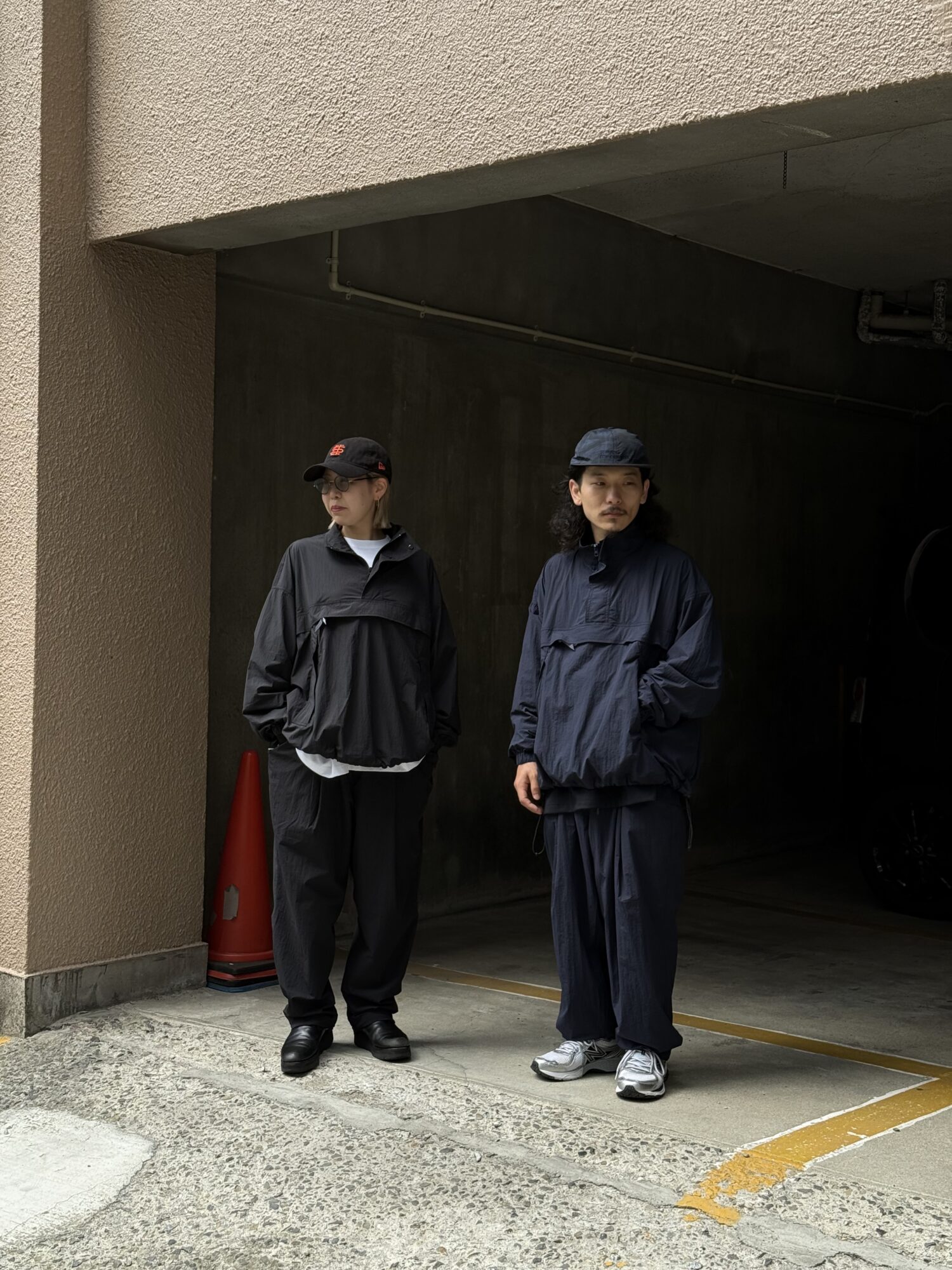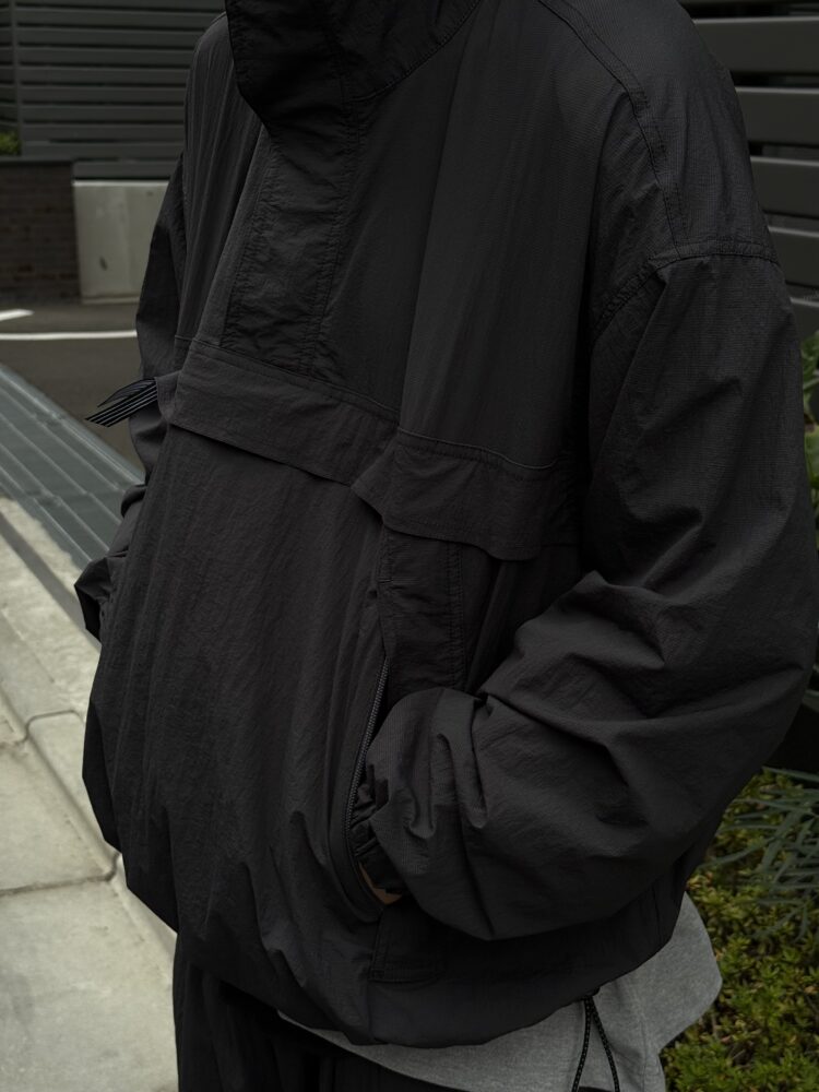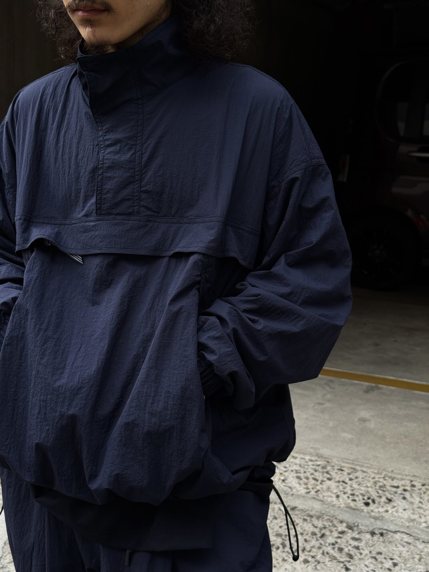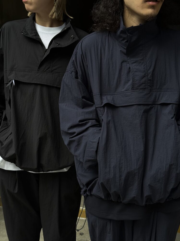 クラシカルなデザインでありながら、背中、脇のベンチレーションなど機能的なディティールを加えたナイロンANORAK。素材はタテ15D、 ヨコ20Dナイロン使用した超軽量ストレッチ生地を使用。ナイロンとコットンを混紡しワッシャー加工を施す事で、シボ感のあるドライタッチとシャリ感を持たせた独特なナイロン素材です。