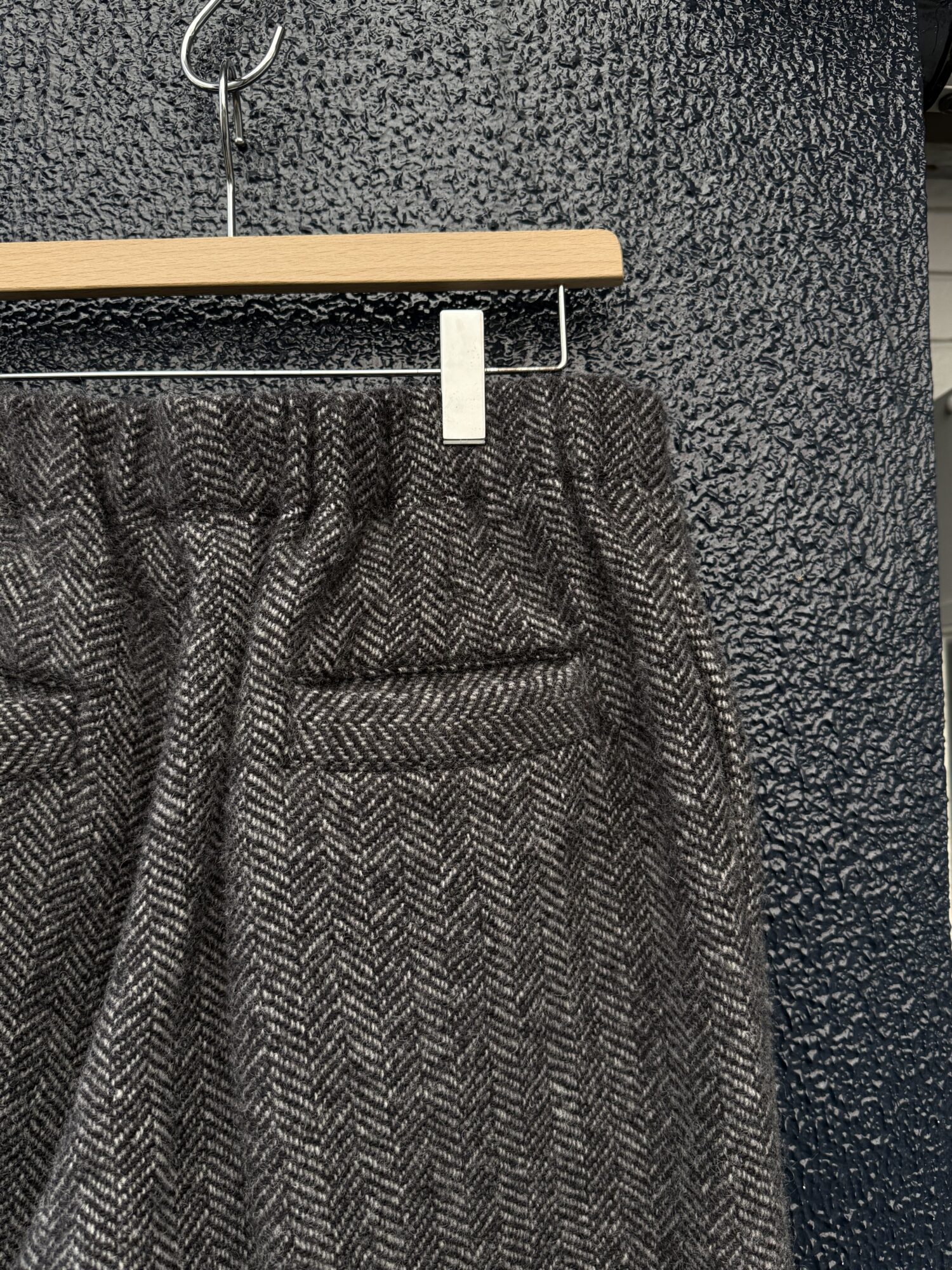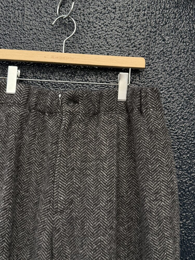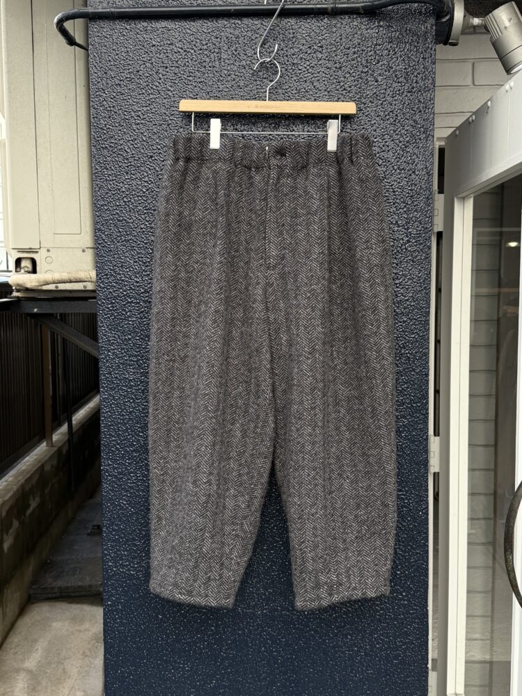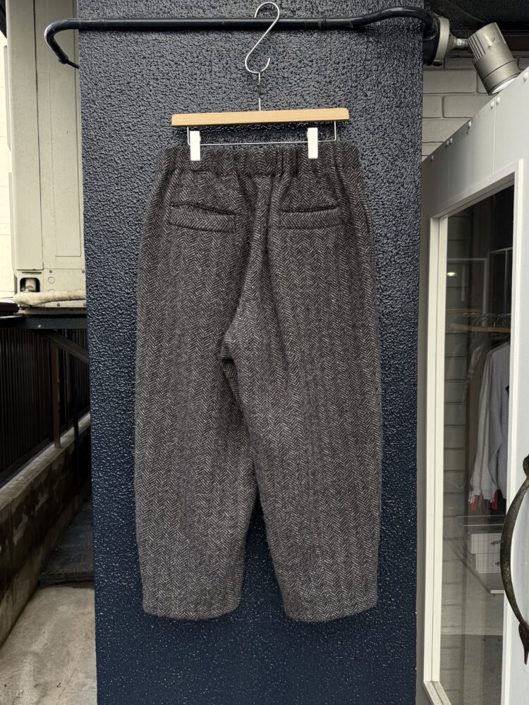 暖かさと軽さが特徴の上質なウール⽣地を使⽤したソフトな縮絨タイプのダーツパンツ。