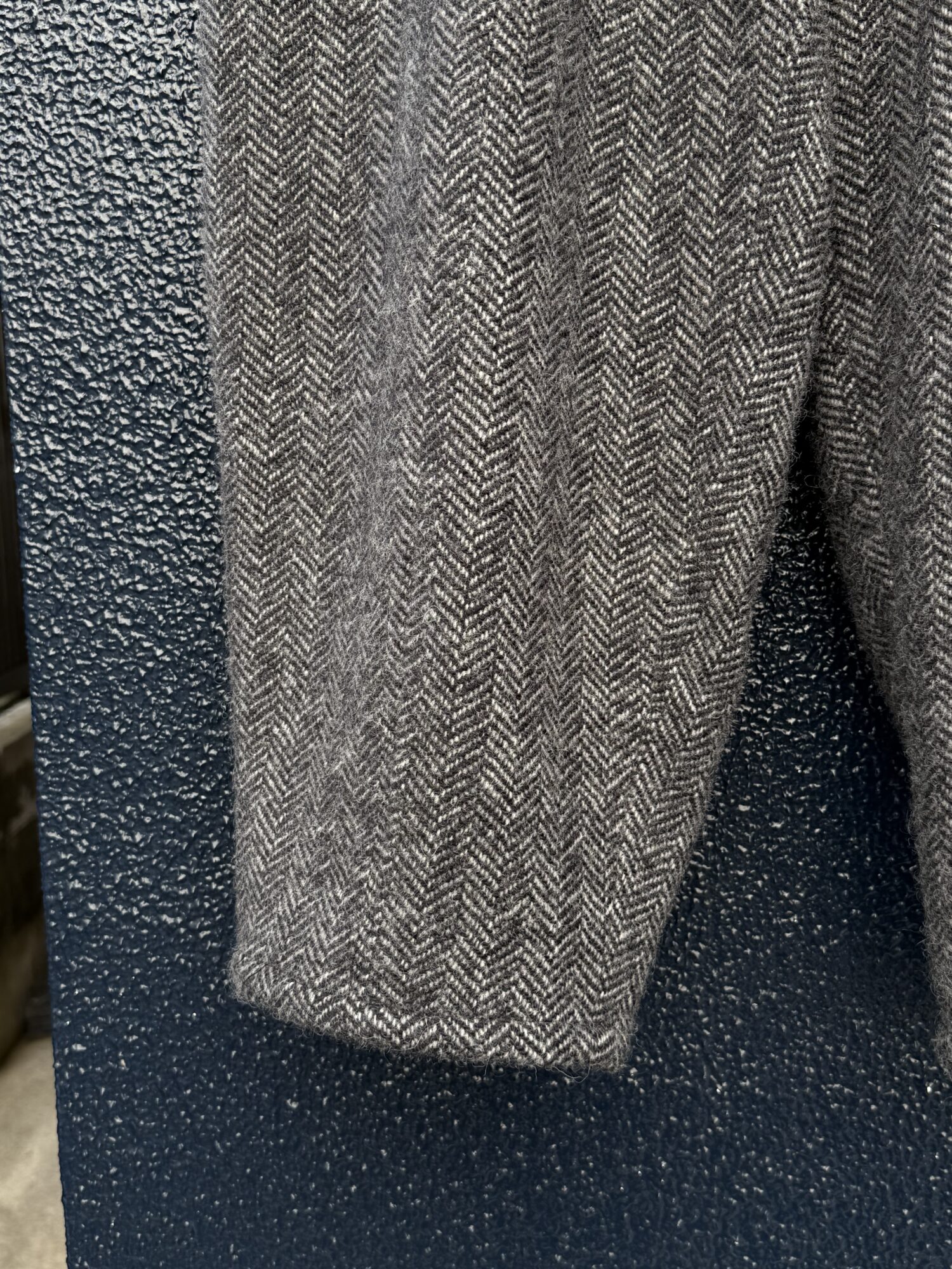 ウール100%の ⽣地をお 湯で 洗い 、熱と 圧⼒と摩擦で⾵合いを出している。⽬の詰まった素材は防⾵性に優れ、ソフトで伸縮性のある⾵合い。バルキー感のあるデザイン