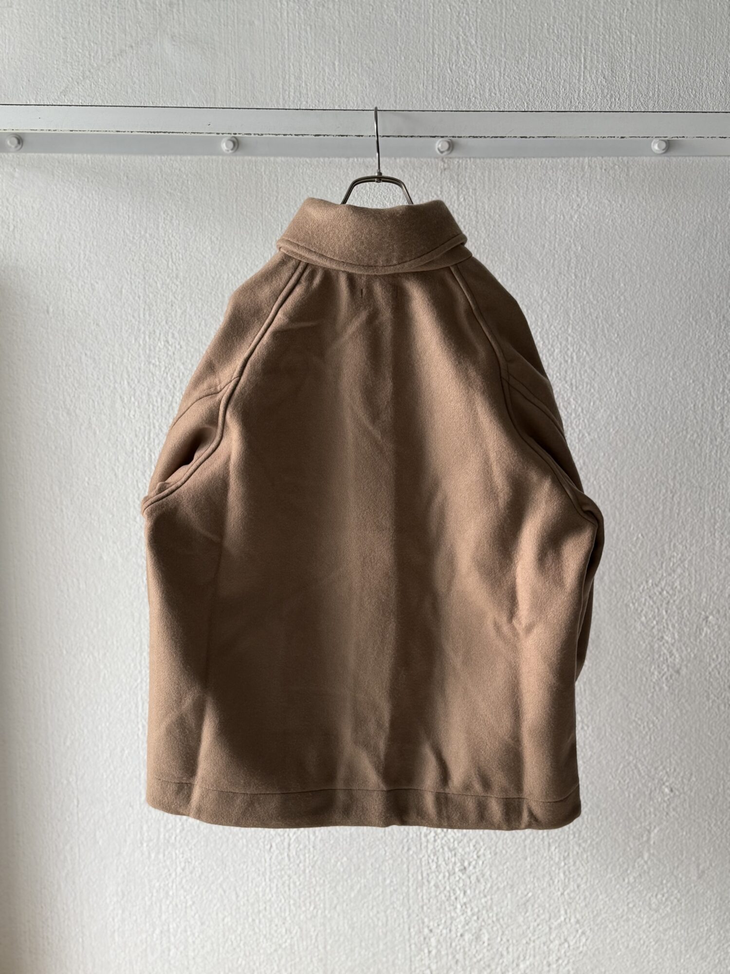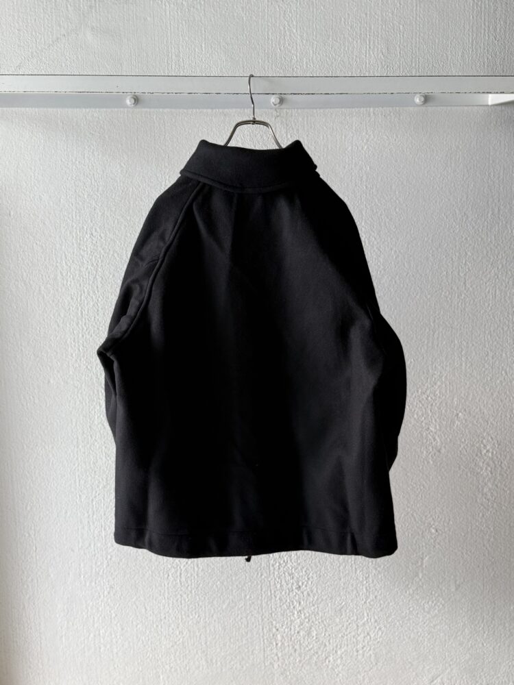 素材にはPureSuper100ラムウールを使⽤。この透明感のある素材を、⽇本⼀の収縮率を誇るバックグランドで丁寧に縮絨し、本格的なメルトン⽣地に仕上げている。