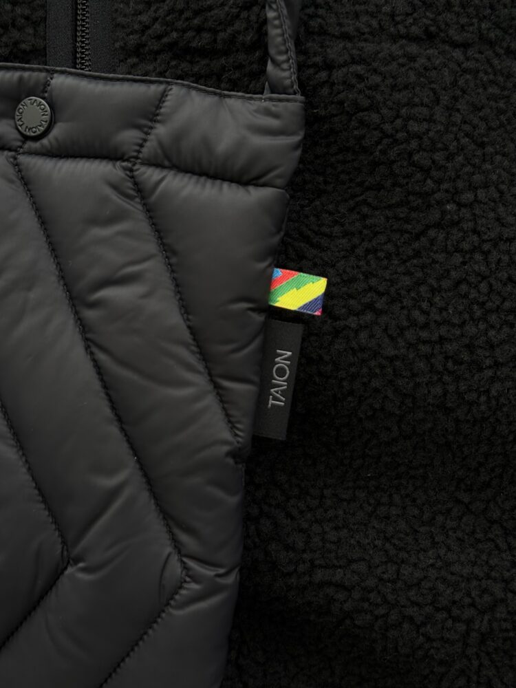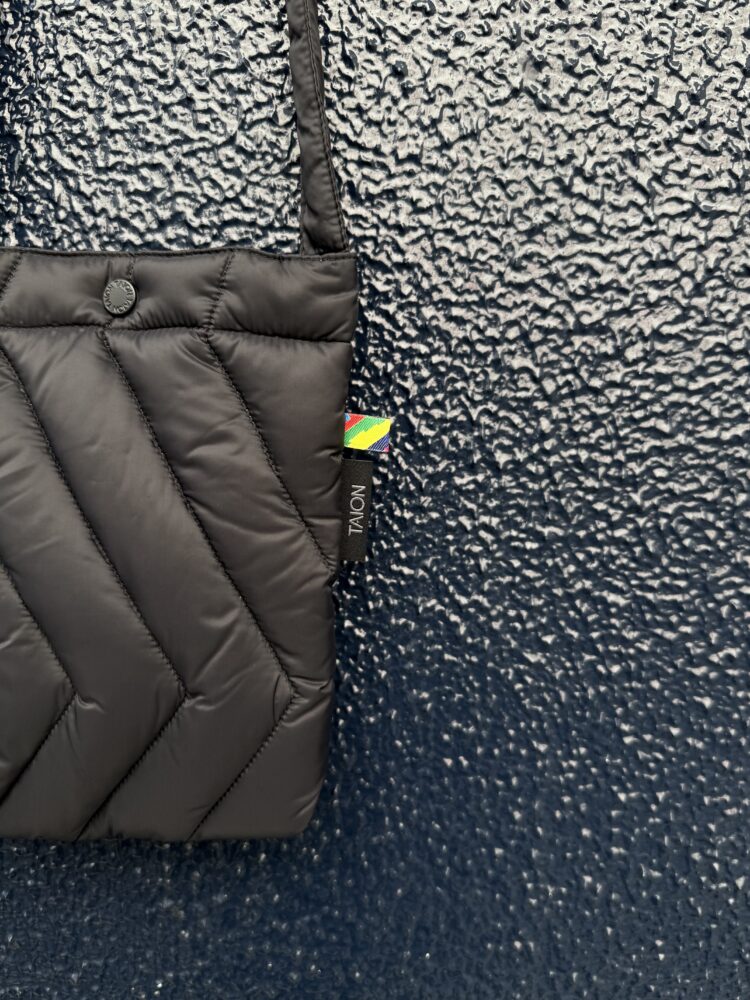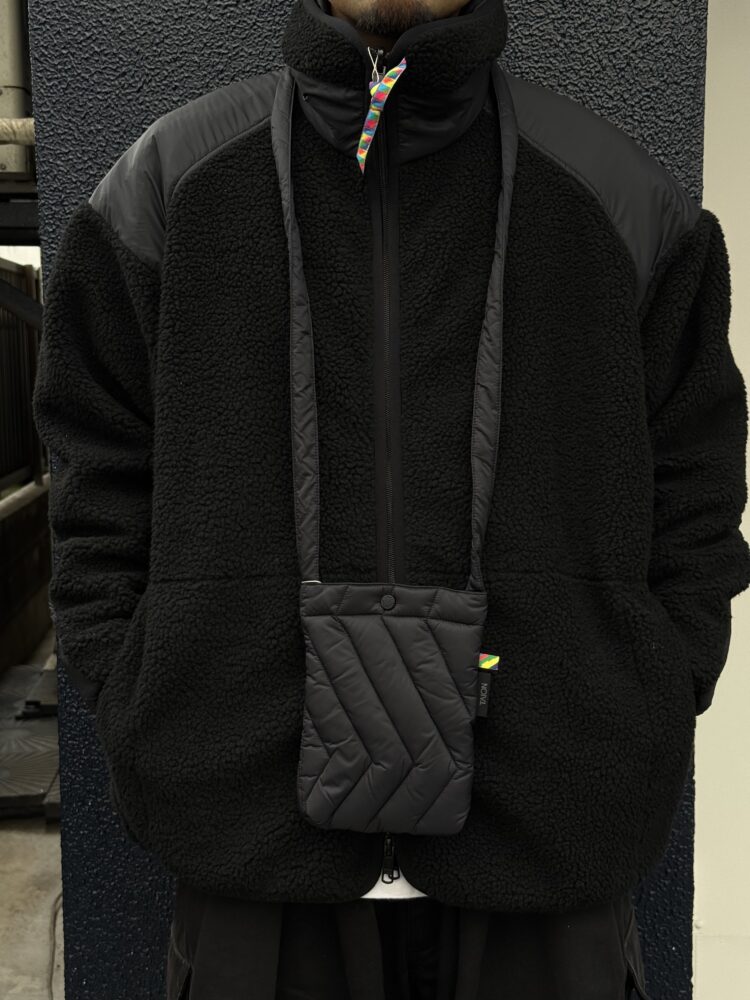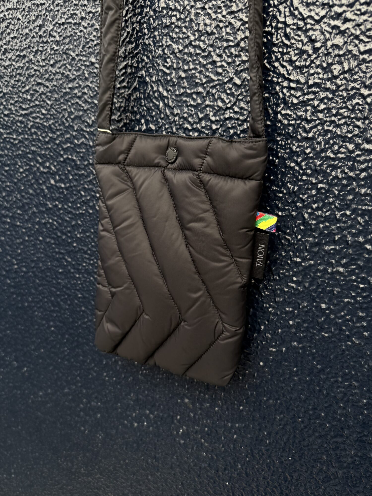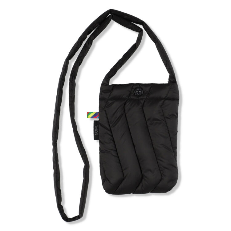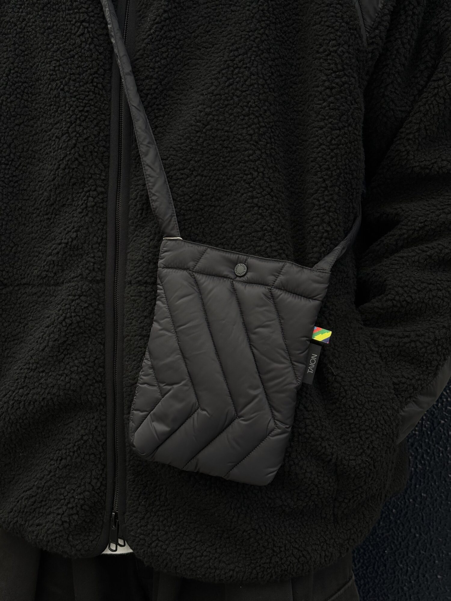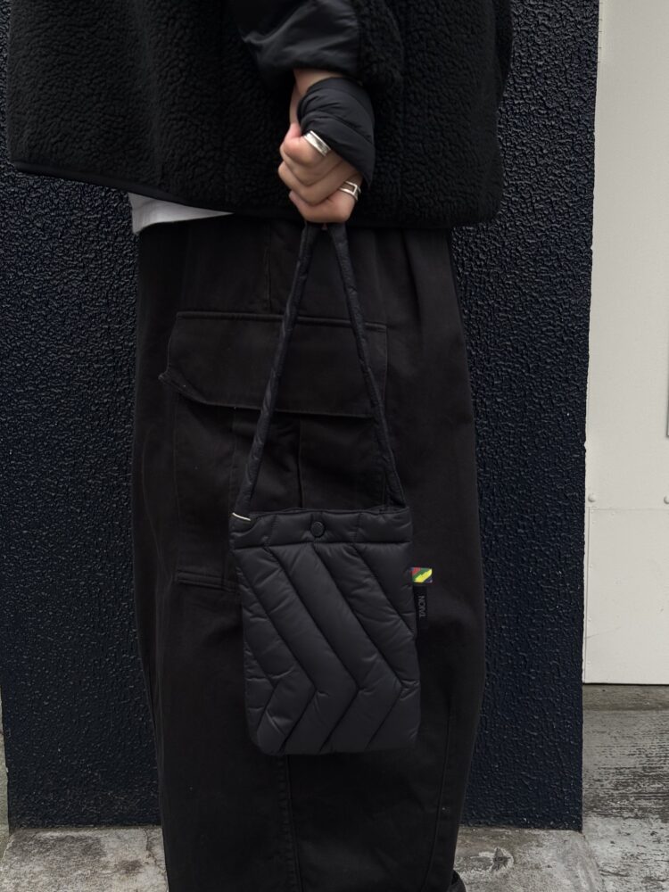 軽くてボリュームのあるダウンポーチはTAIONとのコラボアイテム。携帯電話や財布などを⼊れるのにちょうどいいサイズ感。ダウン特有のボリューム感が魅⼒。