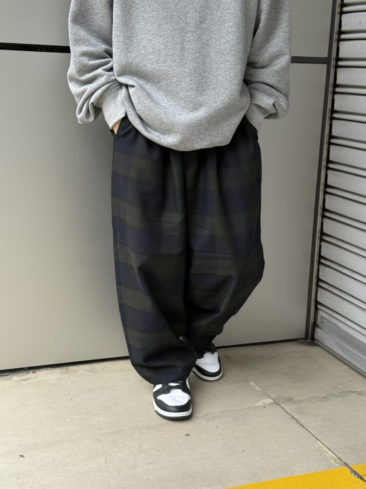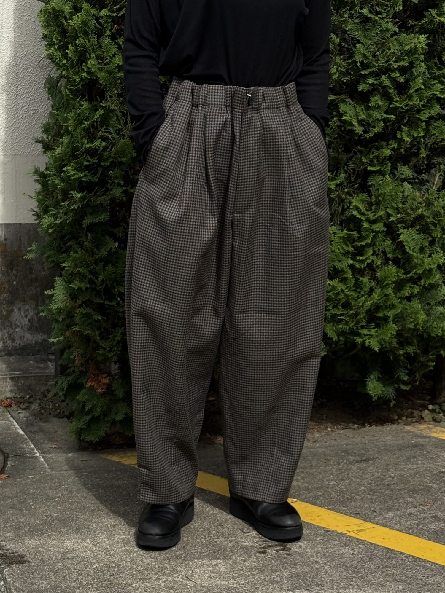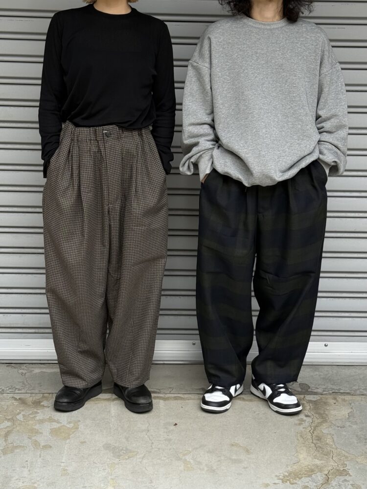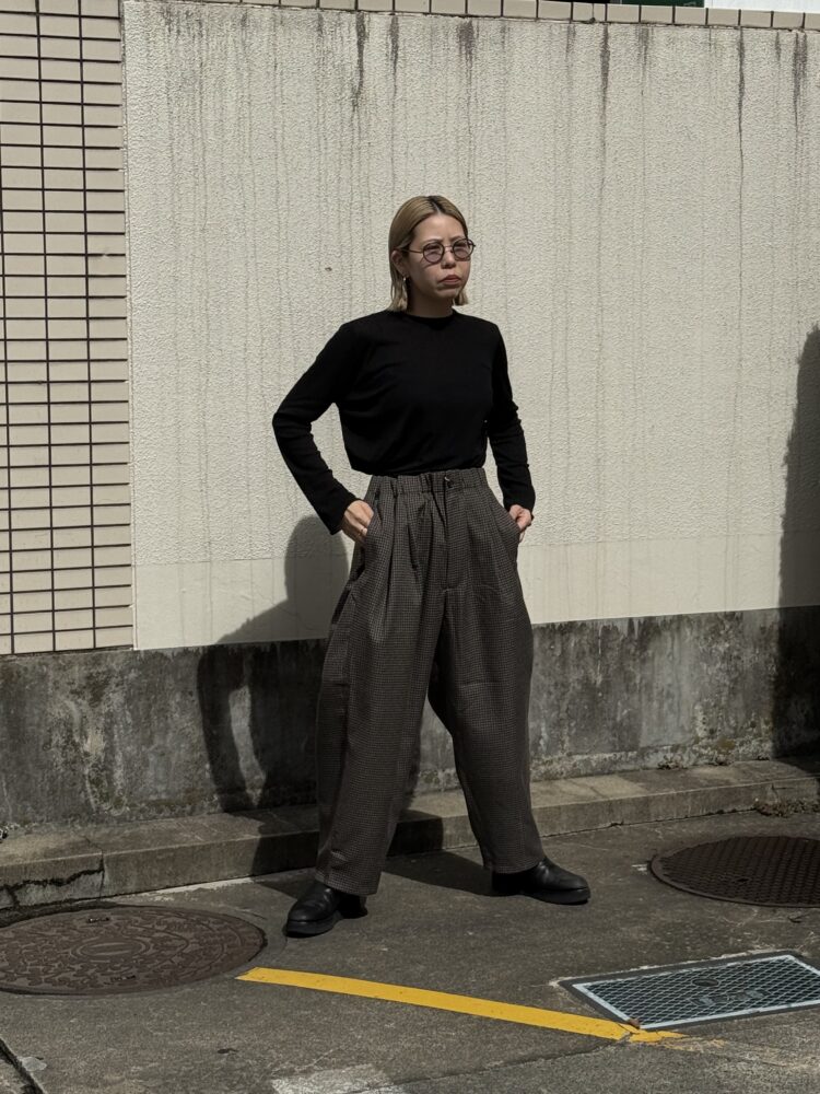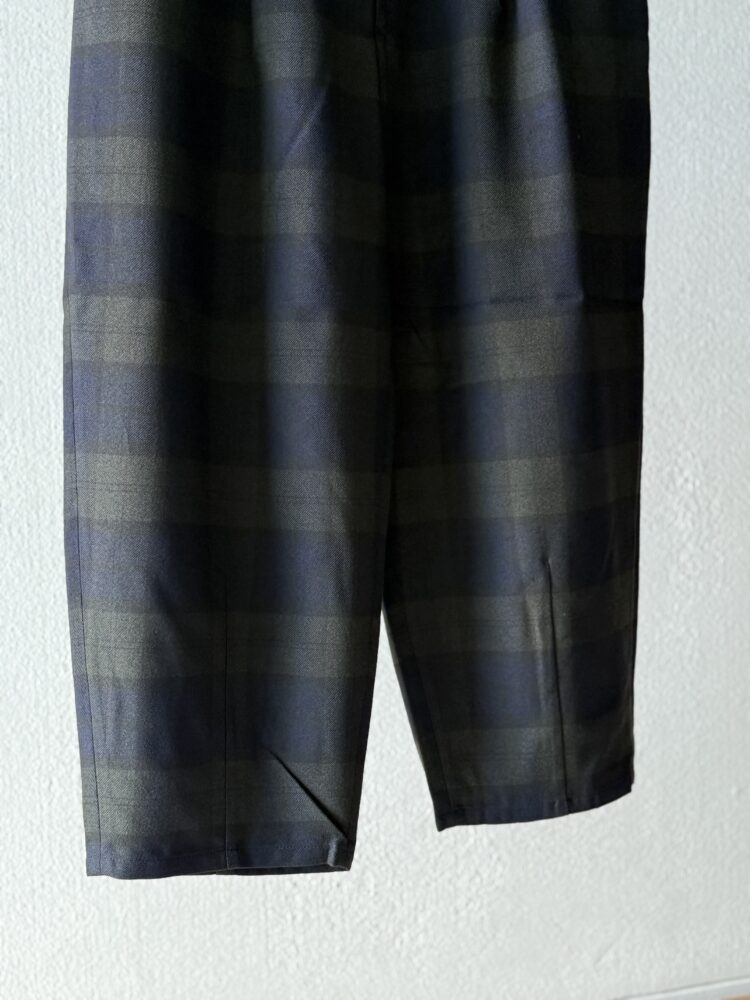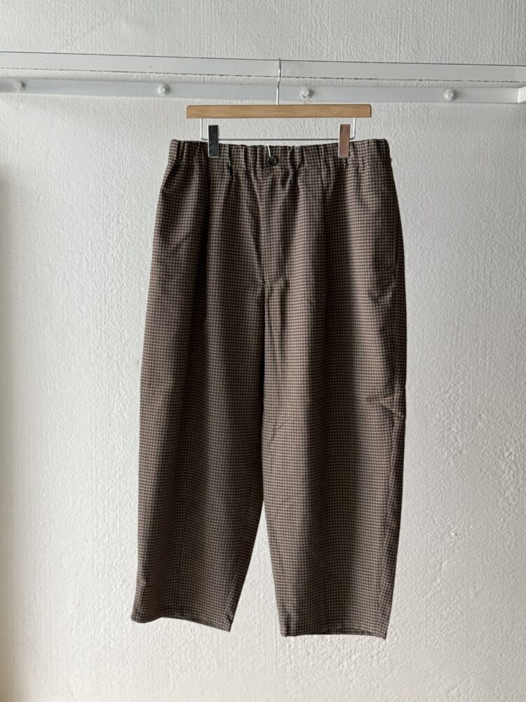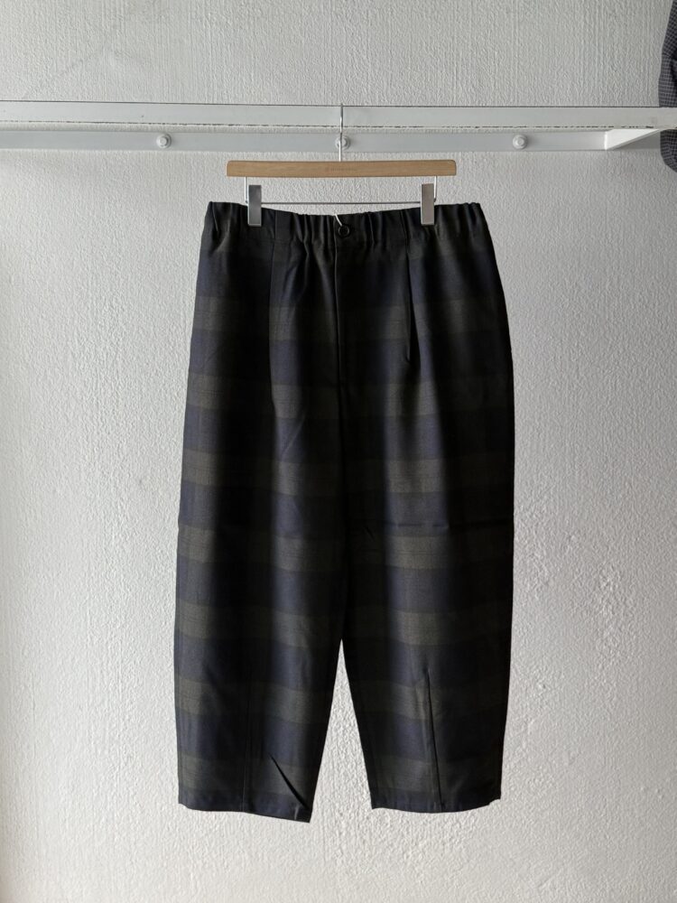 ウールの産地、尾州産のポリエステル100%テックツイードを使⽤したダーツパンツ。 シワになりにくく、イージーケアのパンツ。バルキー感のある⽴体的なデザイン