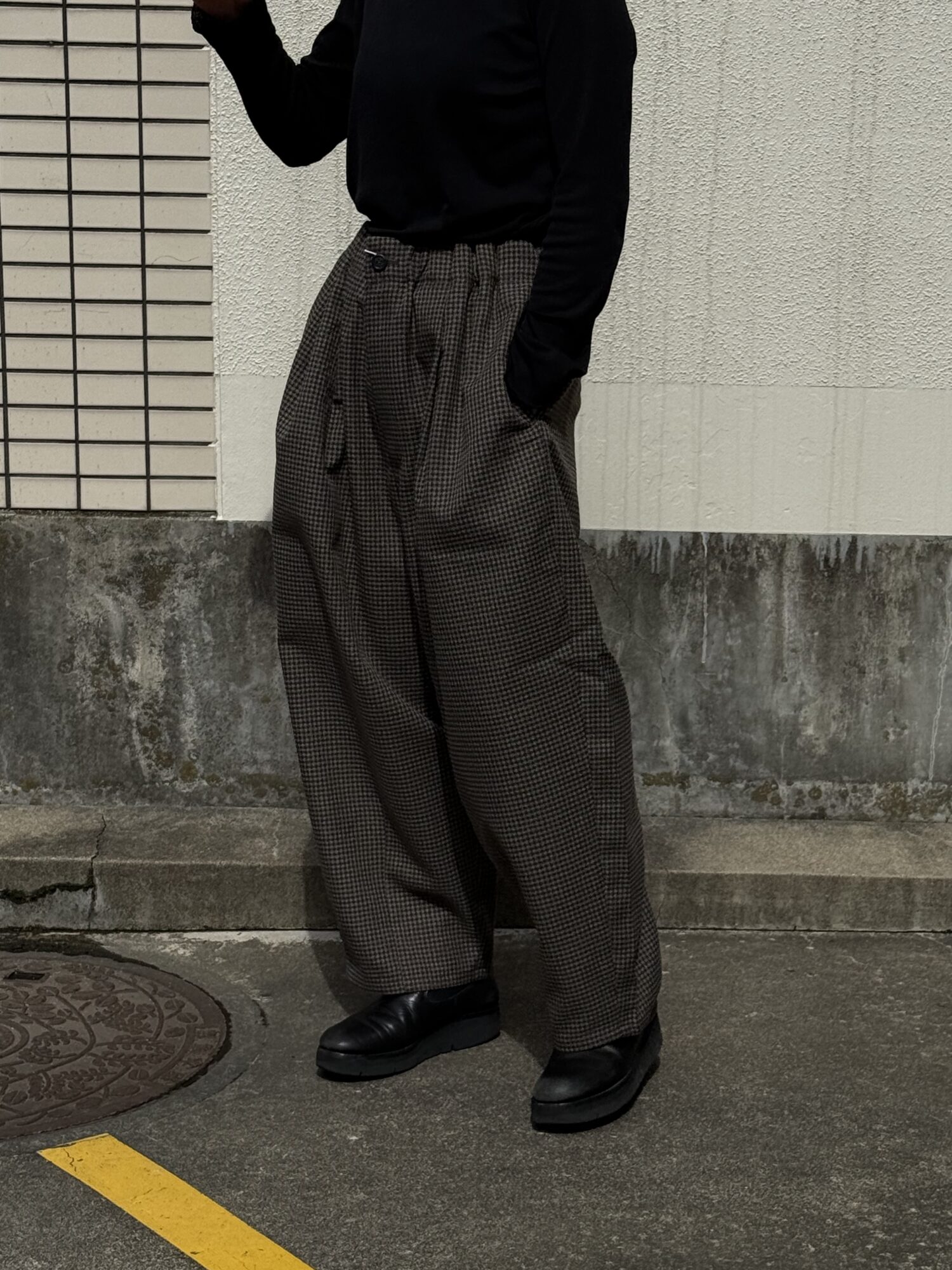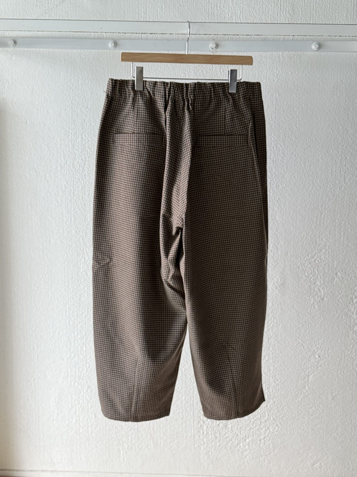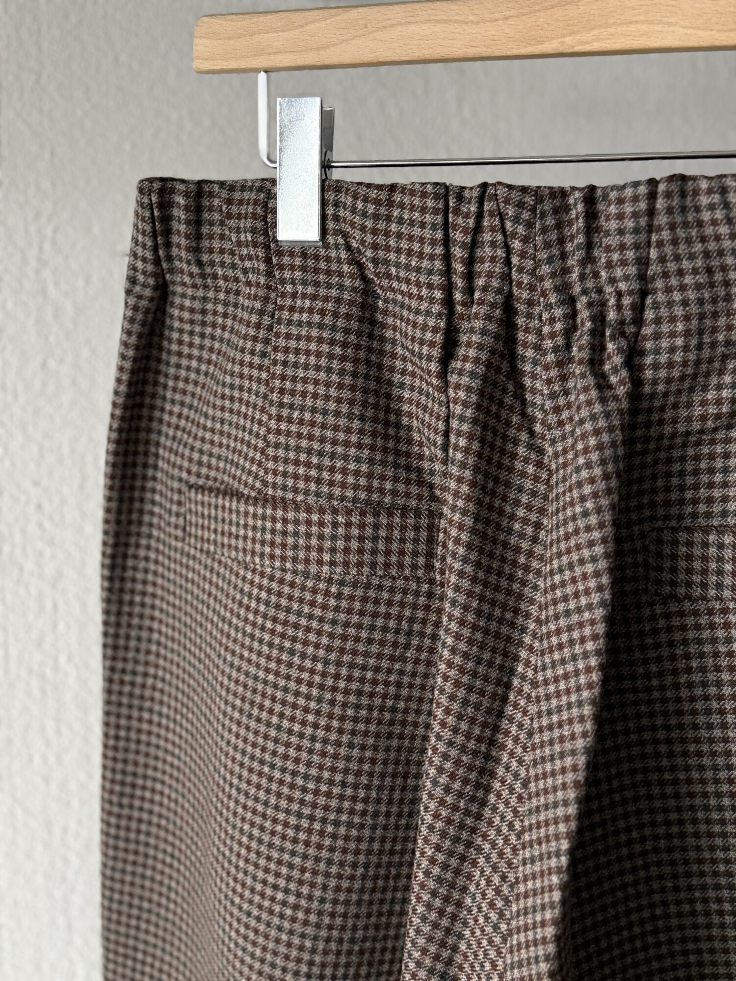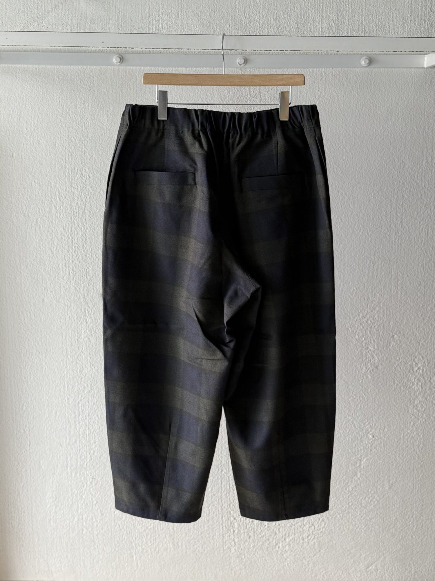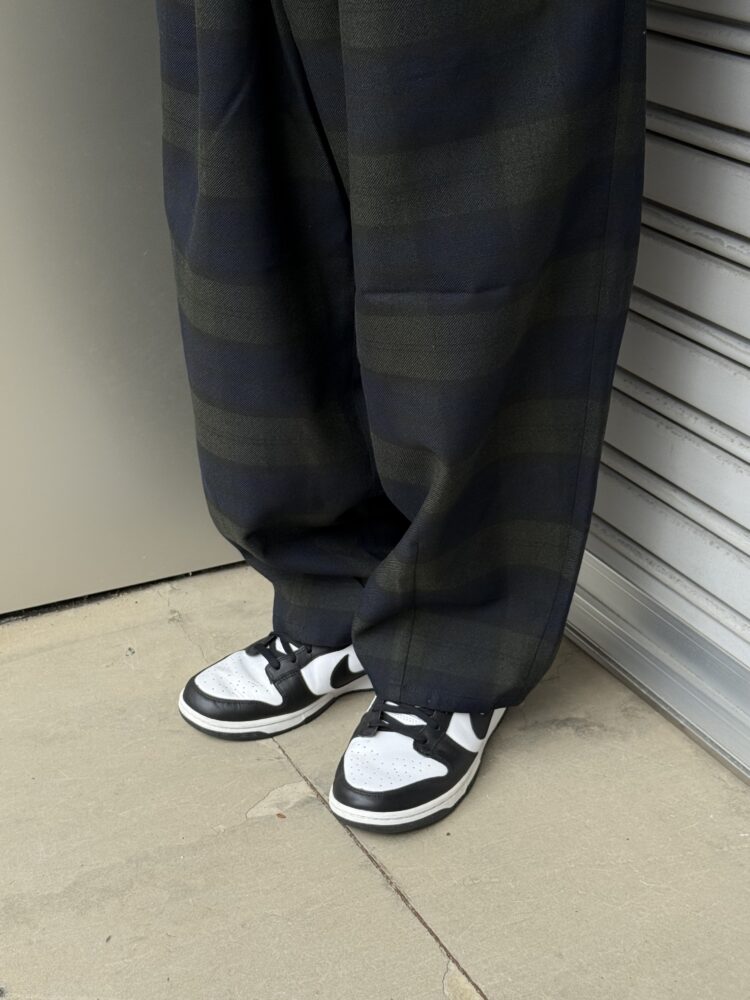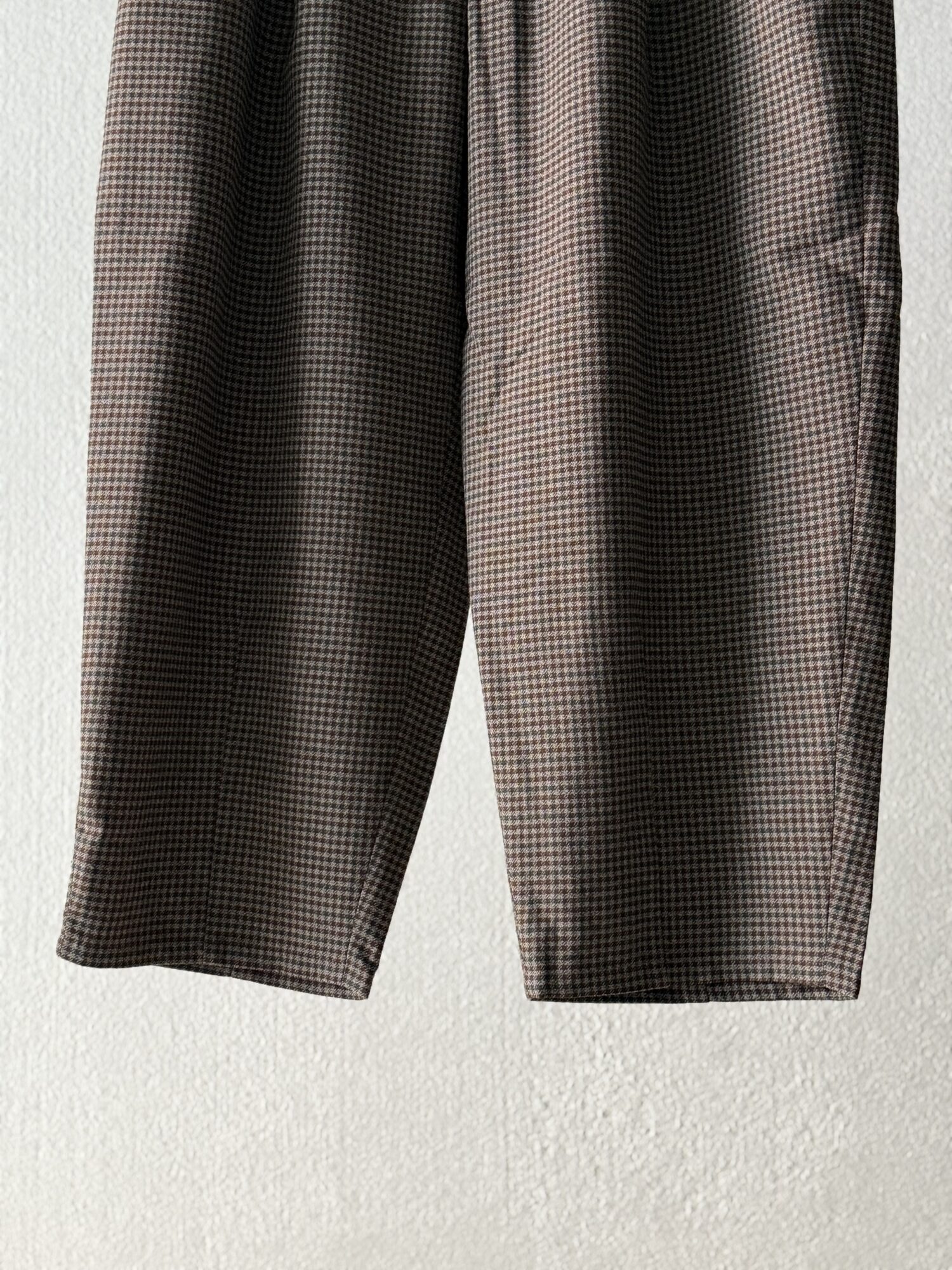 ウールの産地、尾州産のポリエステル100%テックツイードを使⽤したダーツパンツ。 シワになりにくく、イージーケアのパンツ。バルキー感のある⽴体的なデザイン