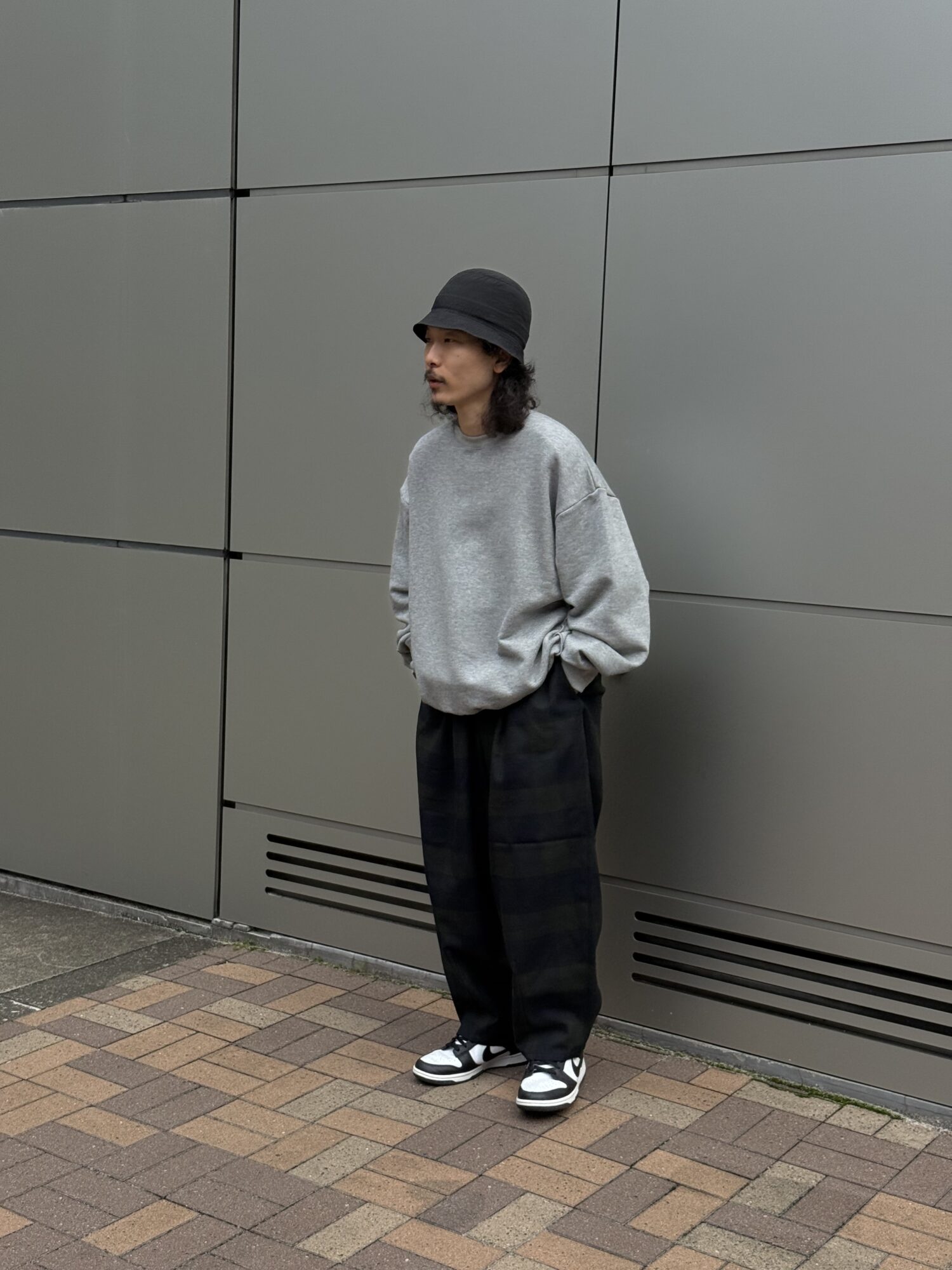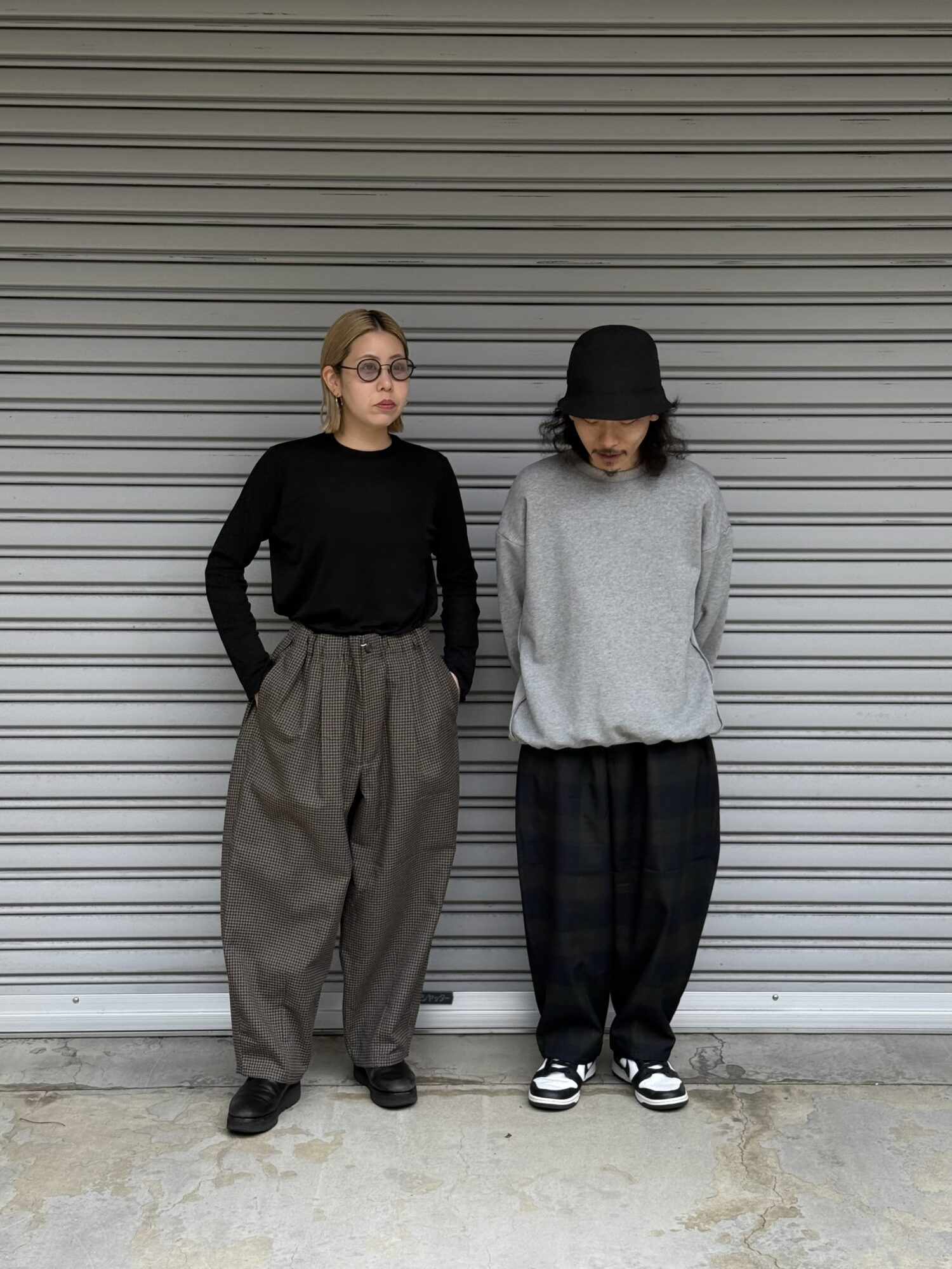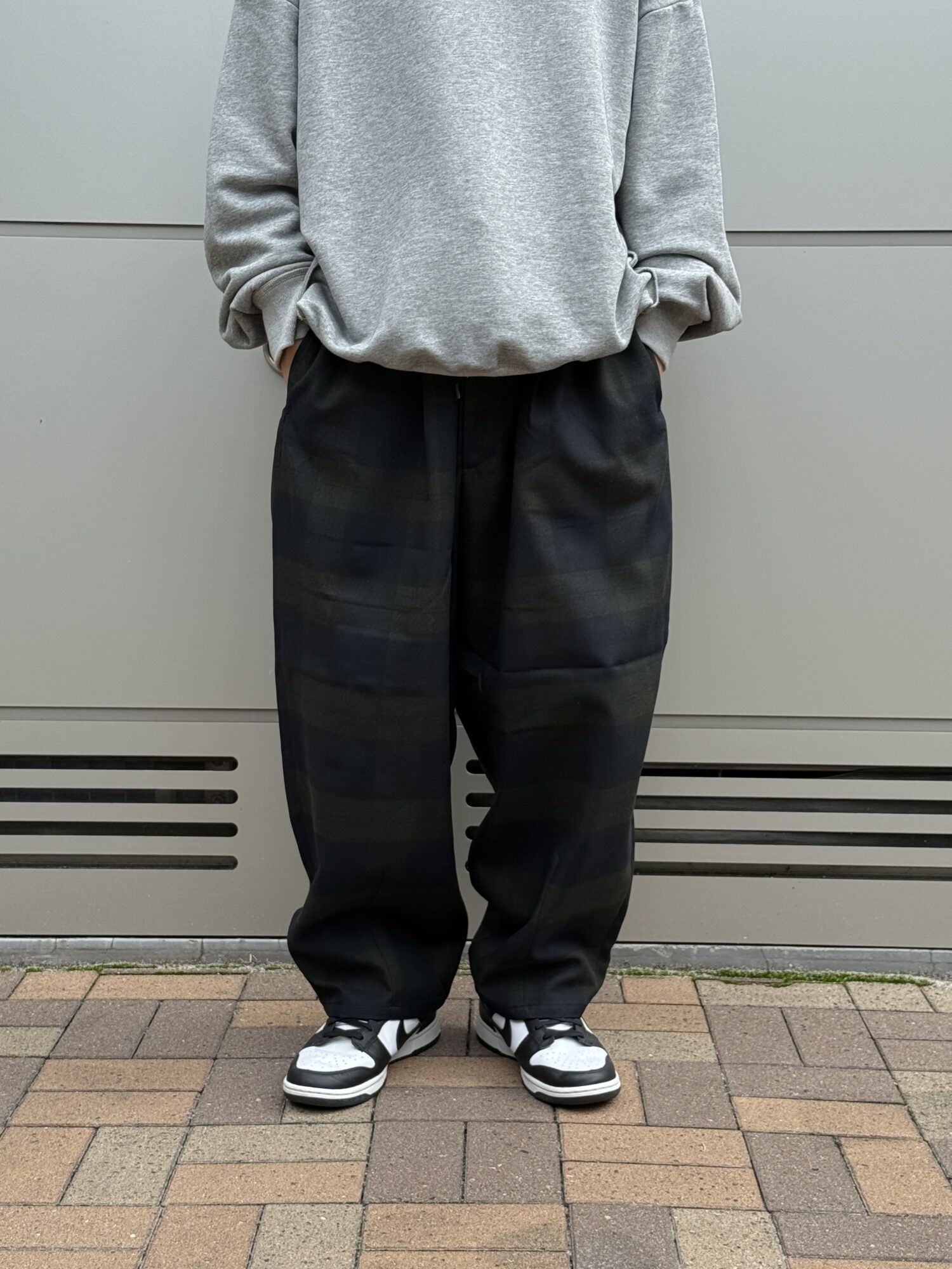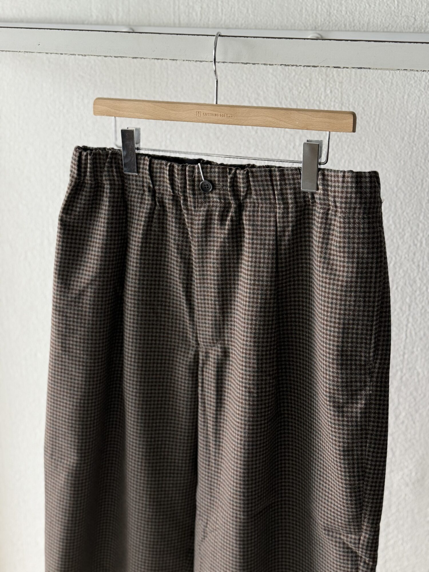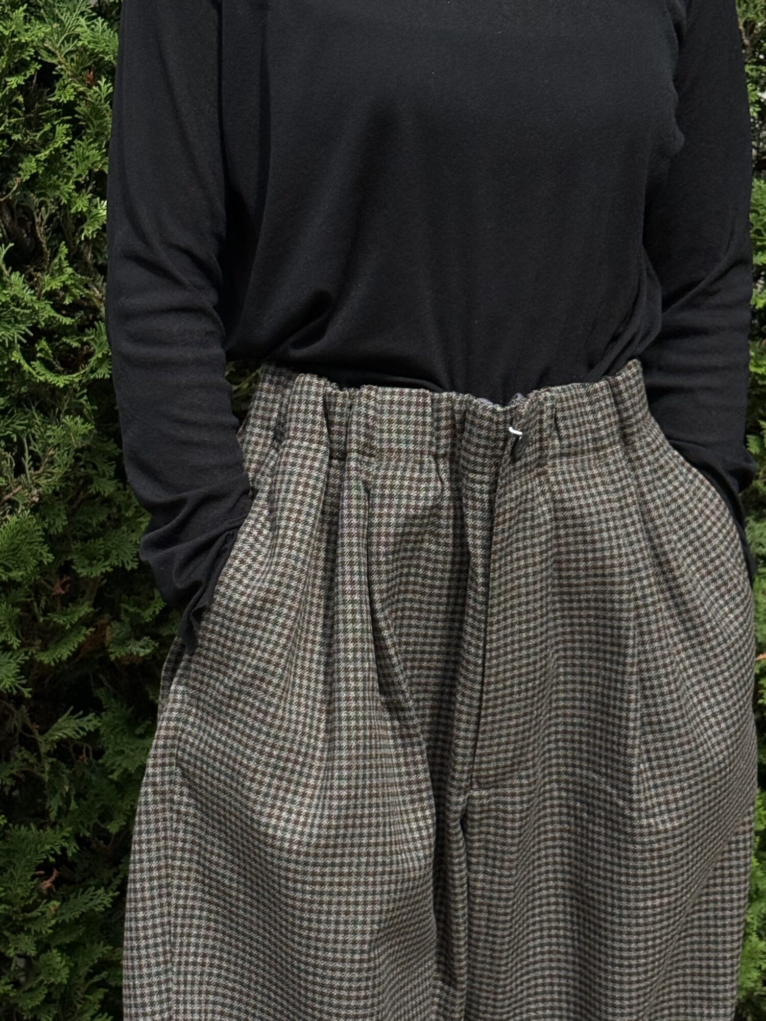 ウールの産地、尾州産のポリエステル100%テックツイードを使⽤したダーツパンツ。 シワになりにくく、イージーケアのパンツ。バルキー感のある⽴体的なデザイン