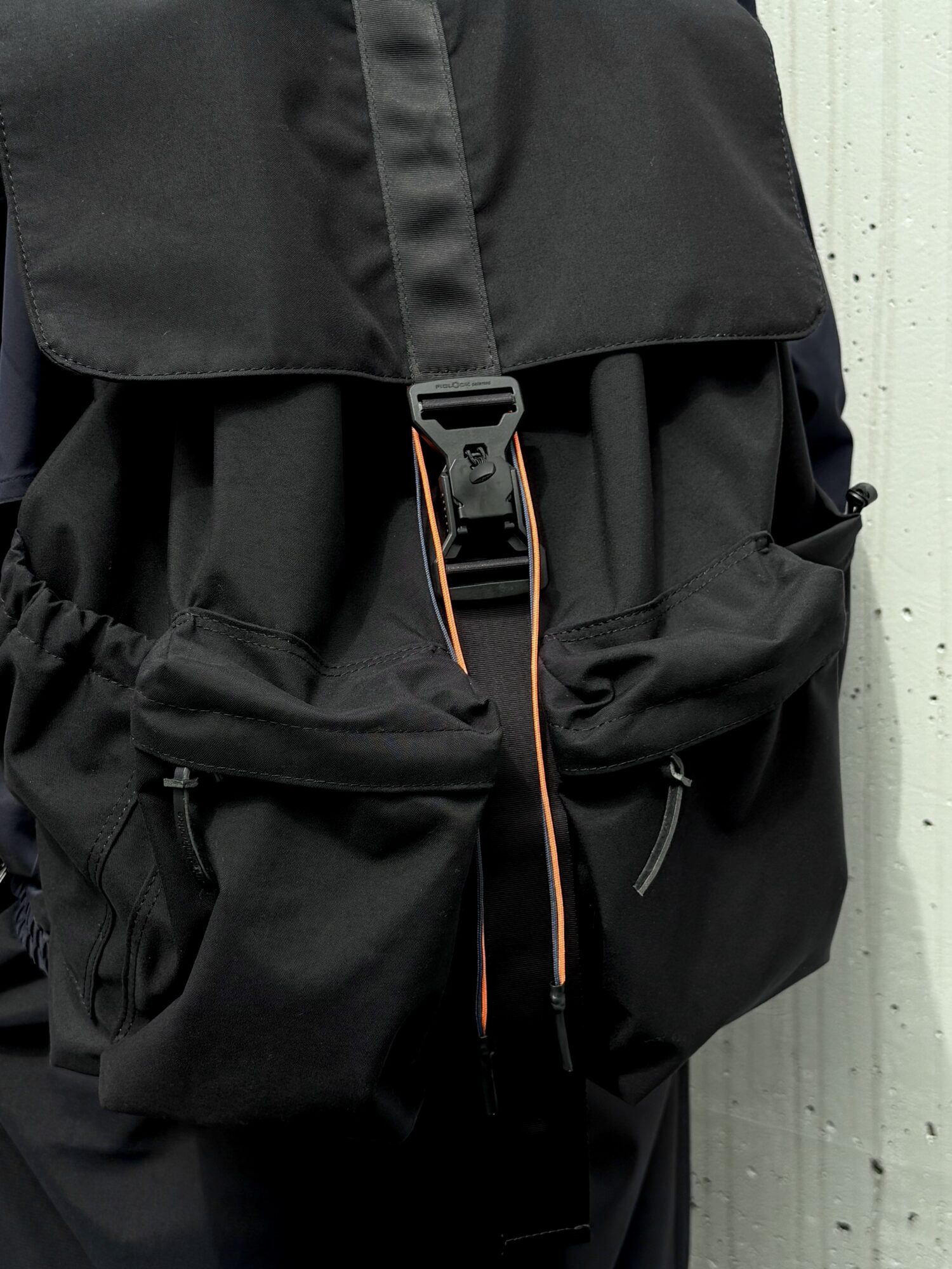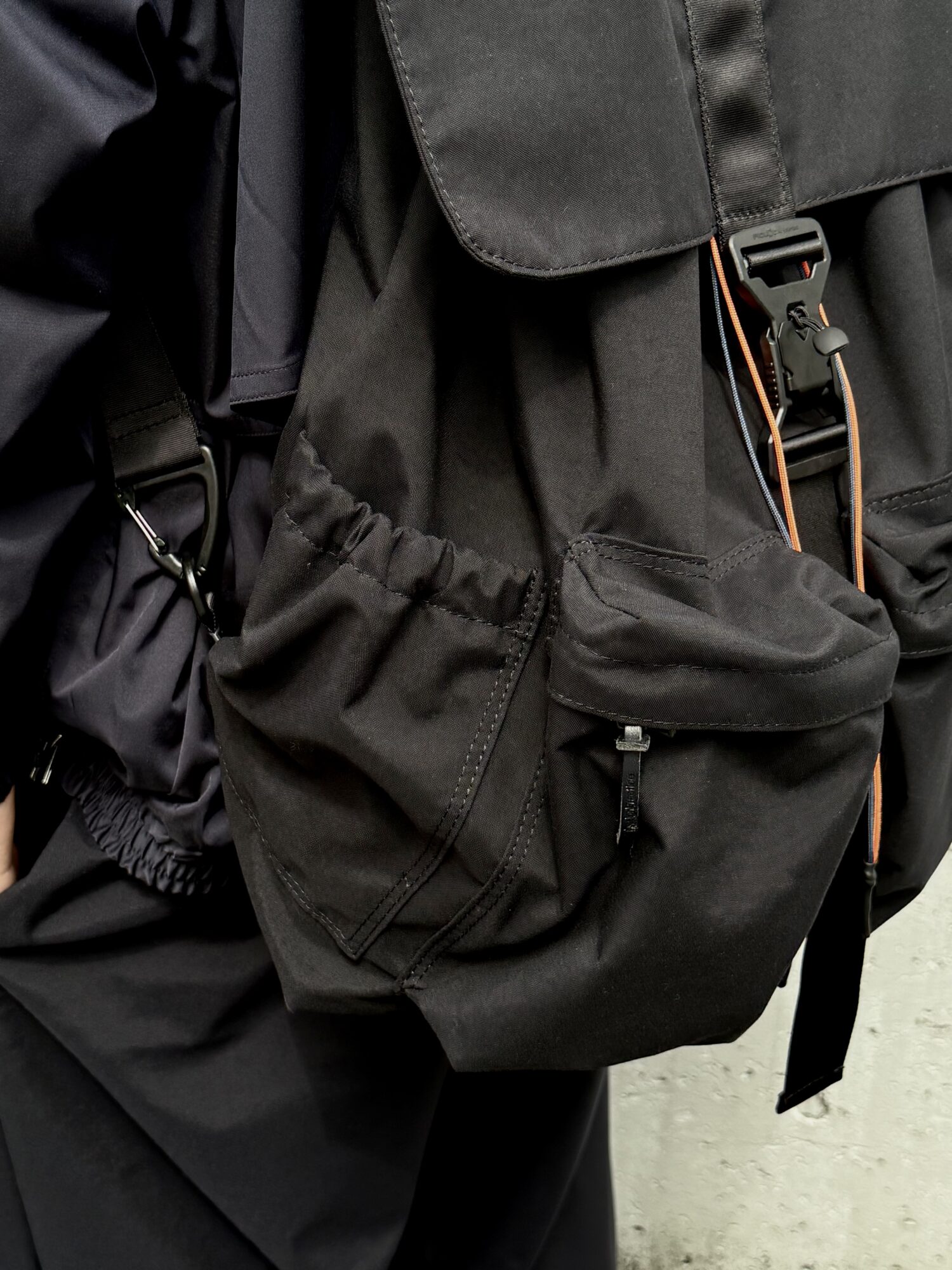 外側には大容量のマチ付きポケットを配置し、両サイドにはボトルホルダーを搭載。