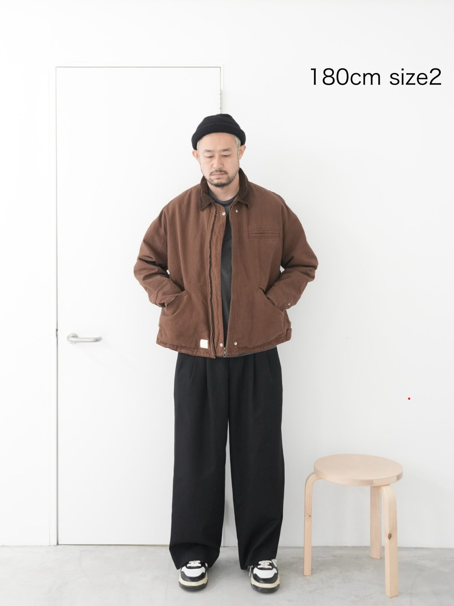 某ワークウェアブランドの代表的モデルへのオマー ジュとしてデザインしたジャケット。シルエットやボ リューム感を調整しつつ、前開き部分には持ち出しを 追加することで機能性を向上させました。身頃裏にオ リジナルのキュプラ素材のひょうたんキルト、袖裏に はダイヤモンドキルティング生地を使用し、保温性と 快適さを両立。襟部分には14AWコーデュロイ生地を採 用しました。ワークスタイルに忠実なディティールも 持ち合わせながら、ざっくりとしたサイズ感と染色加 工による独特な風合いが合わさることで、昔ながらの 雰囲気を醸し出しています。表地には10オックスの オーガニックコットンを使用。従来のダック素材より 一段軽くし、軽やかなアウターに仕上げています。洗 いざらし感や加工感が際立つ素材を選定しているた め、表情豊かなアイテムに仕上がっています。Natural は洗いざらしの生成り、染色加工にはPinkは茜、 Brownは柿渋、Sumikuroは備⻑炭から染料を抽出しボ タニカルハイブリッド染を施しています。