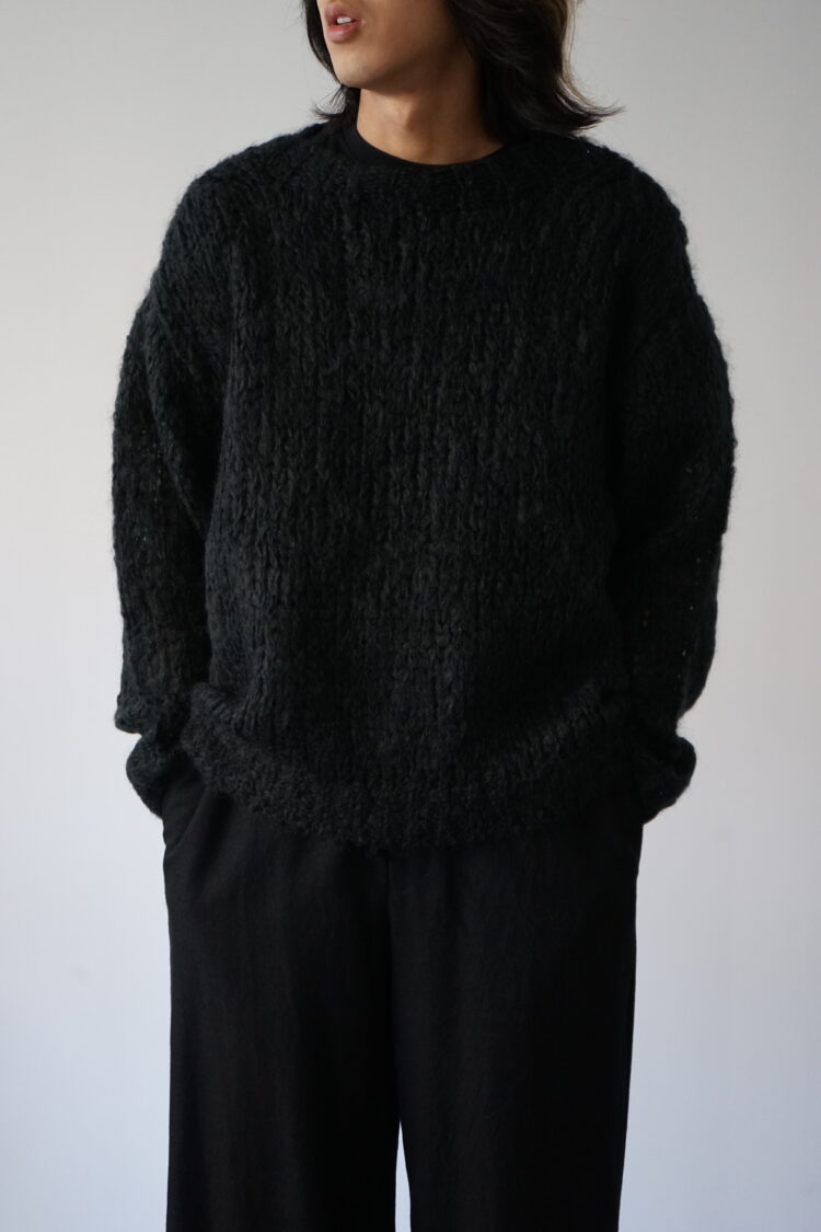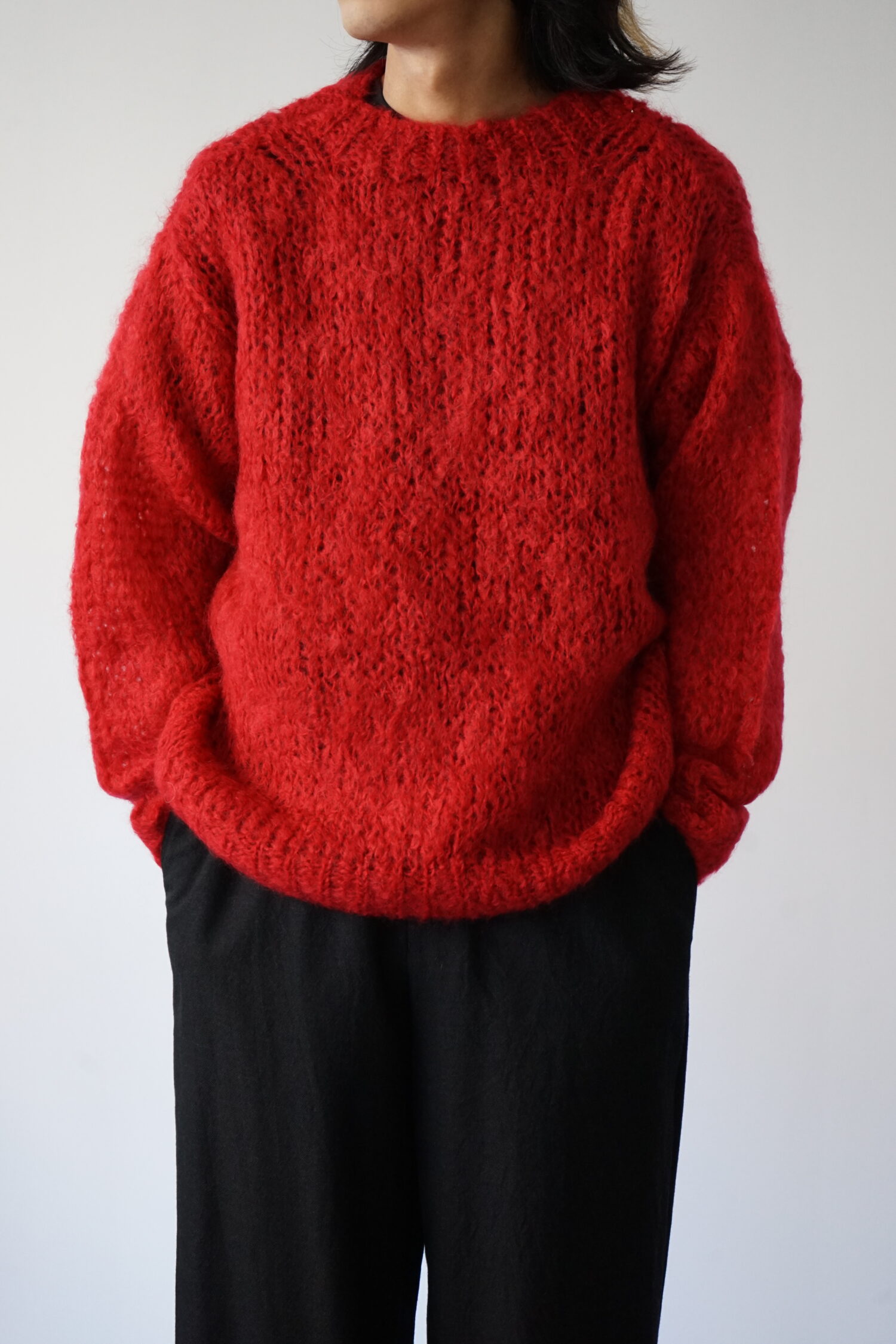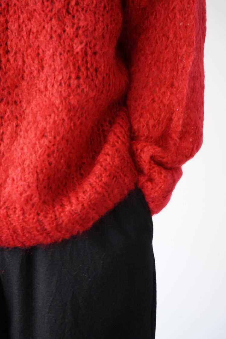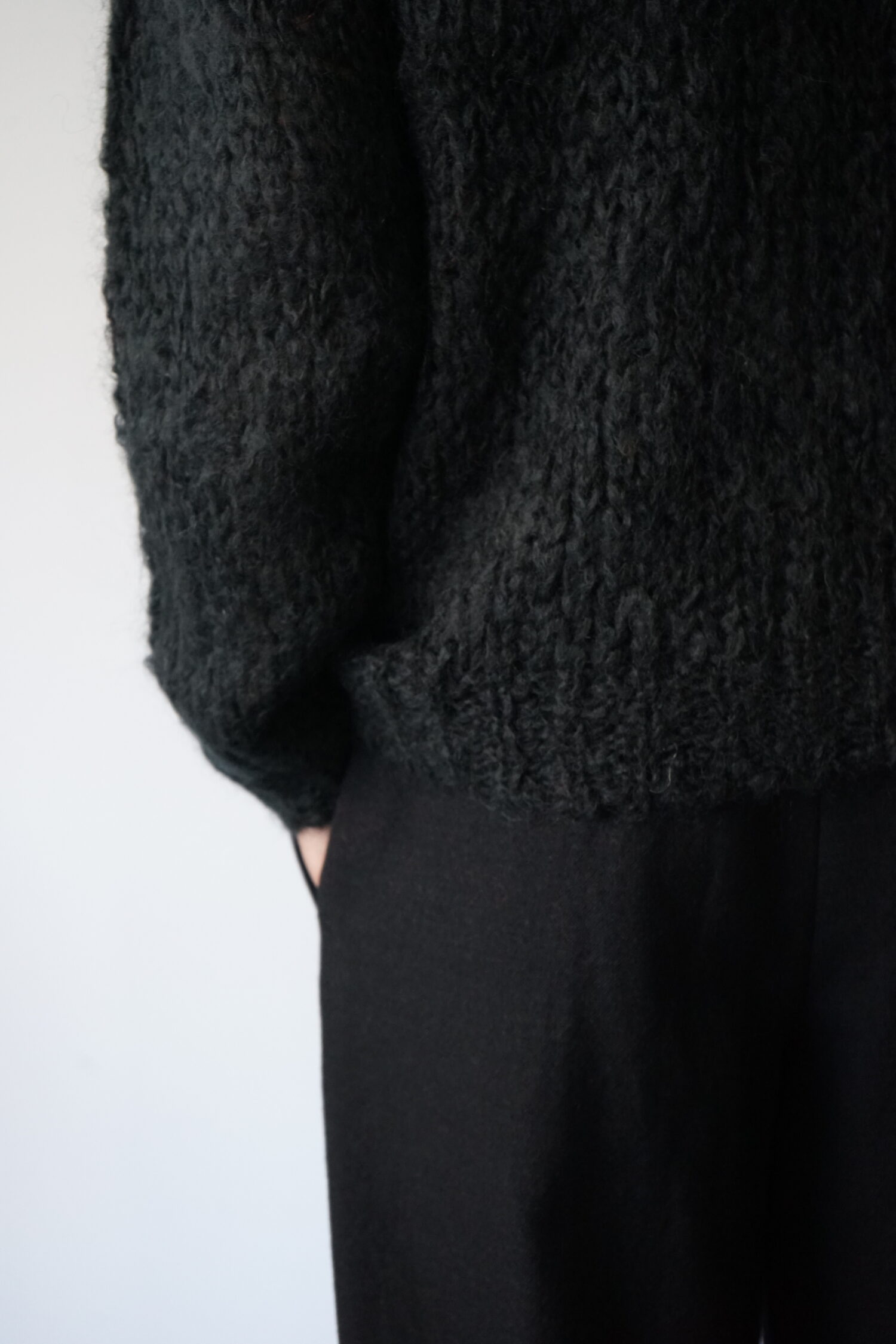 "73% MOHIAR 27% WOOL (生地の特徴) 芯糸にウールを使ったモヘア起毛糸です。 起毛のムラやウールとモヘアの素材違いによる色差、フラットな編み方をしても編み目の凹凸感が出る素材です。 手編みで編むような糸番手ですが機械編みしています。日本ではほとんど無い手横という人の手で動かす編み機で製作しました。 ローゲージのニット製品ですが、程よい厚みと軽量感ある上がりになっています。"