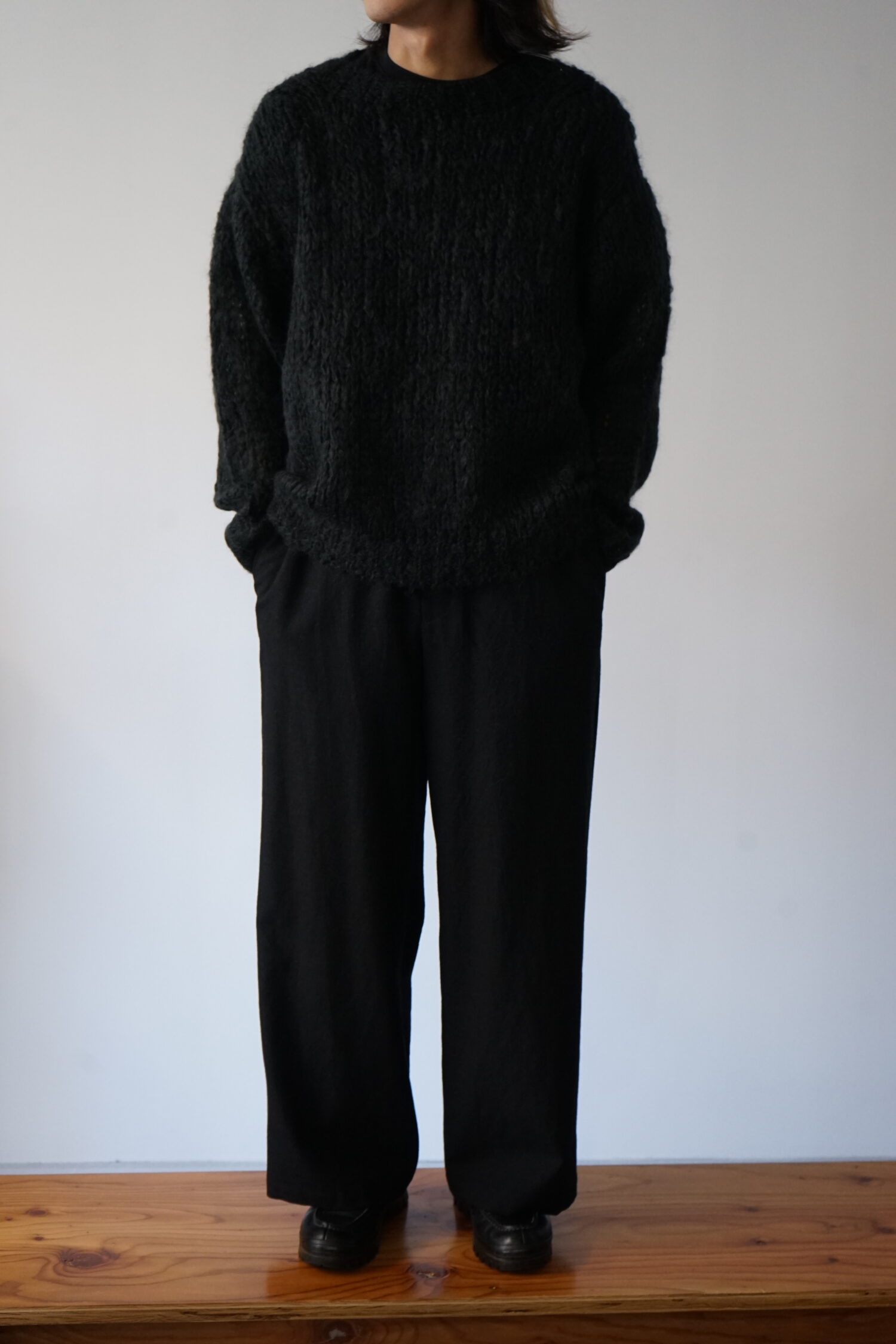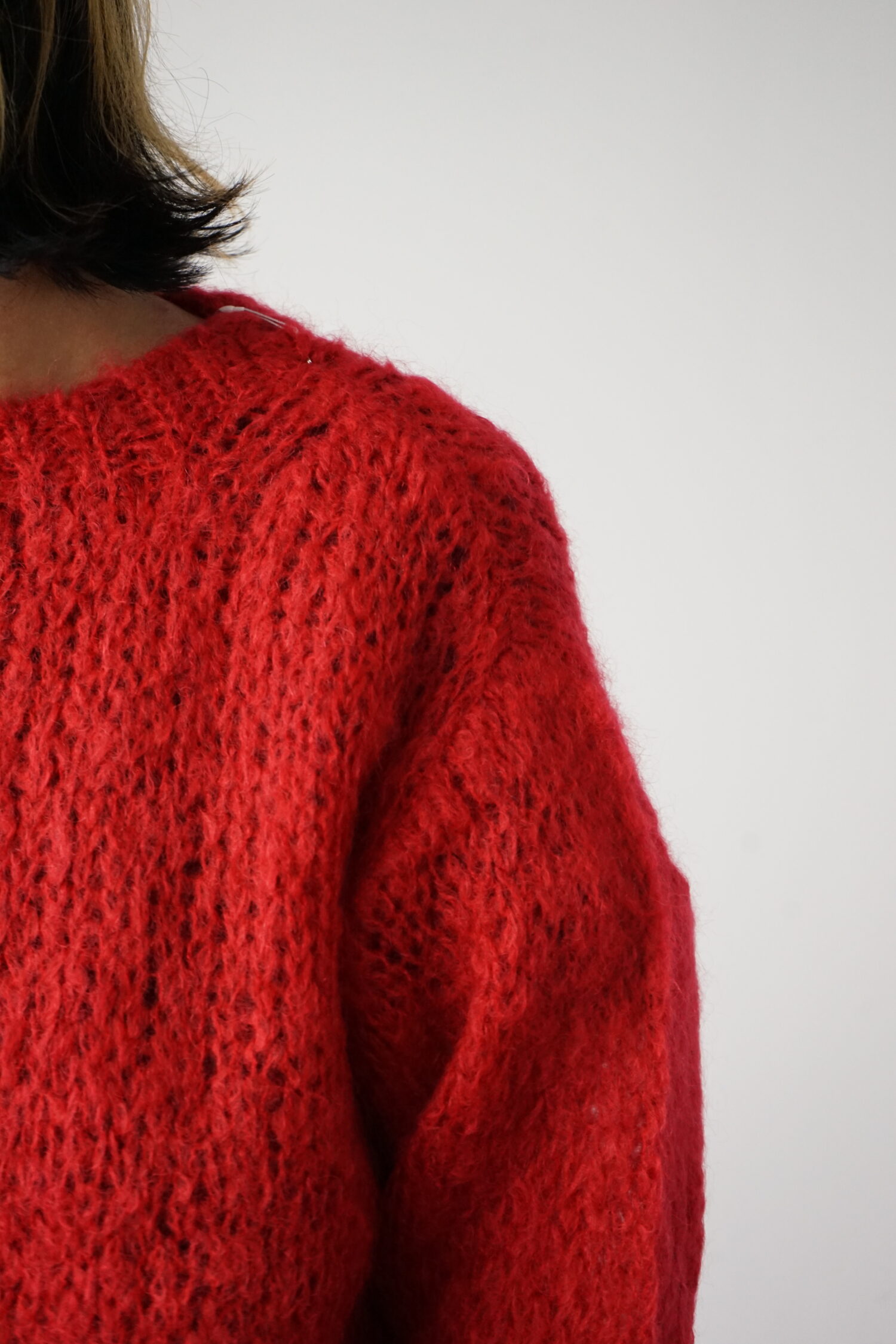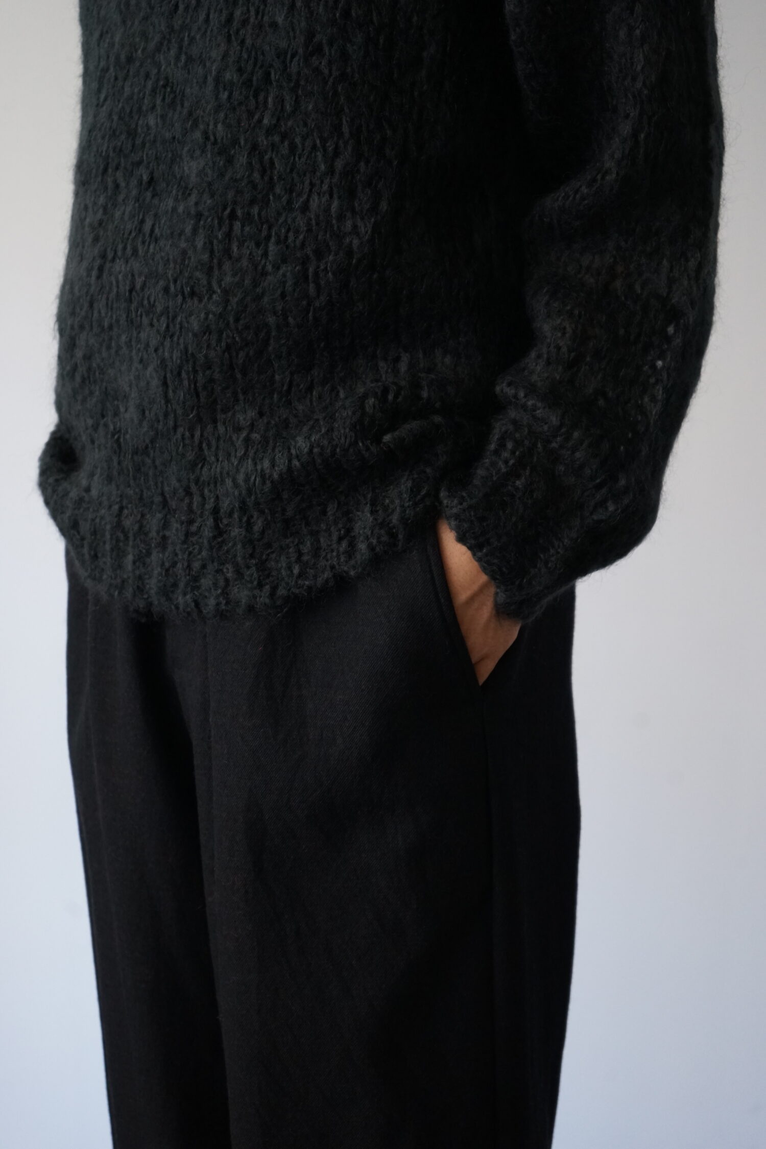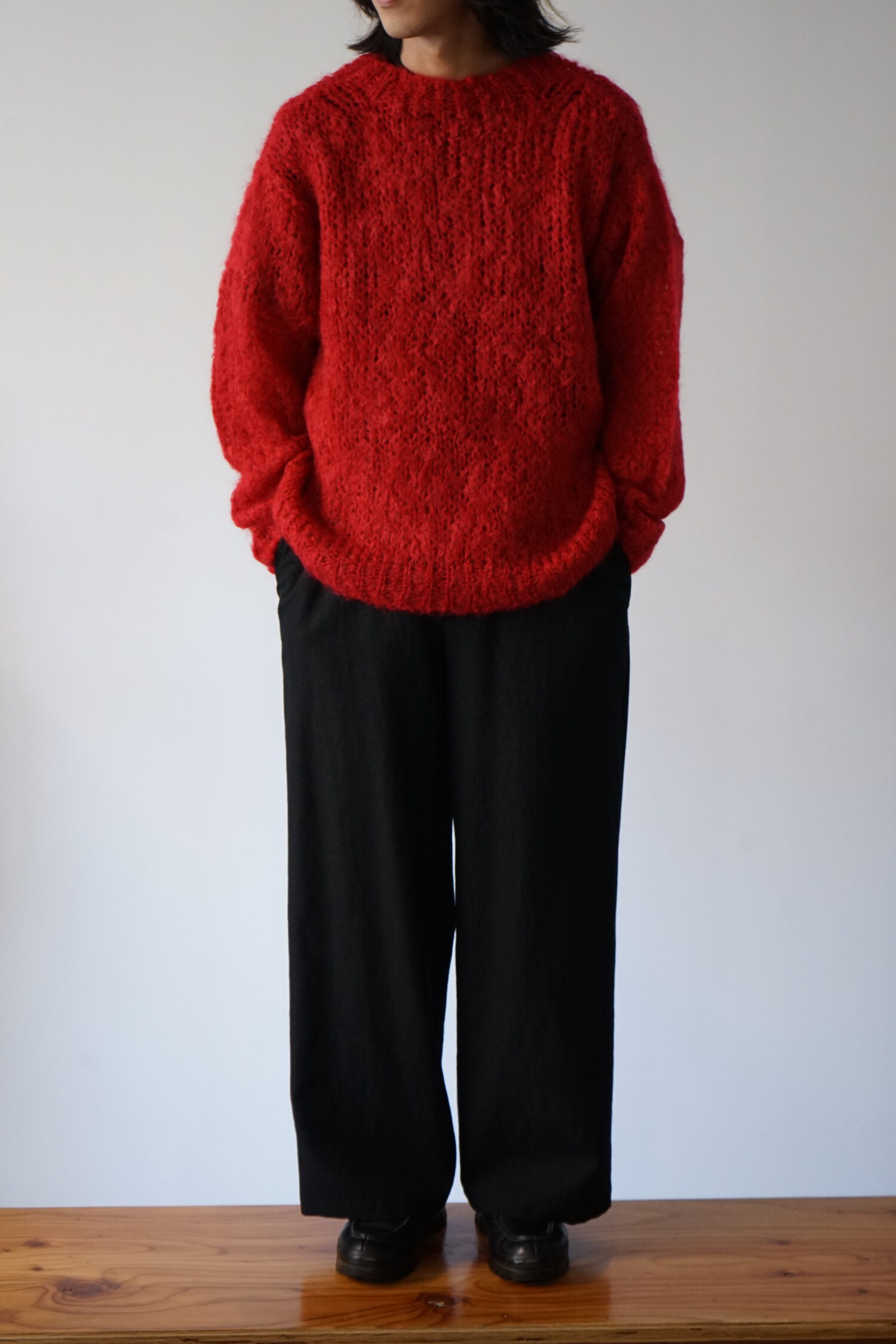 "73% MOHIAR 27% WOOL (生地の特徴) 芯糸にウールを使ったモヘア起毛糸です。 起毛のムラやウールとモヘアの素材違いによる色差、フラットな編み方をしても編み目の凹凸感が出る素材です。 手編みで編むような糸番手ですが機械編みしています。日本ではほとんど無い手横という人の手で動かす編み機で製作しました。 ローゲージのニット製品ですが、程よい厚みと軽量感ある上がりになっています。"